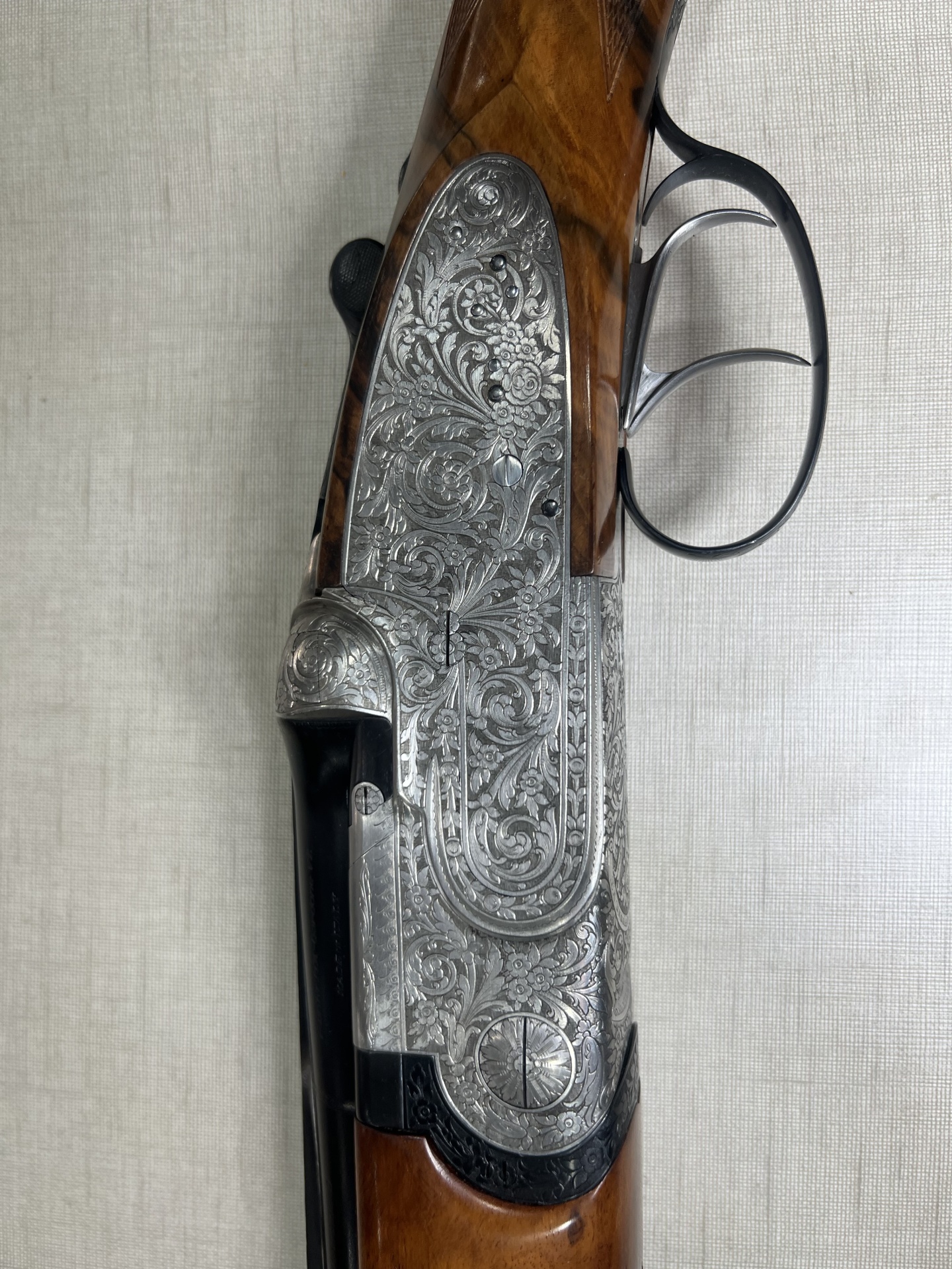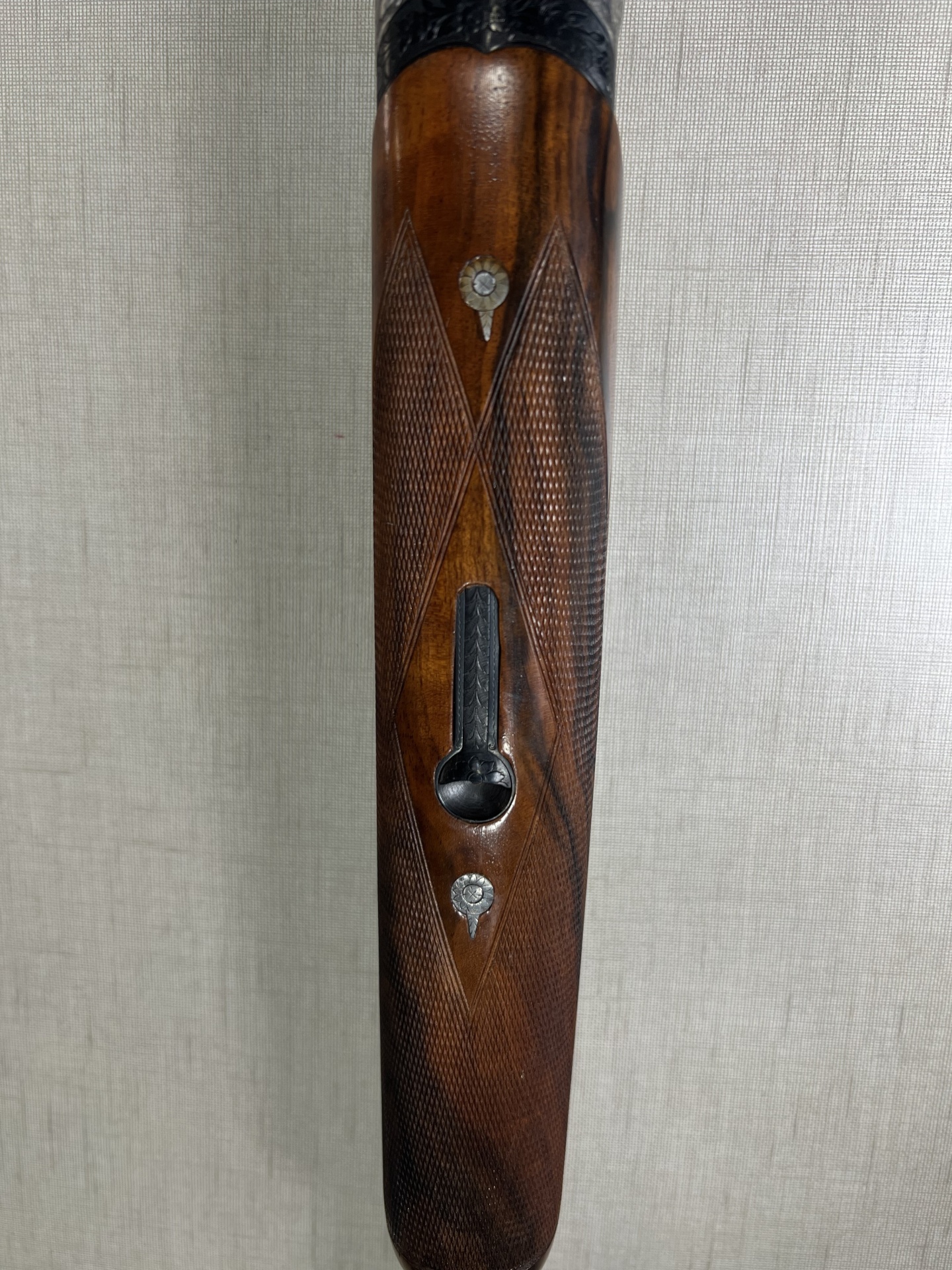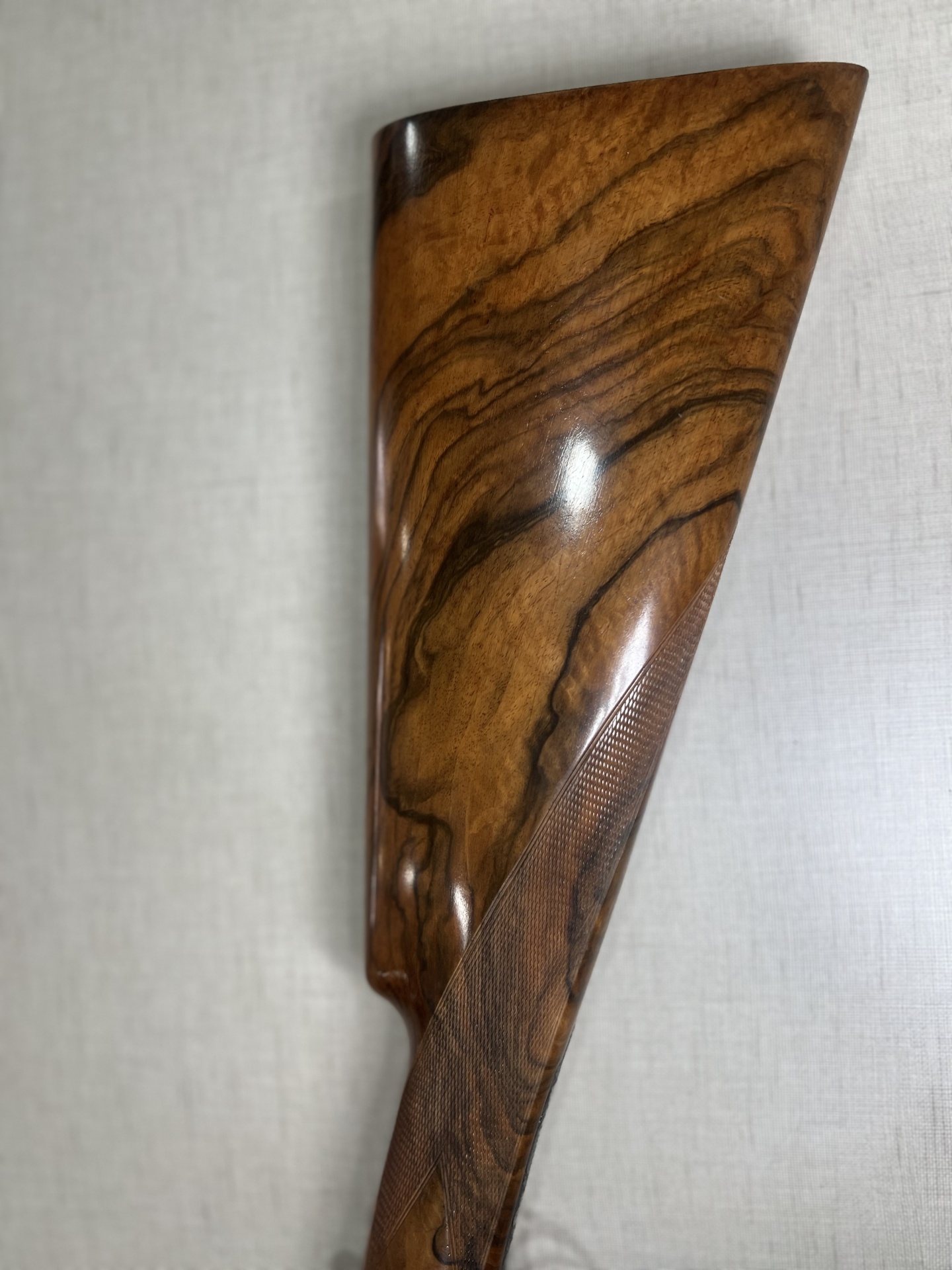 Espingarda de canos duplos com madeira castanha polida e corpo metálico prateado