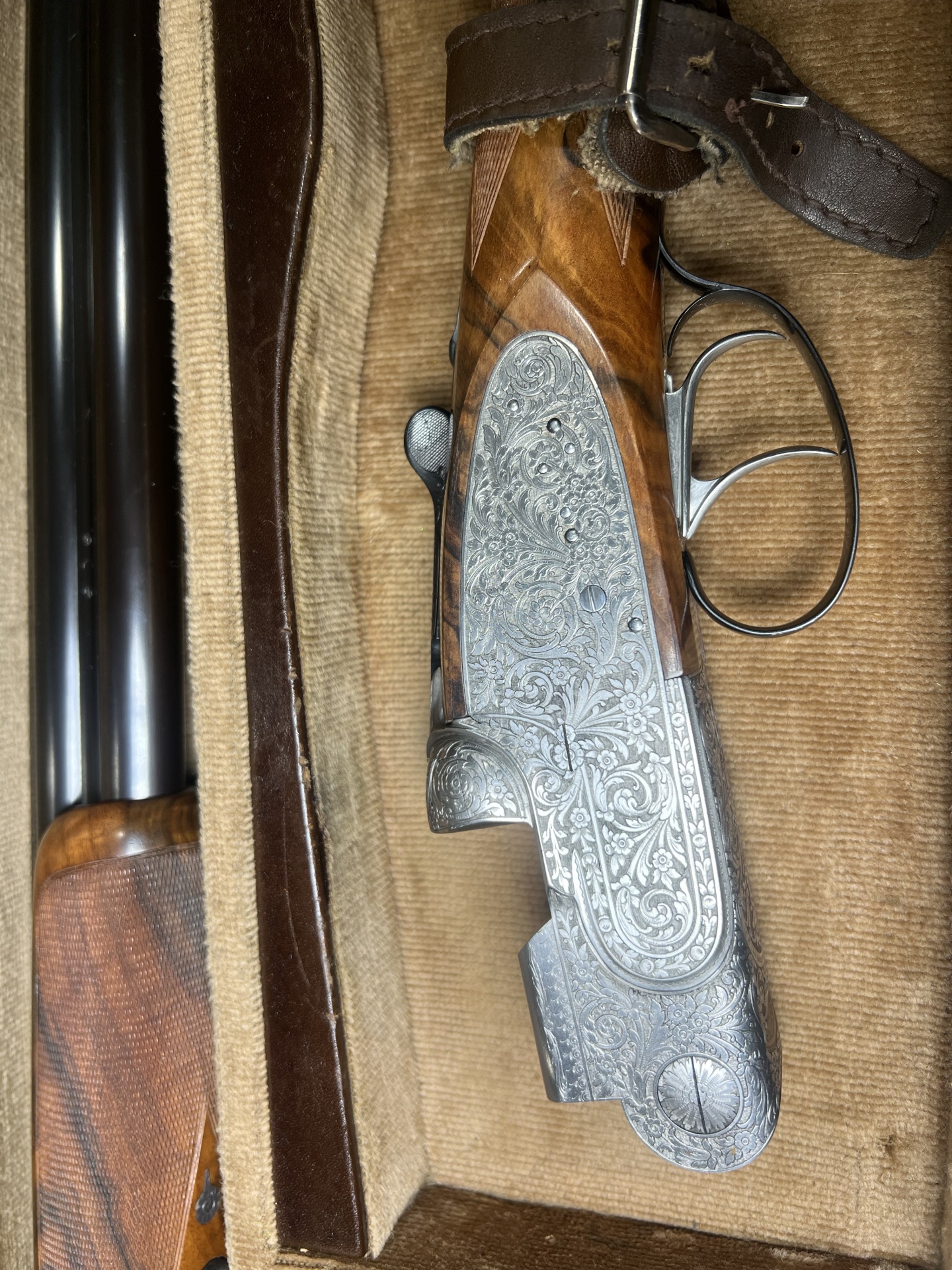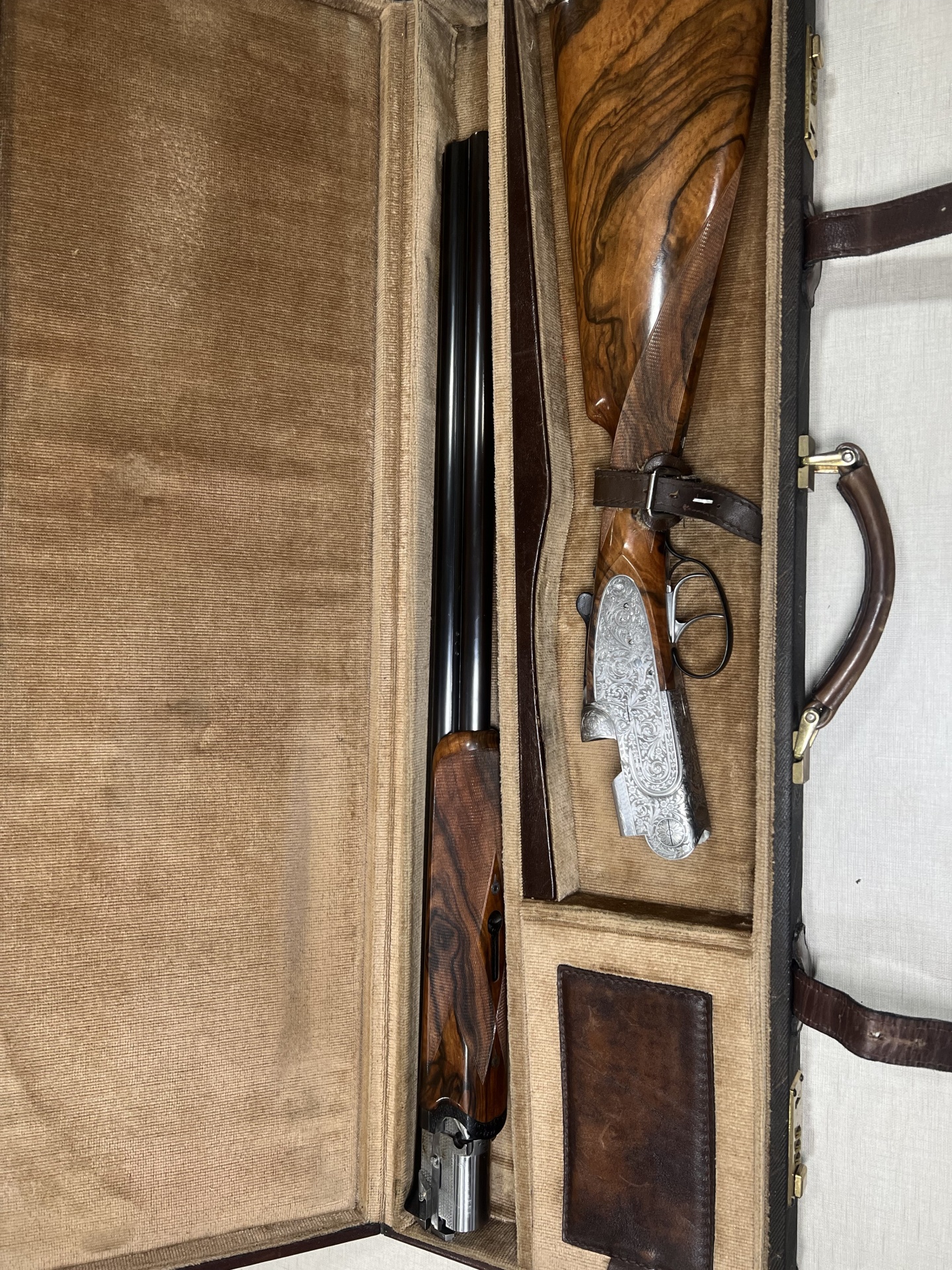 Estojo com espingarda de caça e acessórios em veludo e couro