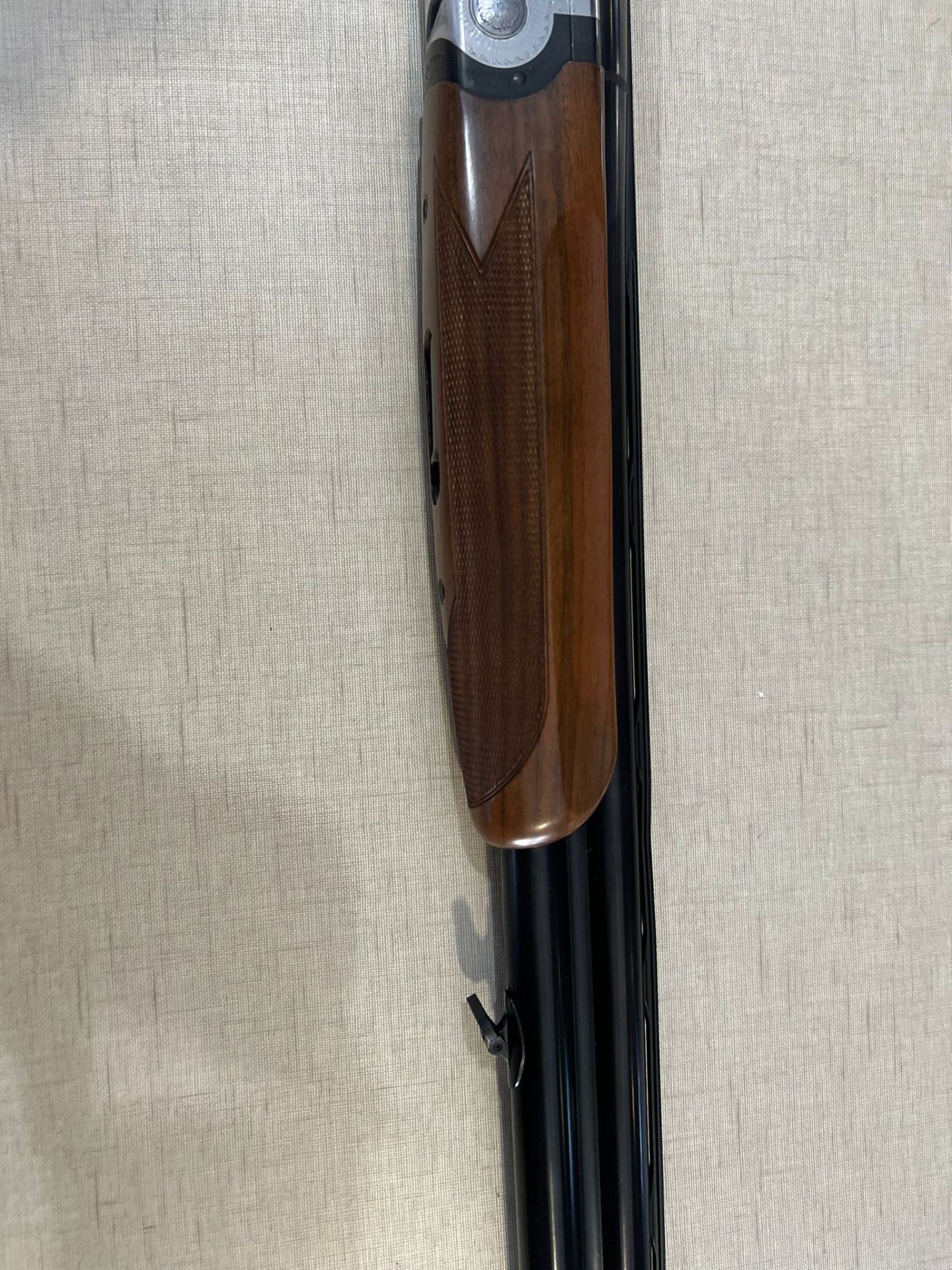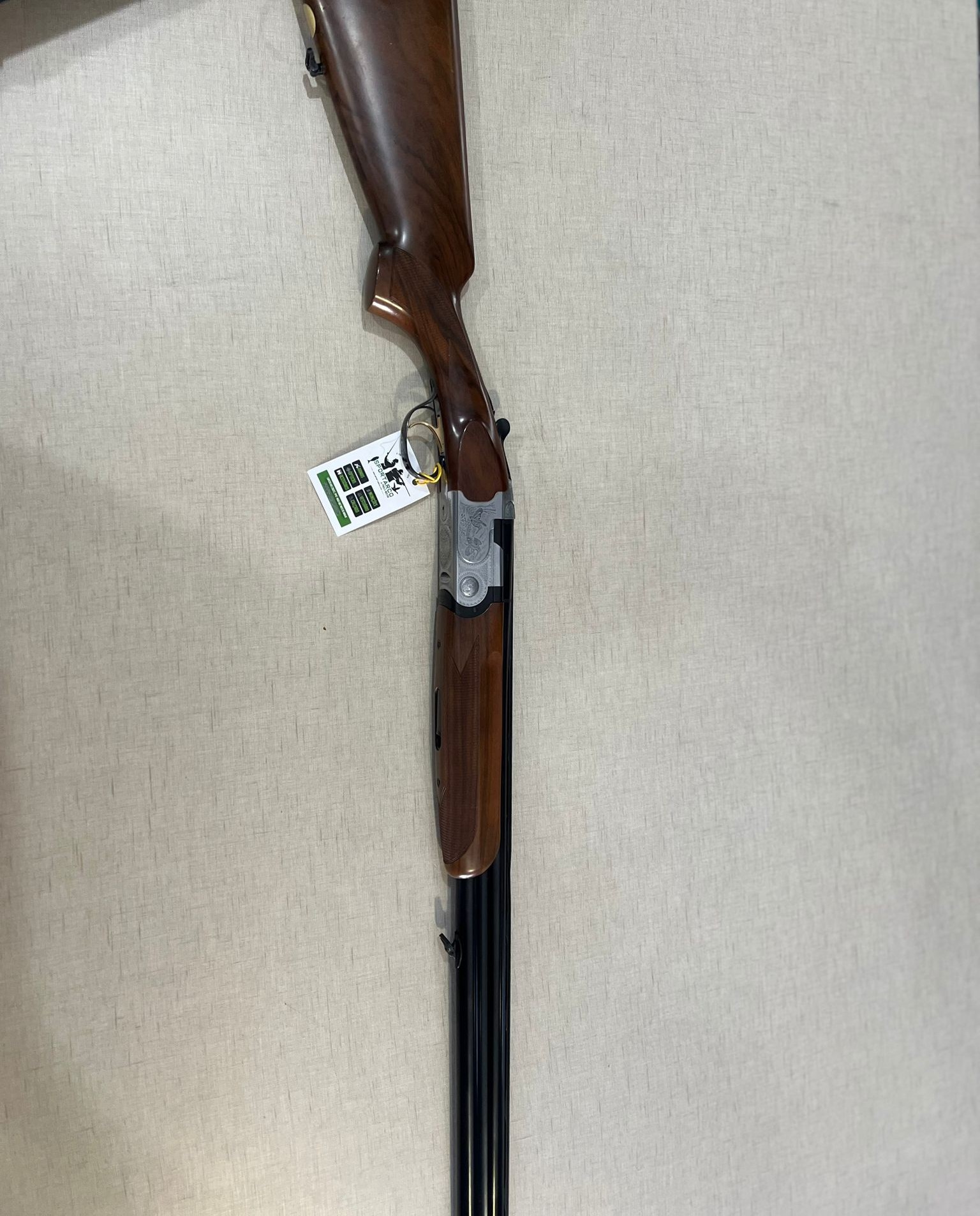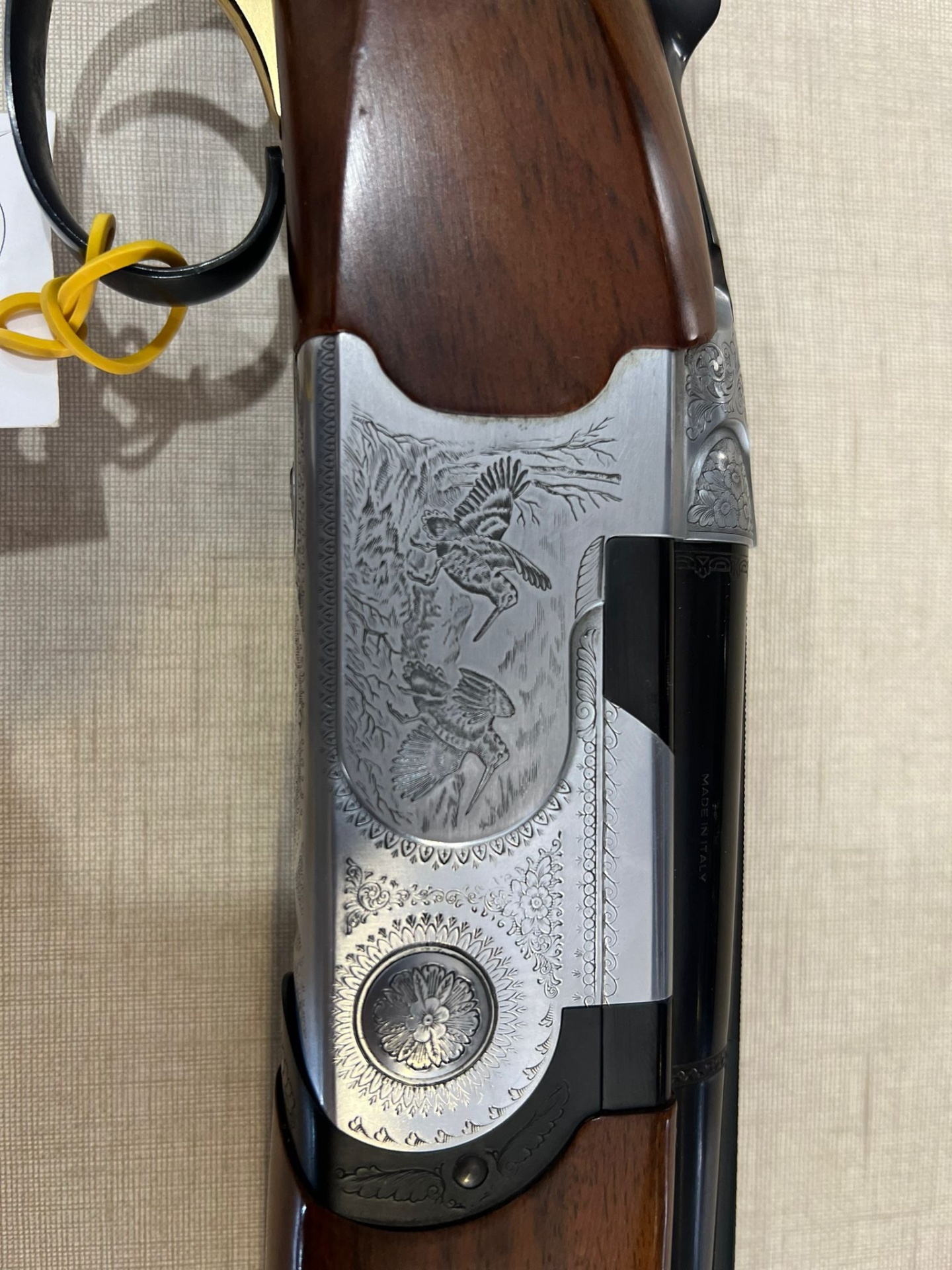 Espingarda com cano duplo em metal preto e empunhadura em madeira castanha texturizada