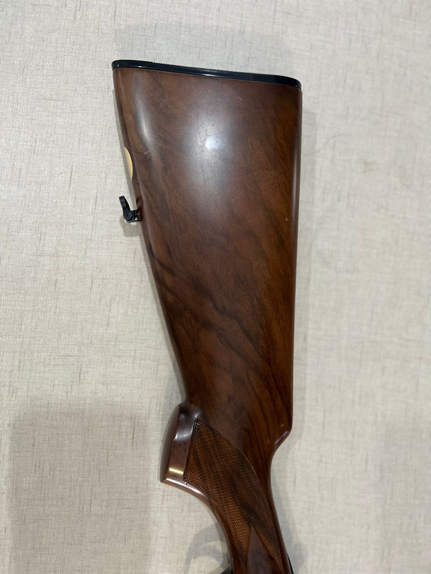 Espingarda com coronha de madeira castanha e caixa metálica prateada com gravações