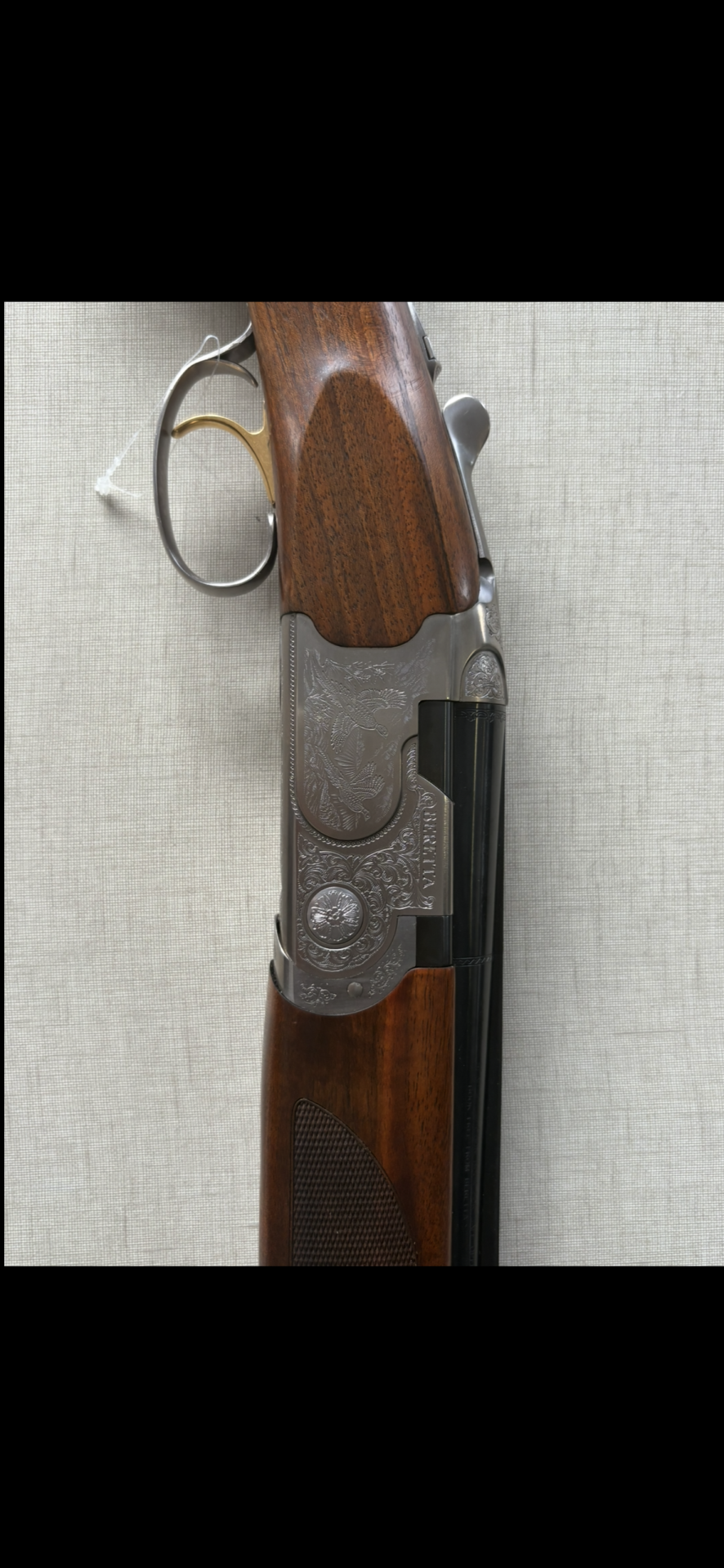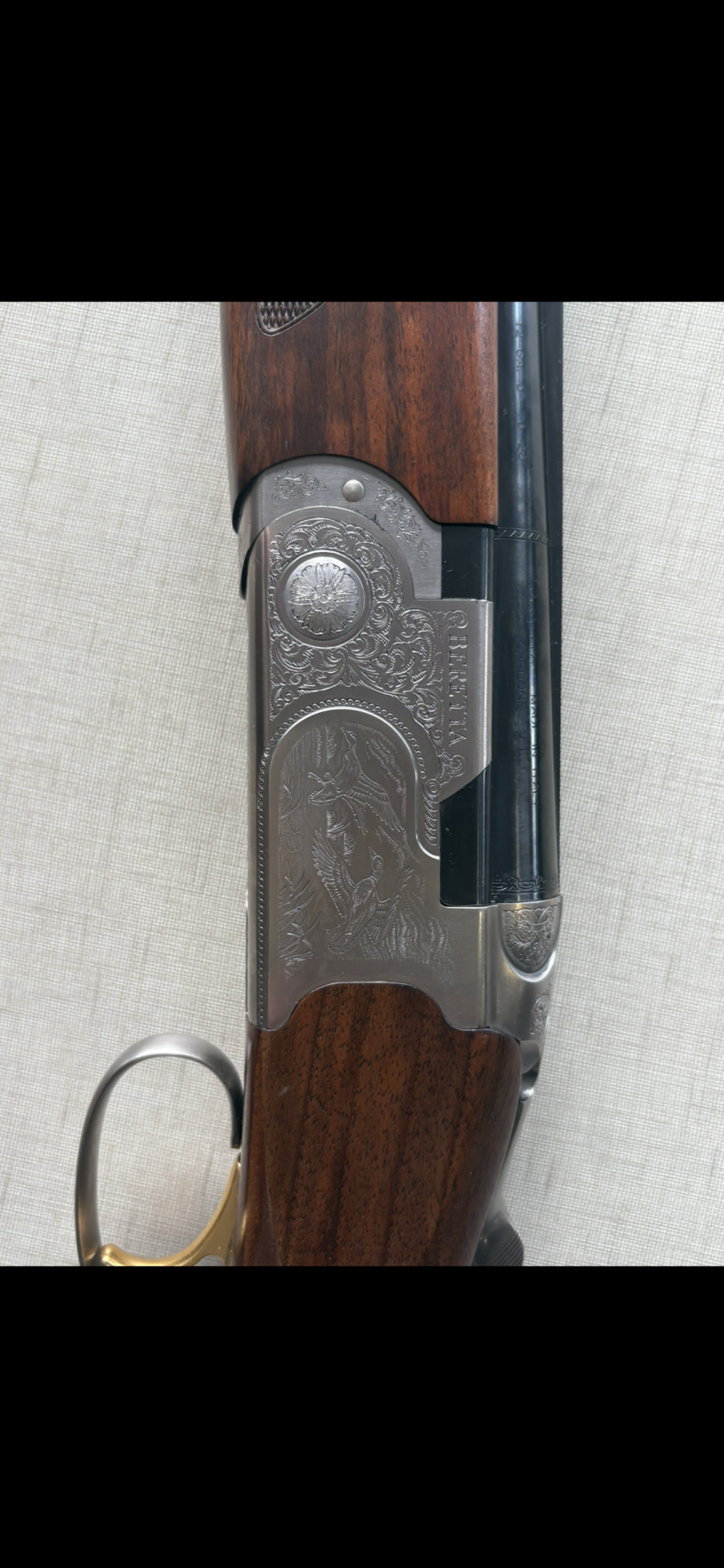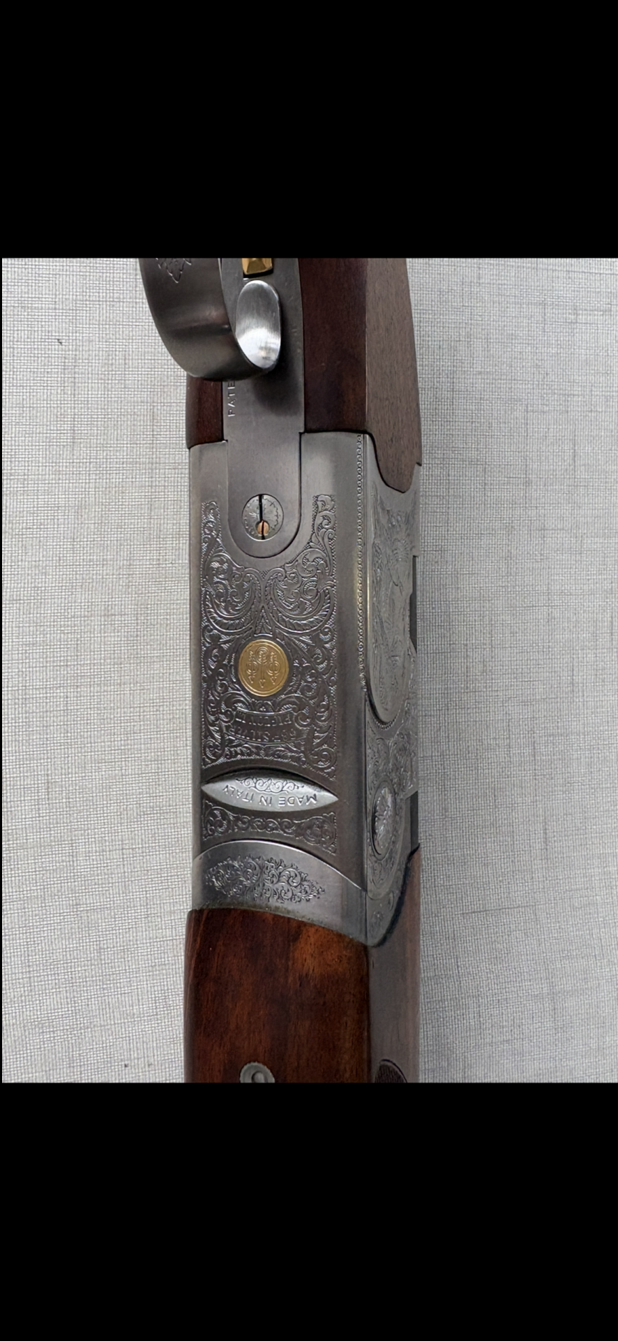Espingarda Beretta com madeira castanha e detalhes gravados em metal prateado
