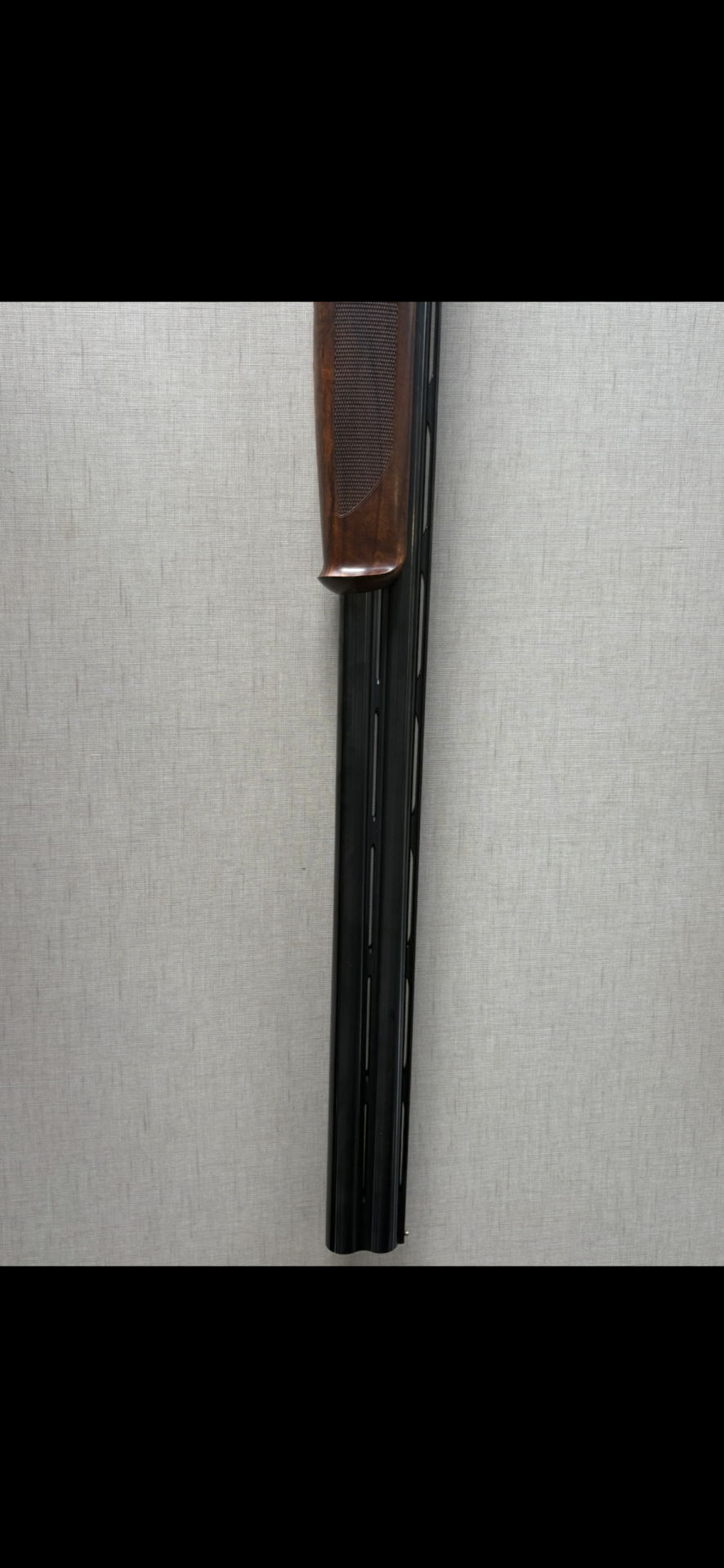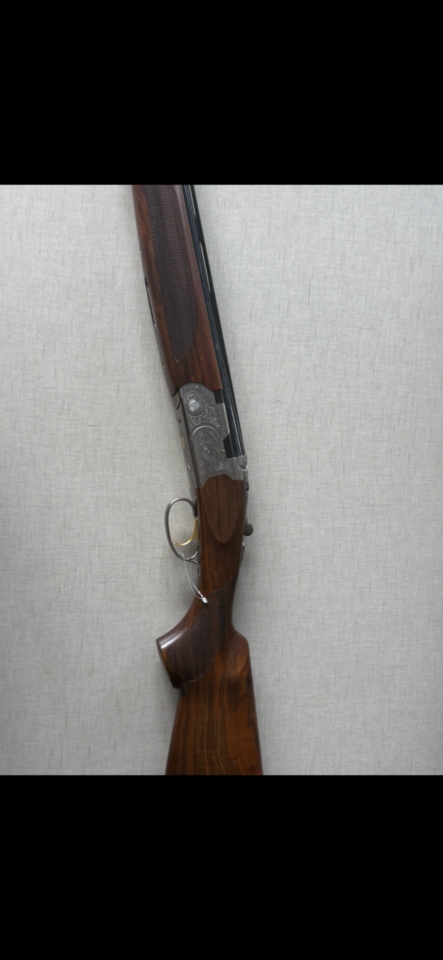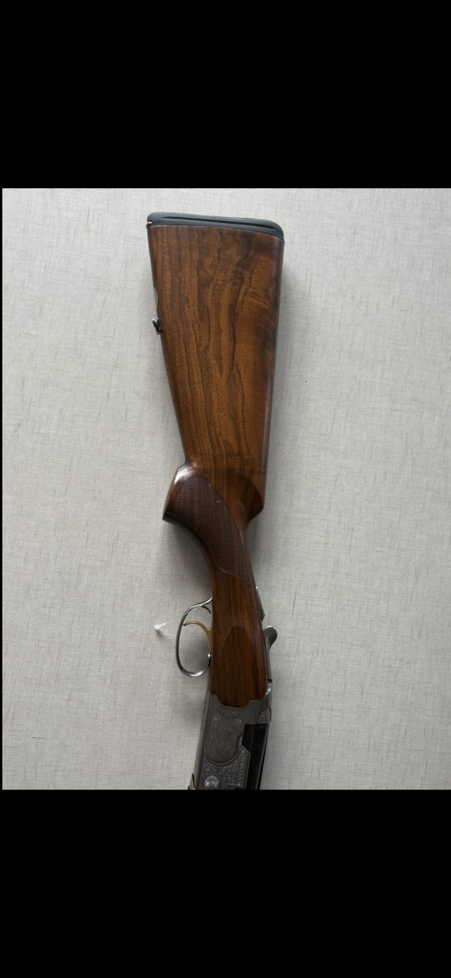 Espingarda Beretta com madeira castanha e detalhes gravados em metal prateado