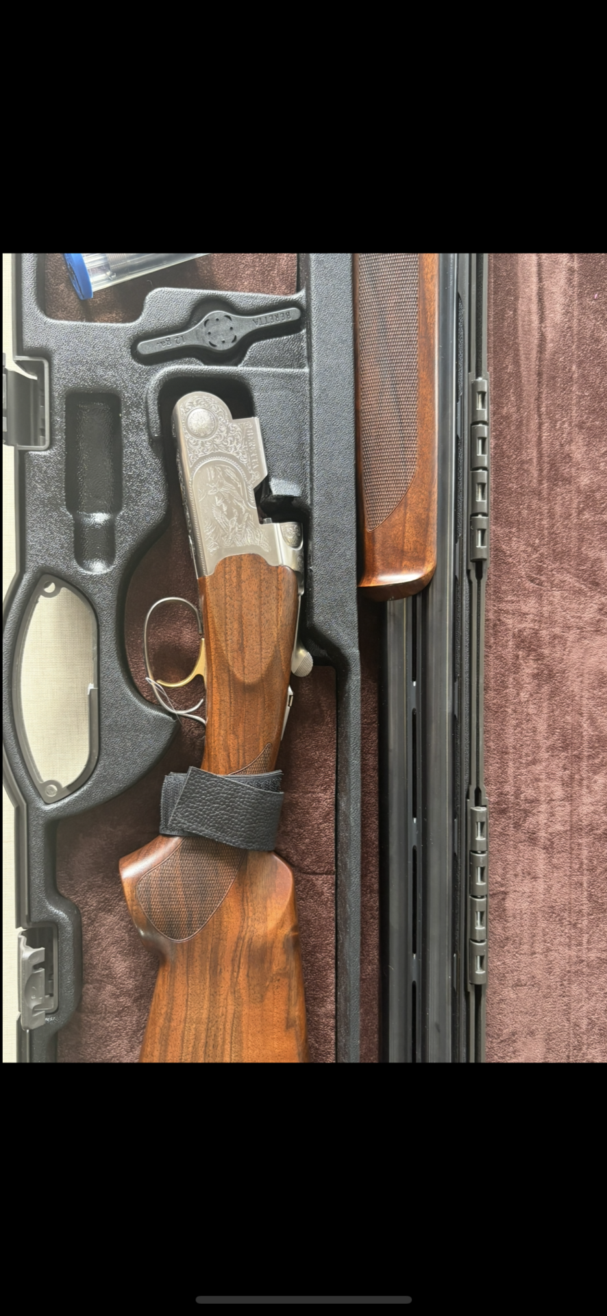 Espingarda Beretta desmontada num estojo preto aberto com veludo castanho interior e texto BERETTA