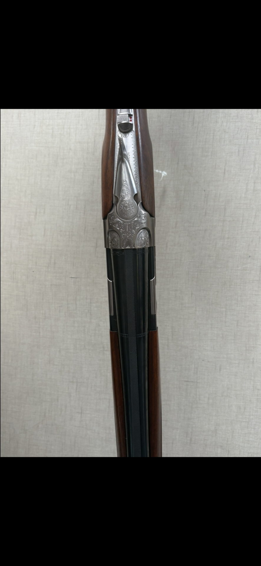 Espingarda de caça de canos duplos com madeira e metal gravado
