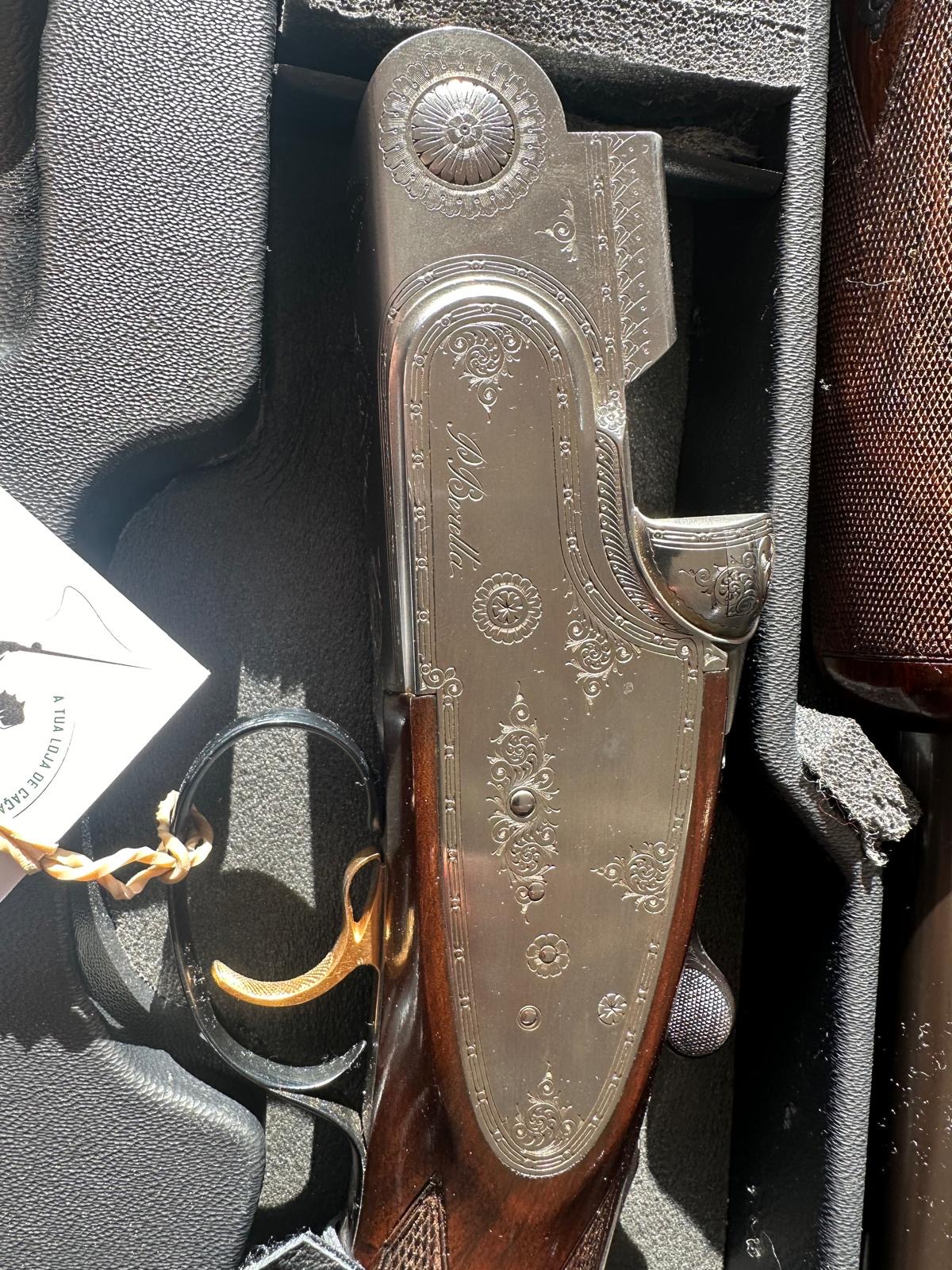 Espingarda de cano duplo com acabamento em madeira e aço decorado dentro de mala acolchoada.