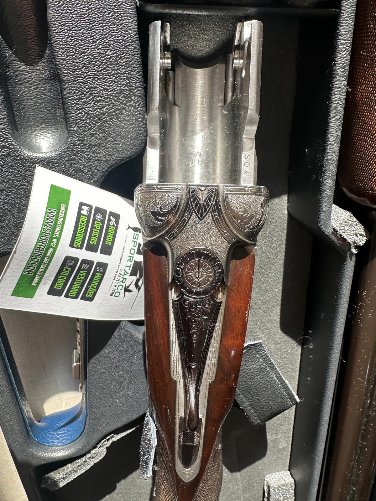 Espingarda de caça com detalhes gravados em metal e cabo de madeira num estojo de espuma preta
