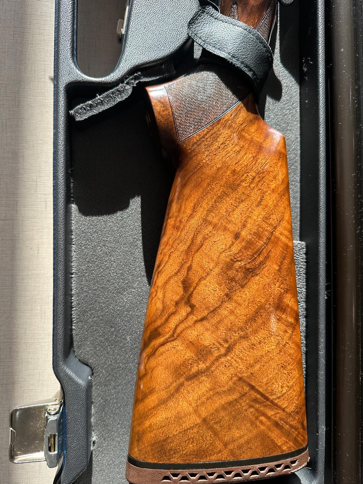 Riceira de arma de fogo em madeira polida com acabamento emborrachado, dentro de estojo preto acolchoado