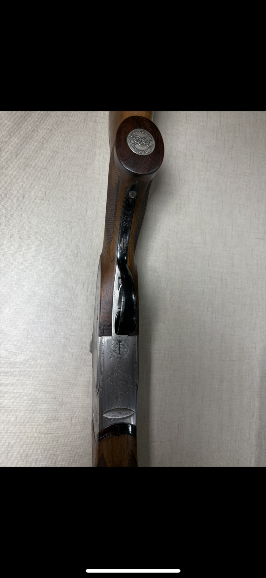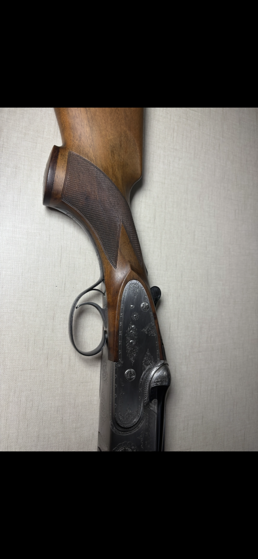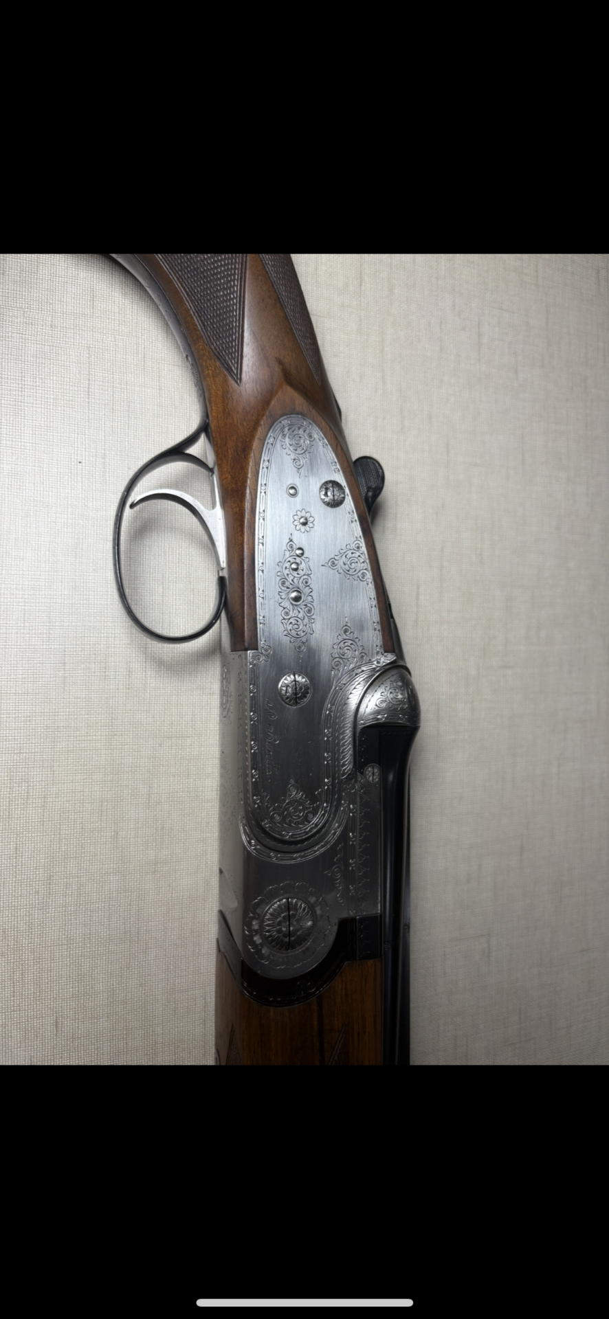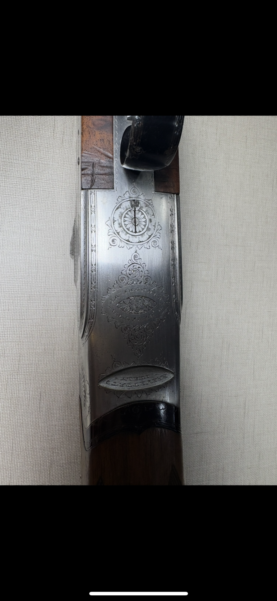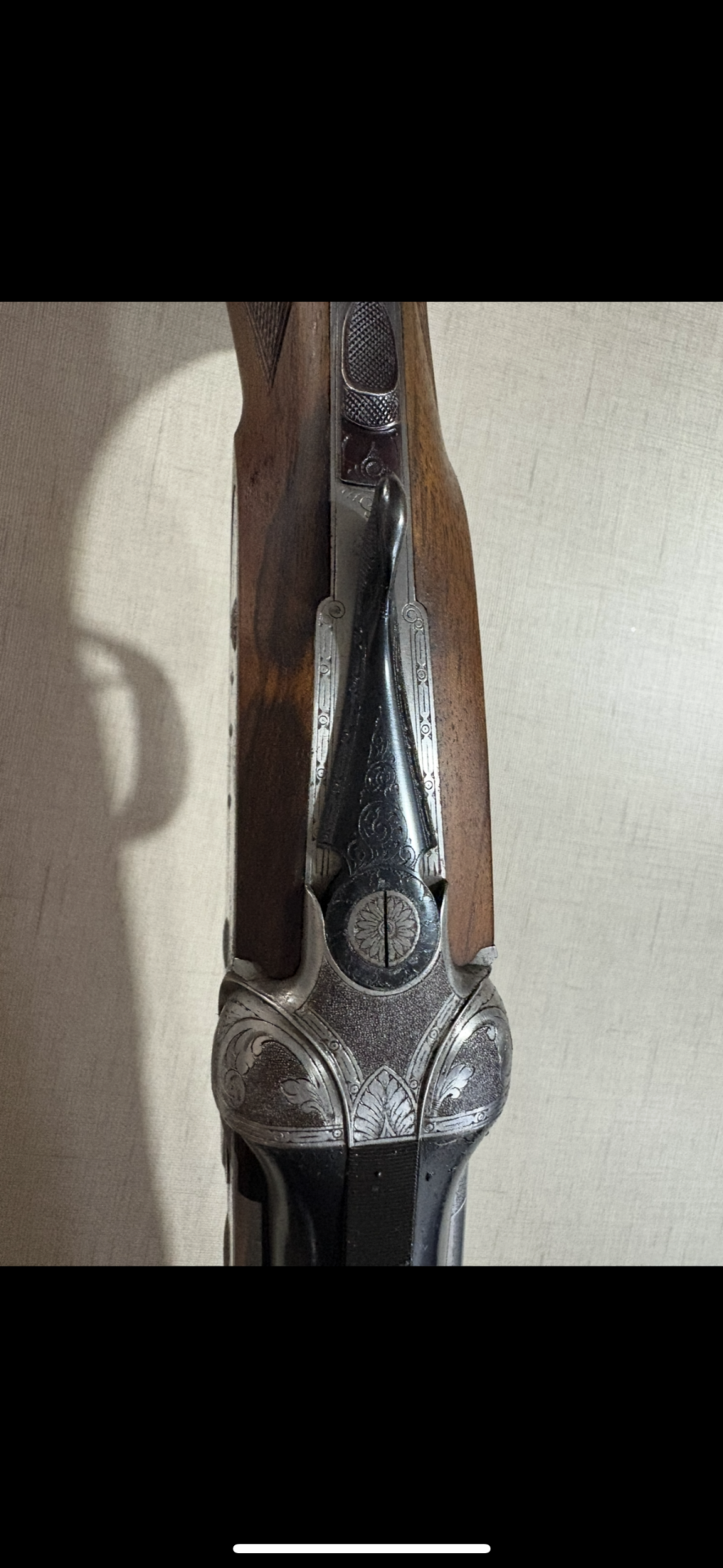 Parte superior de espingarda com metal gravado em prateado e madeira castanha