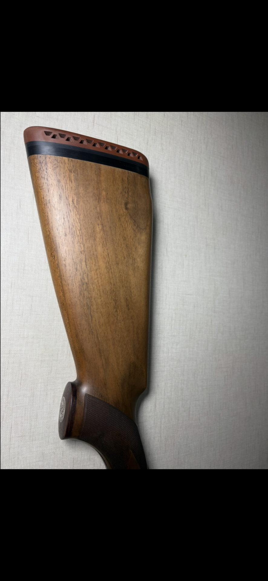 Espaçado estampilhado coronha de madeira de espingarda com acabamento em preto e detalhe recortado em madeira castanha