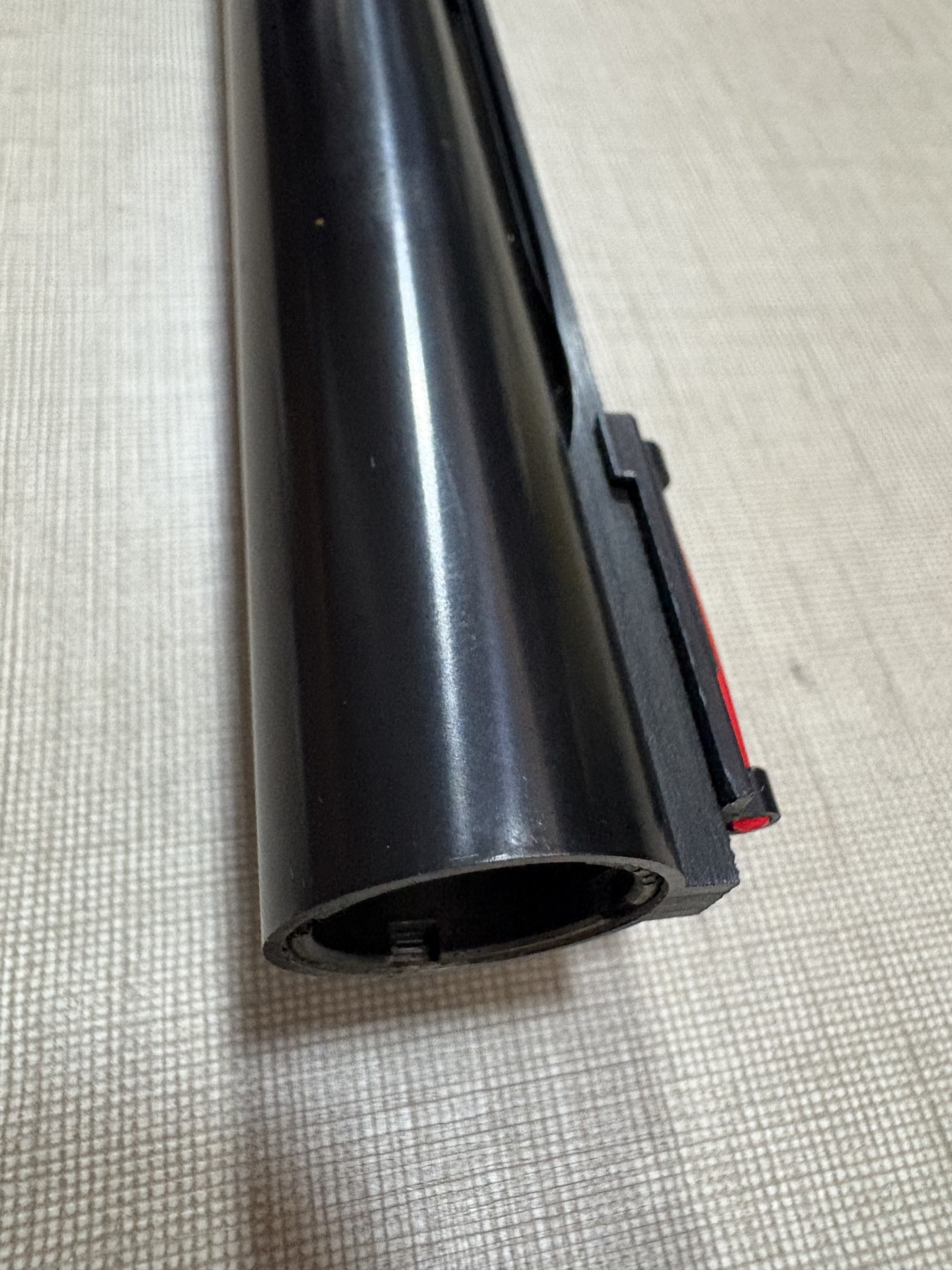 Parte dianteira de uma arma de fogo com detalhes em madeira escura e metal preto