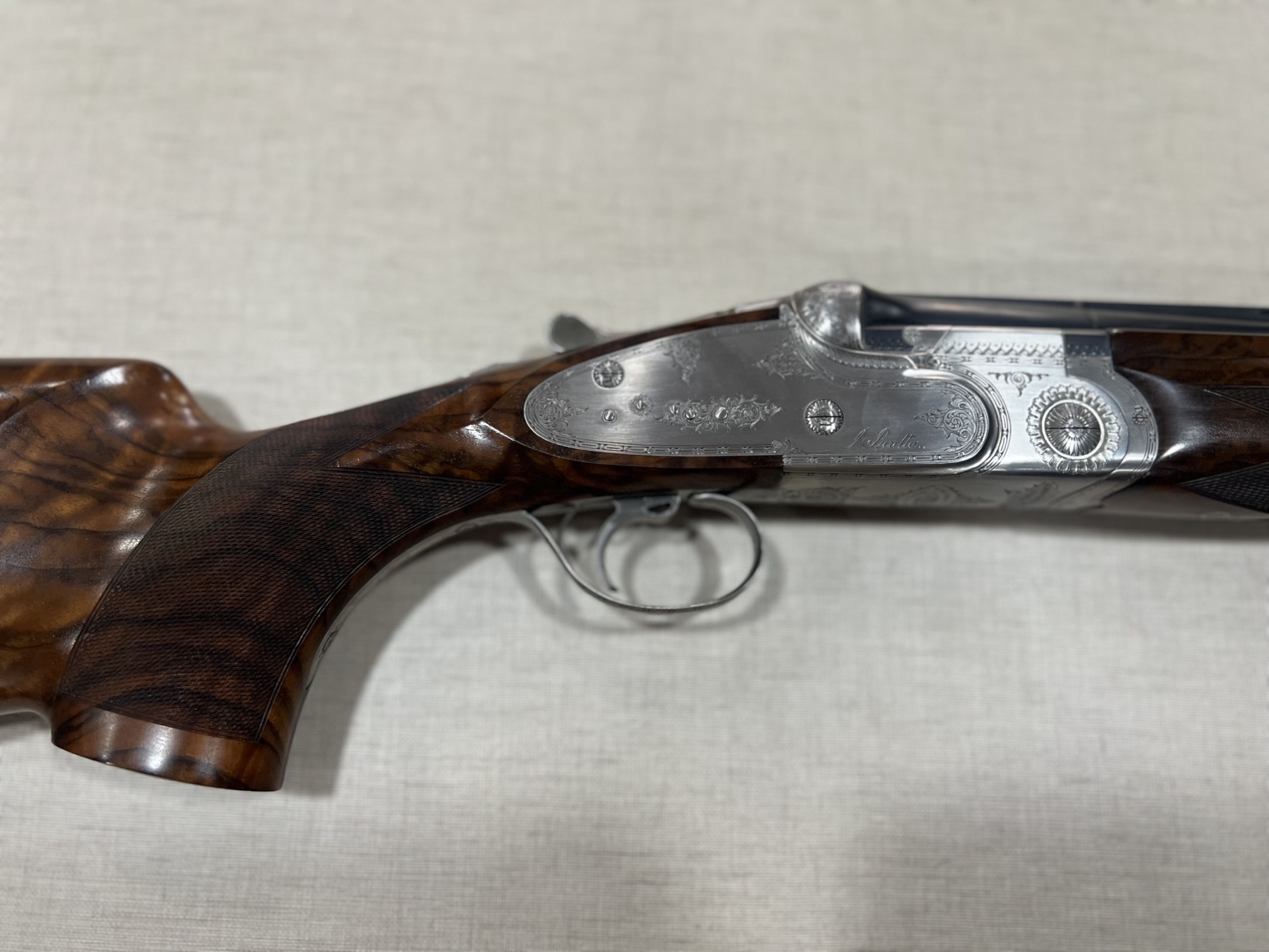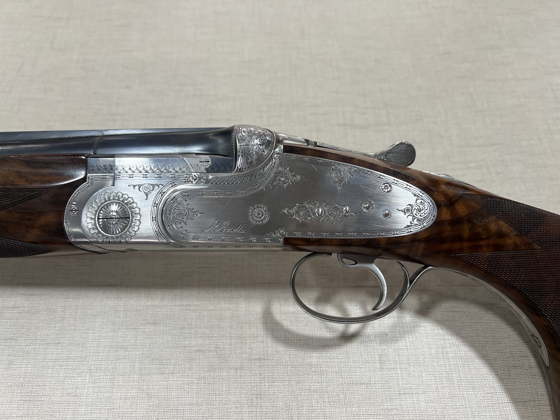 Espingarda com caixa prateada gravada e empunhadura de madeira escura