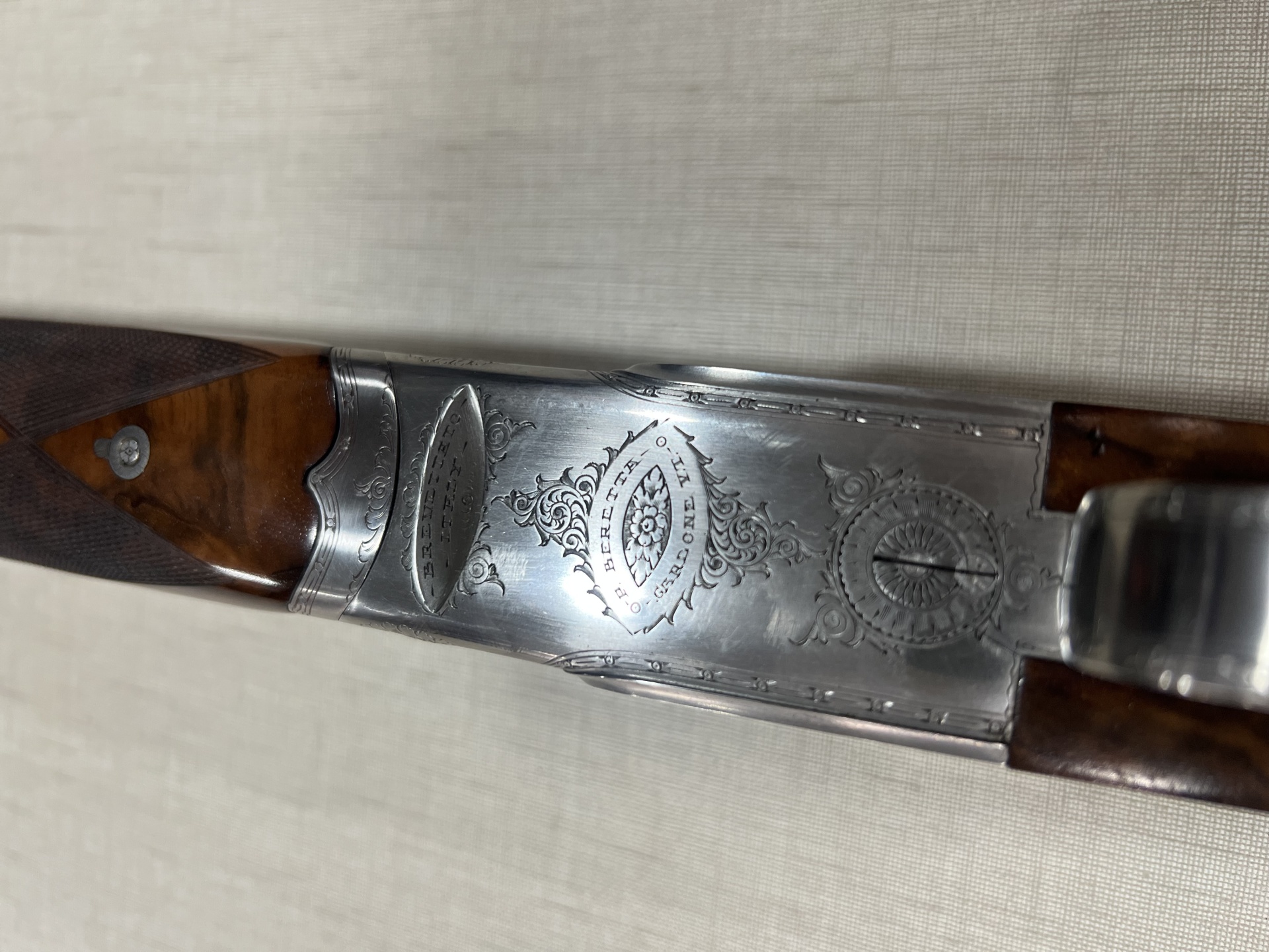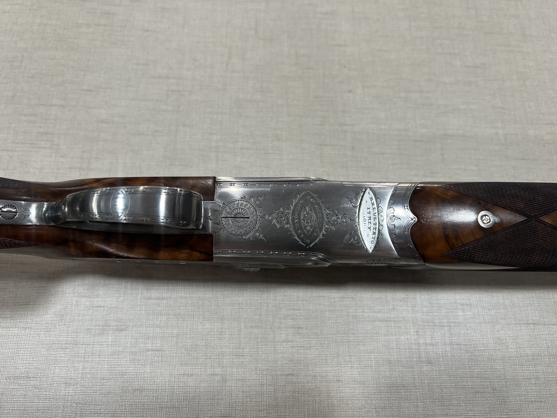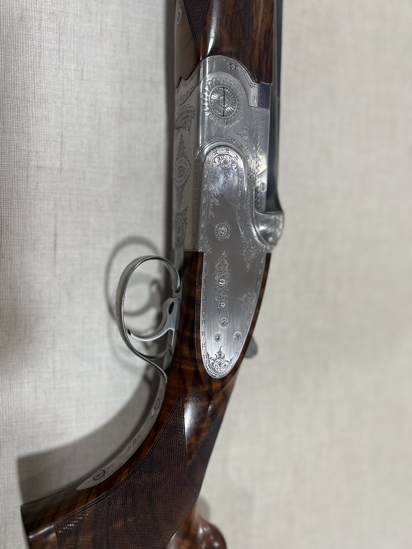 Espingarda de cano duplo com corpo prateado e punho em madeira escura com gravações e texto