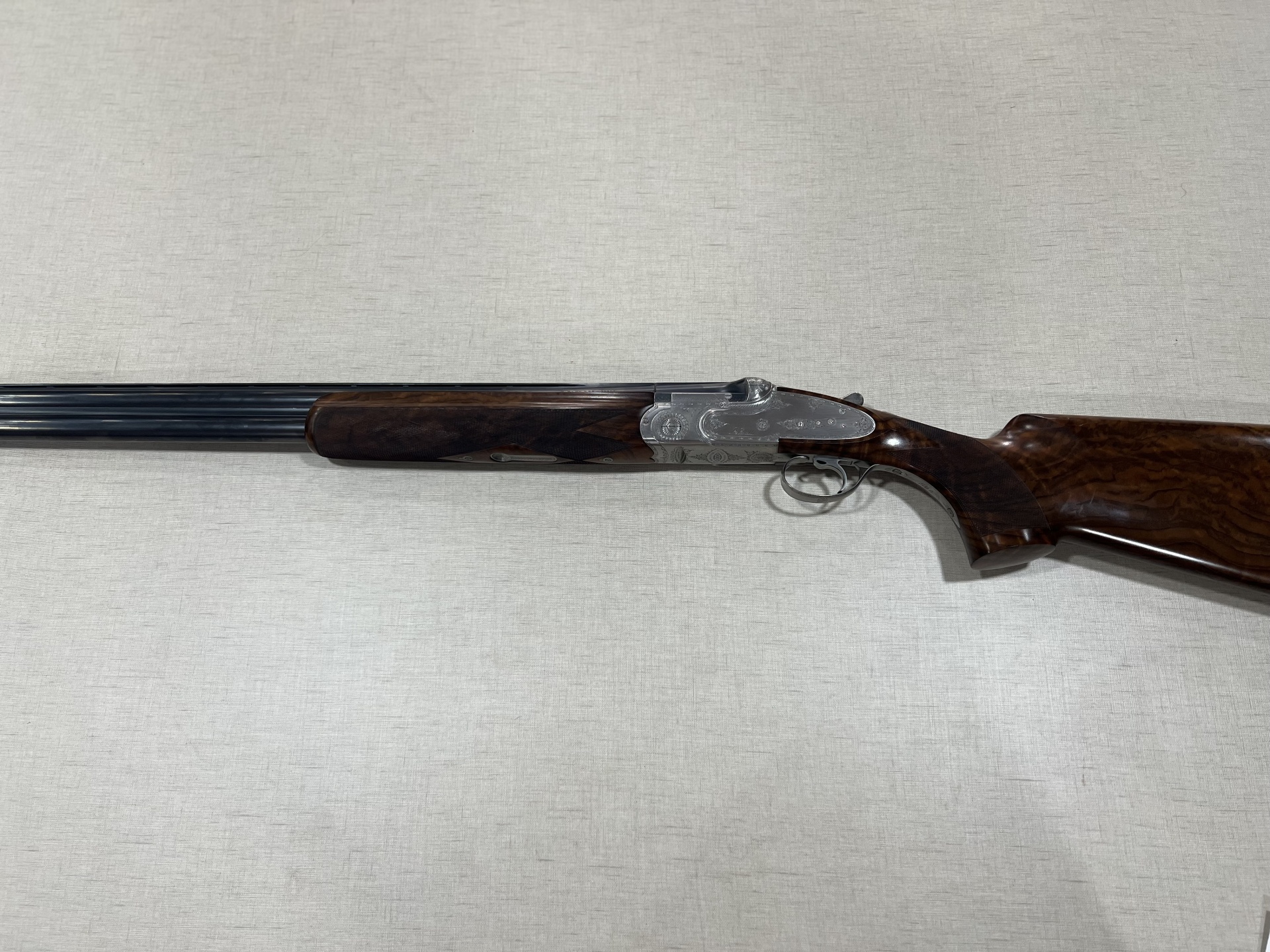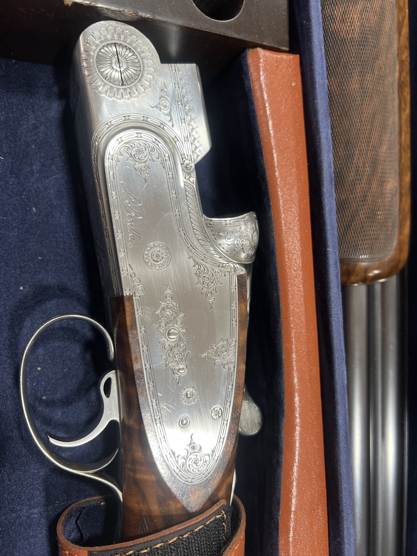 Espingarda com madeira e detalhes metálicos gravados em caixa azul acolchoada