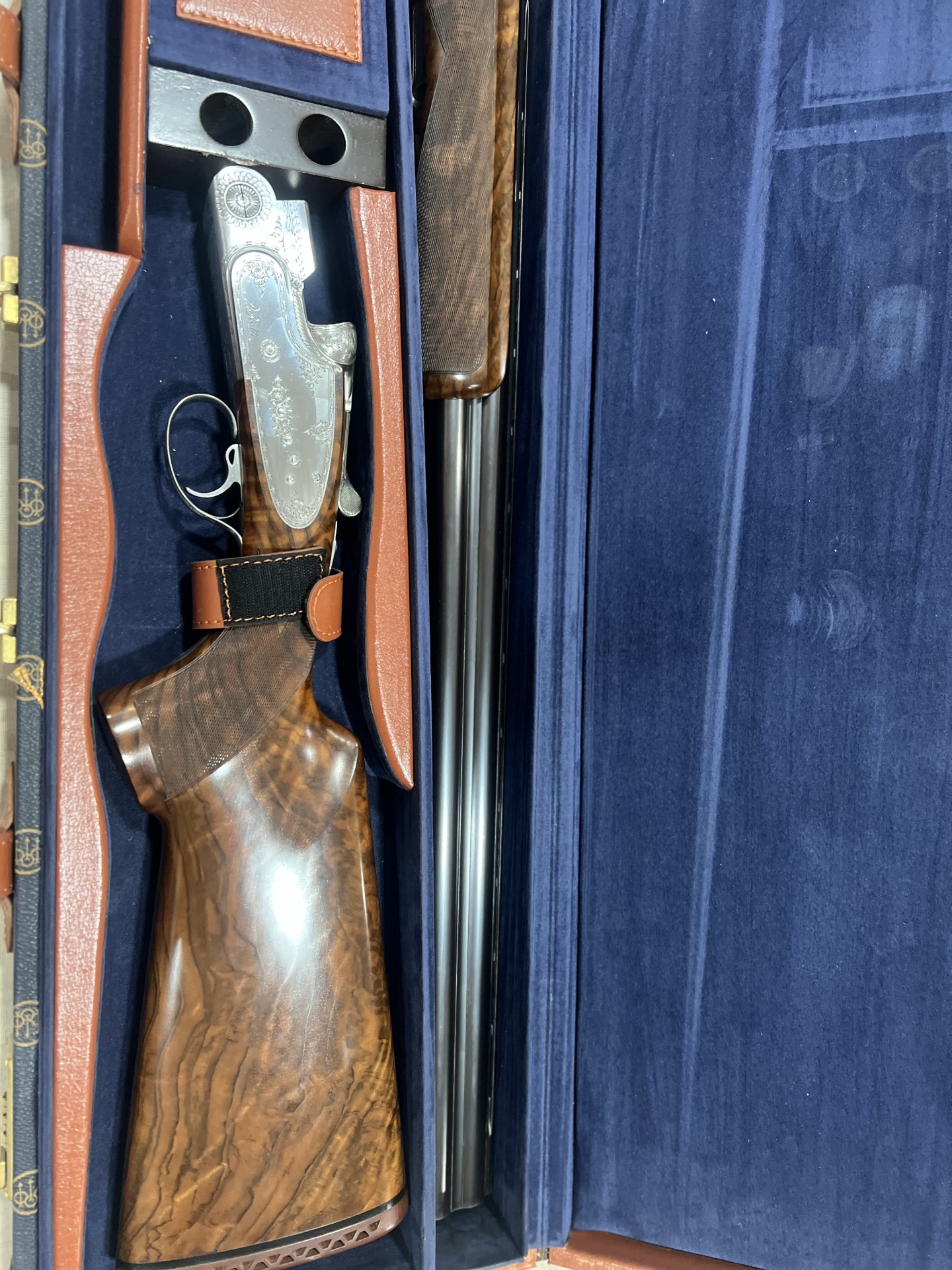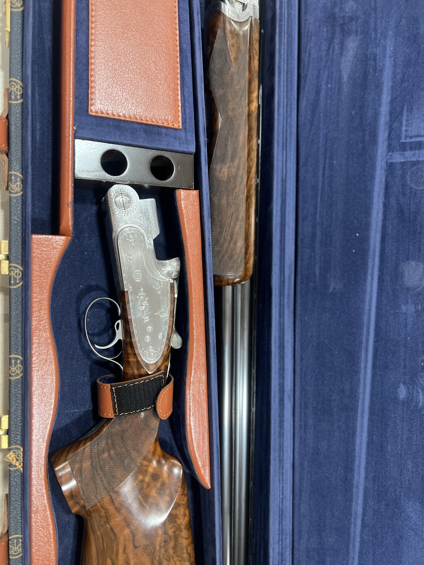 Espingarda de caça numa mala forrada a tecido azul escuro e detalhes em couro castanho