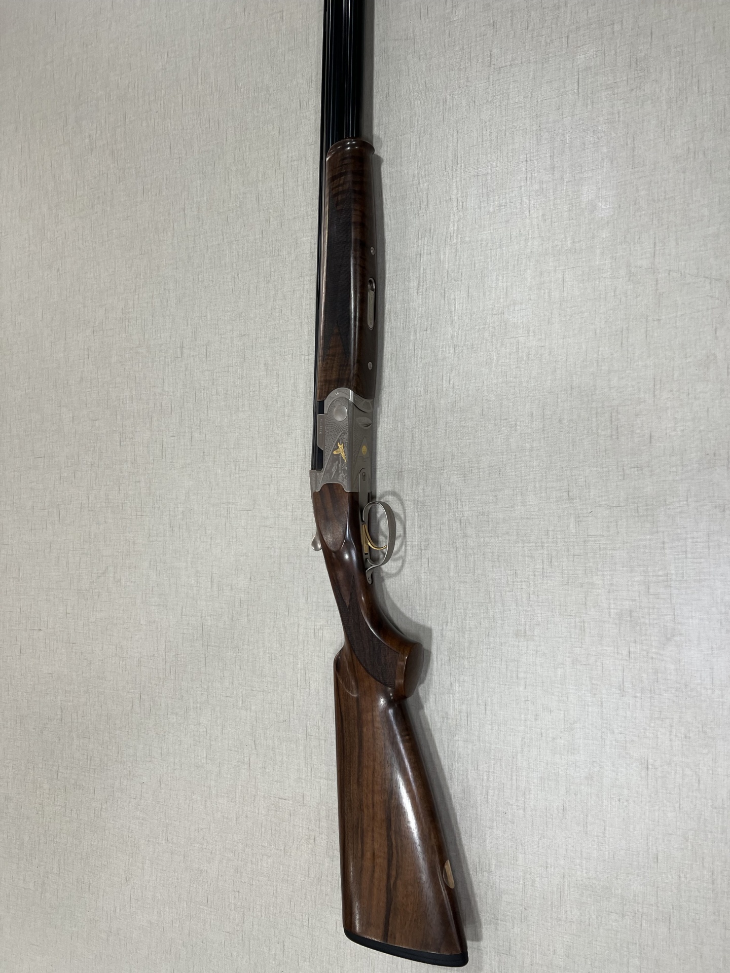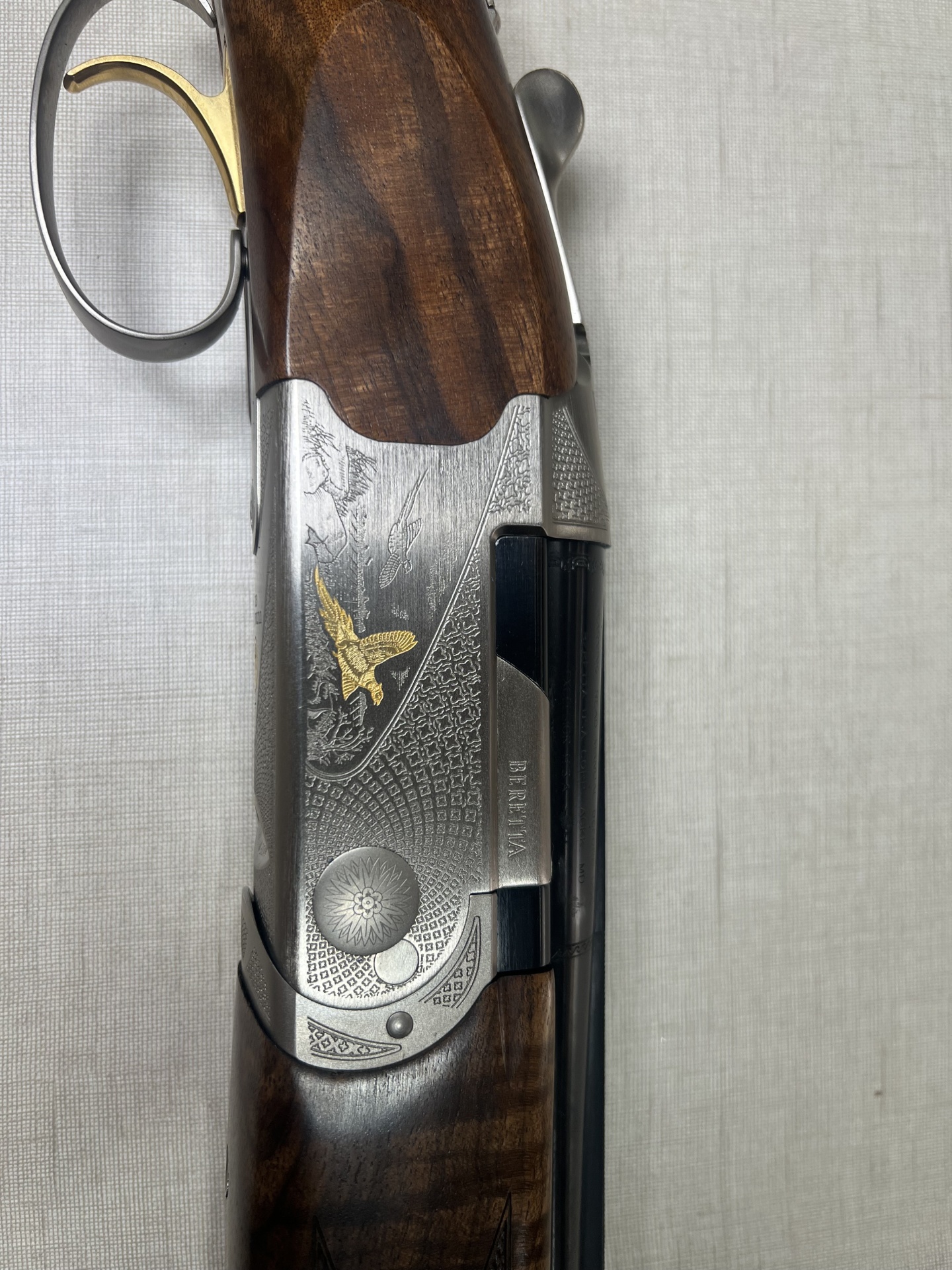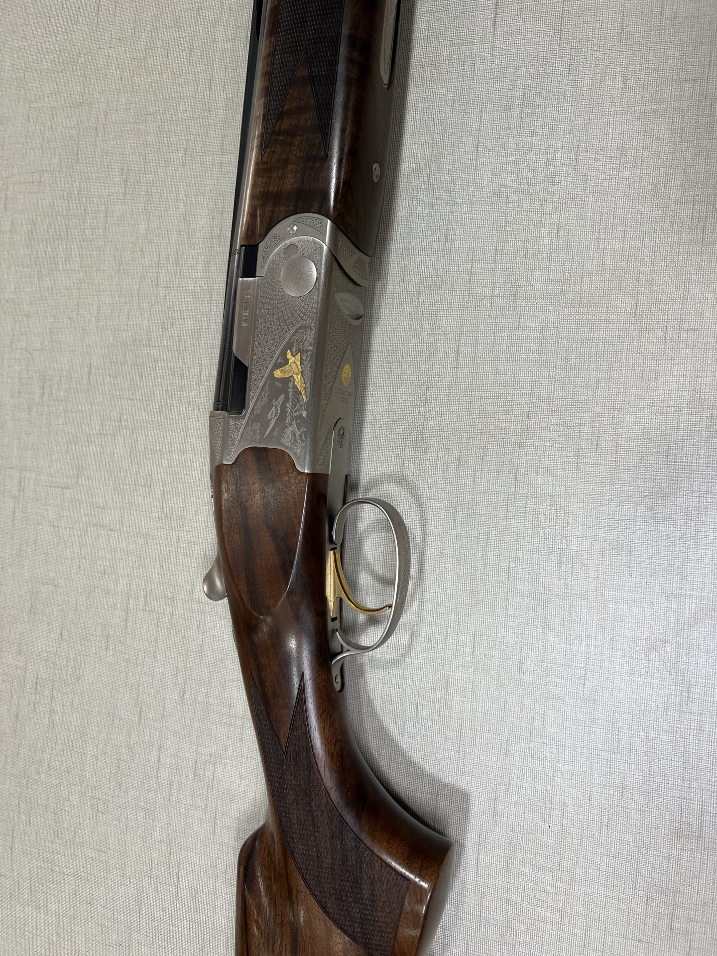 Rifle de madeira e metal com gravação de pomba dourada e texto BERETTA