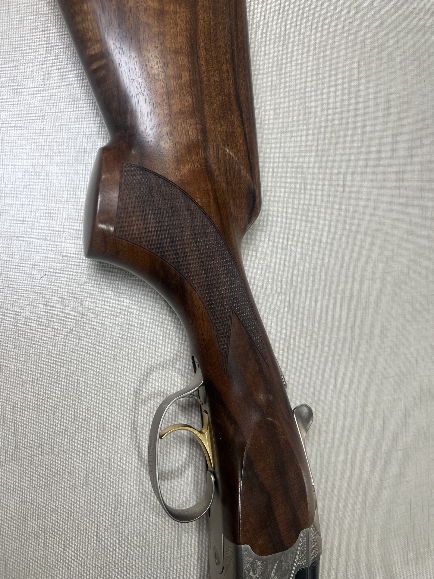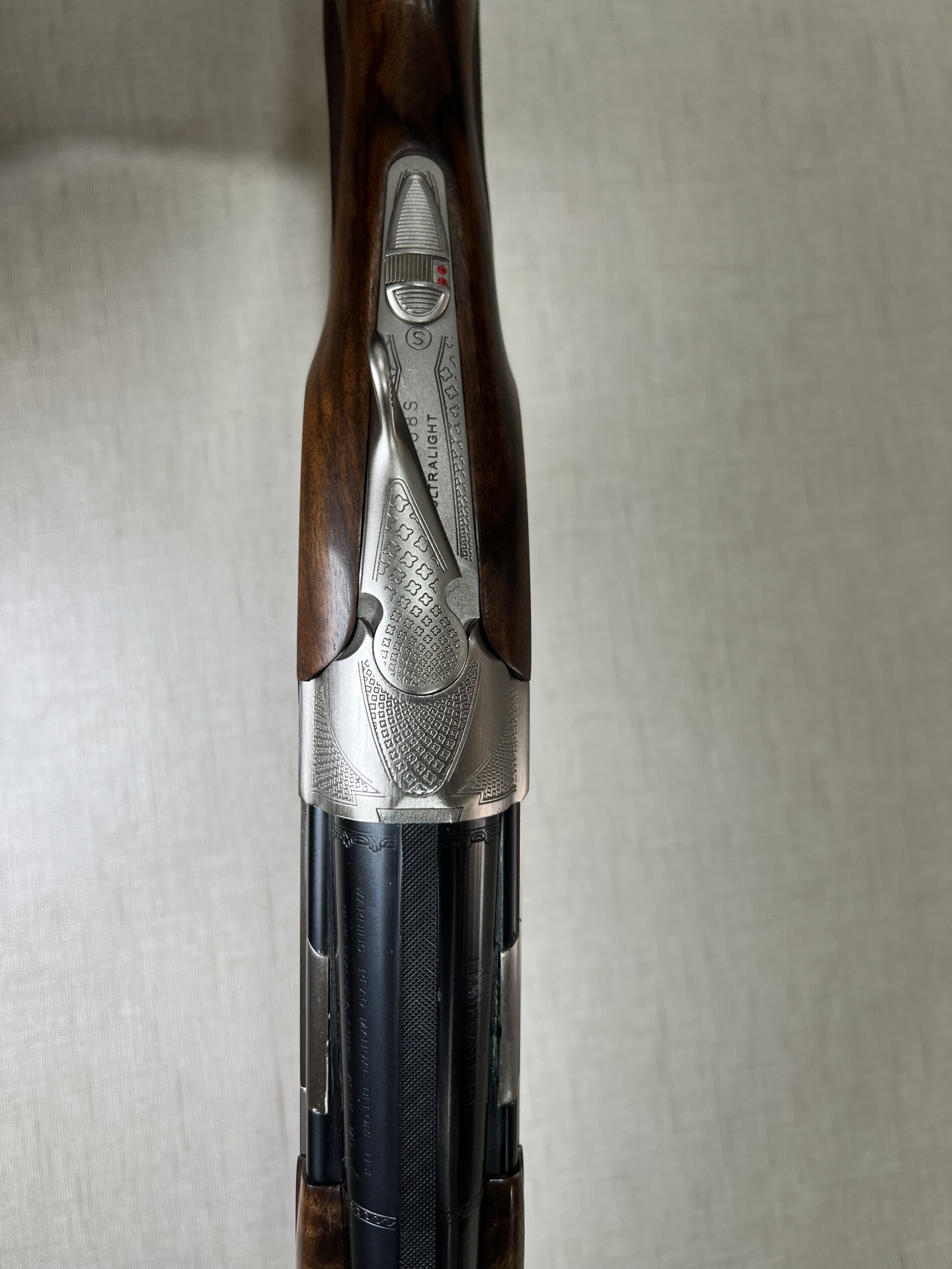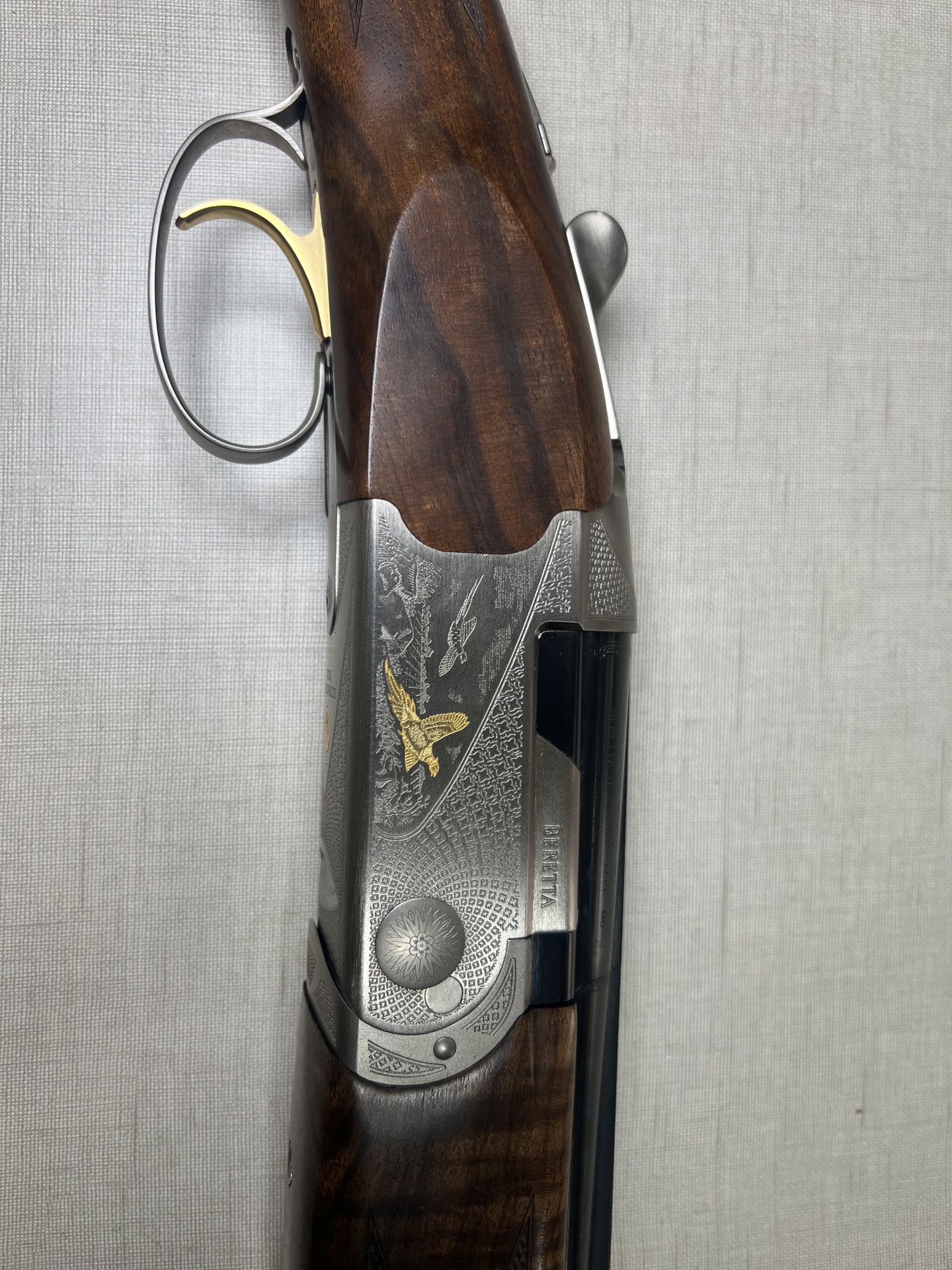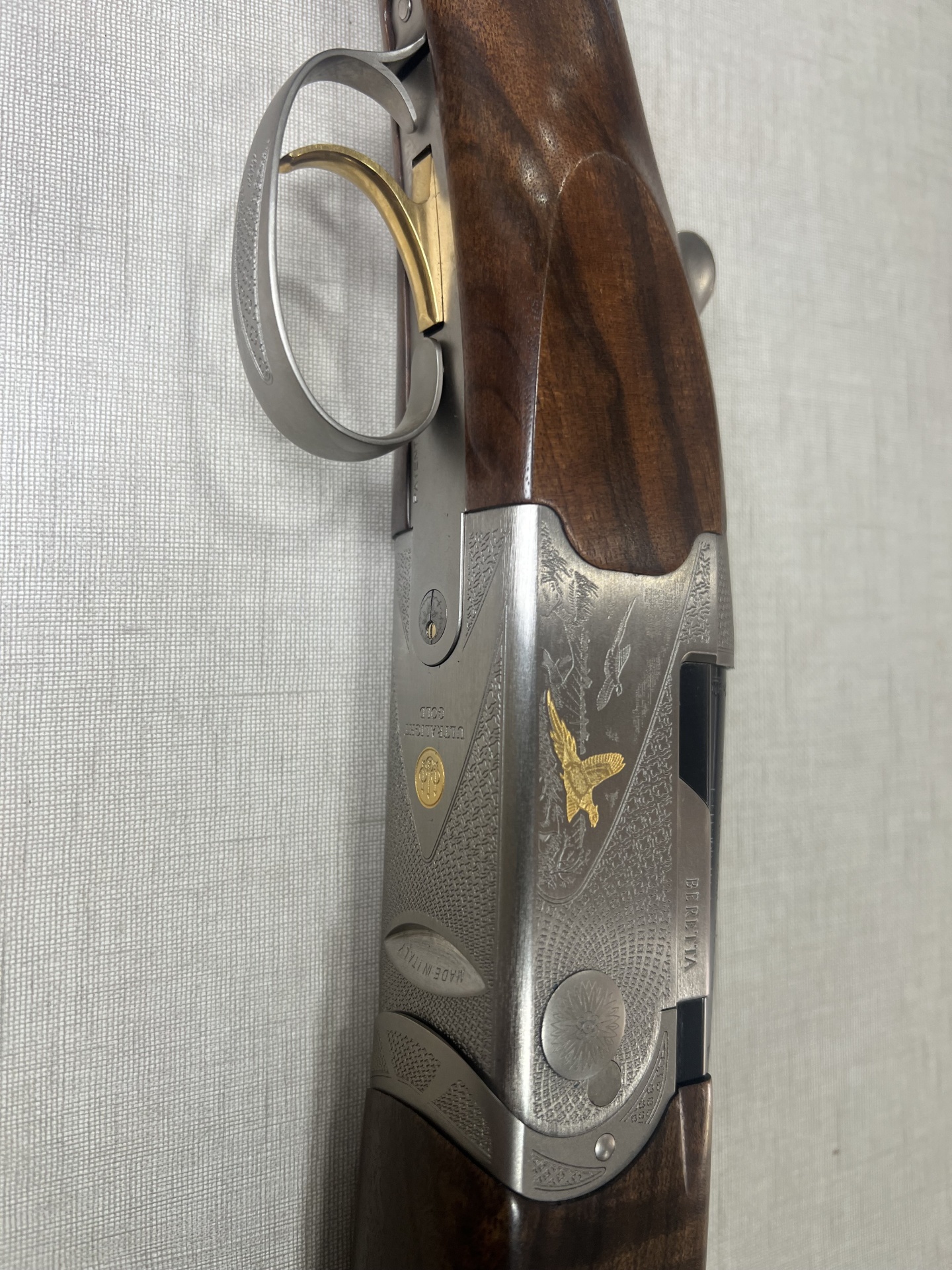 Rifle de madeira e metal com gravação de pomba dourada e texto BERETTA