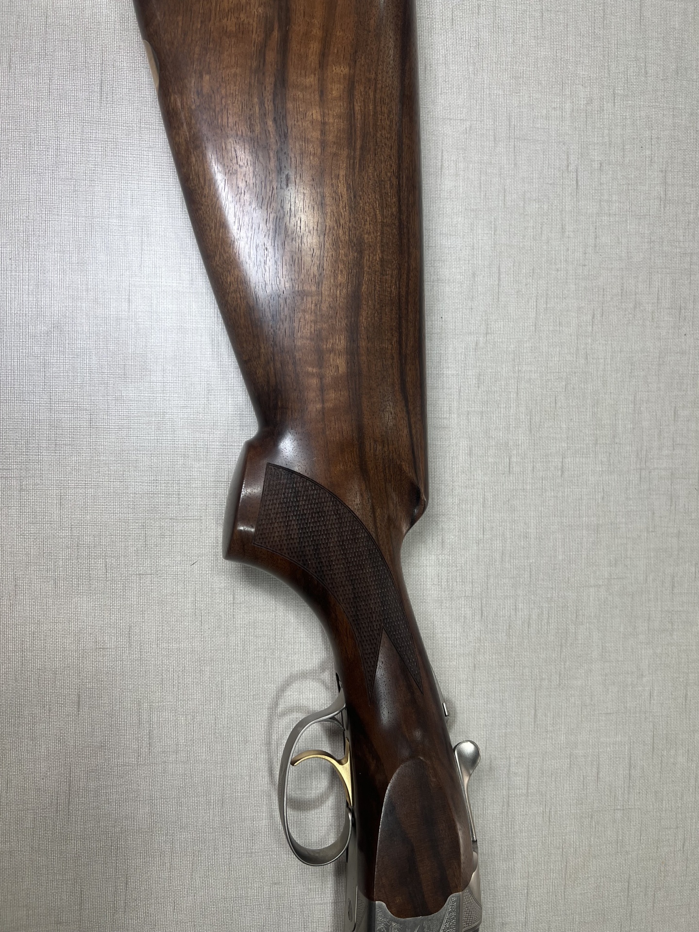 Coronha de madeira escura com gatilho dourado e detalhes metálicos prateados