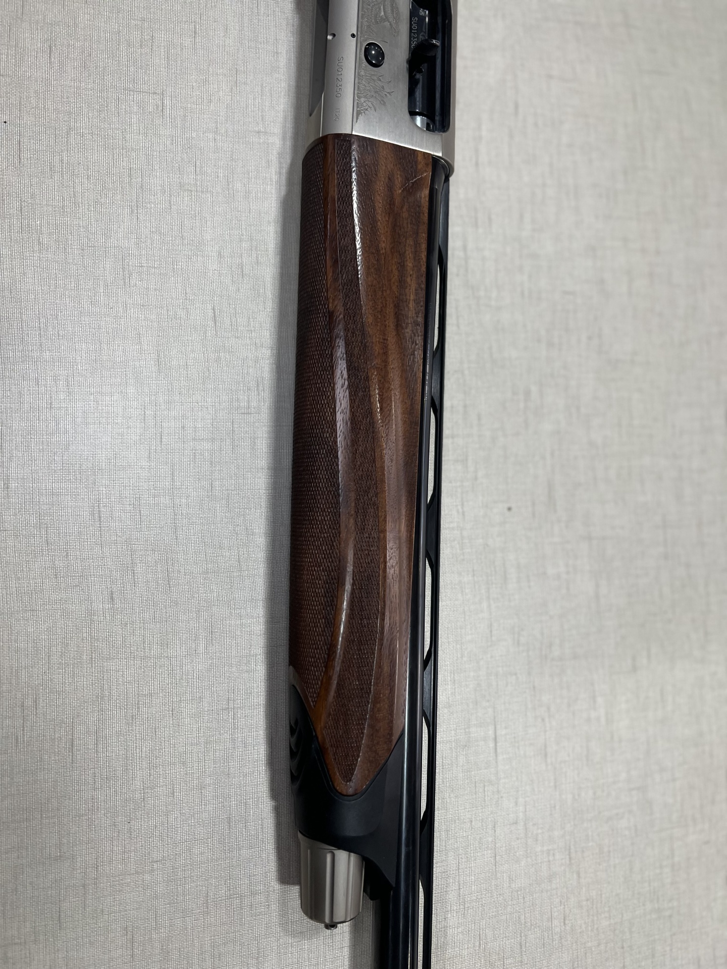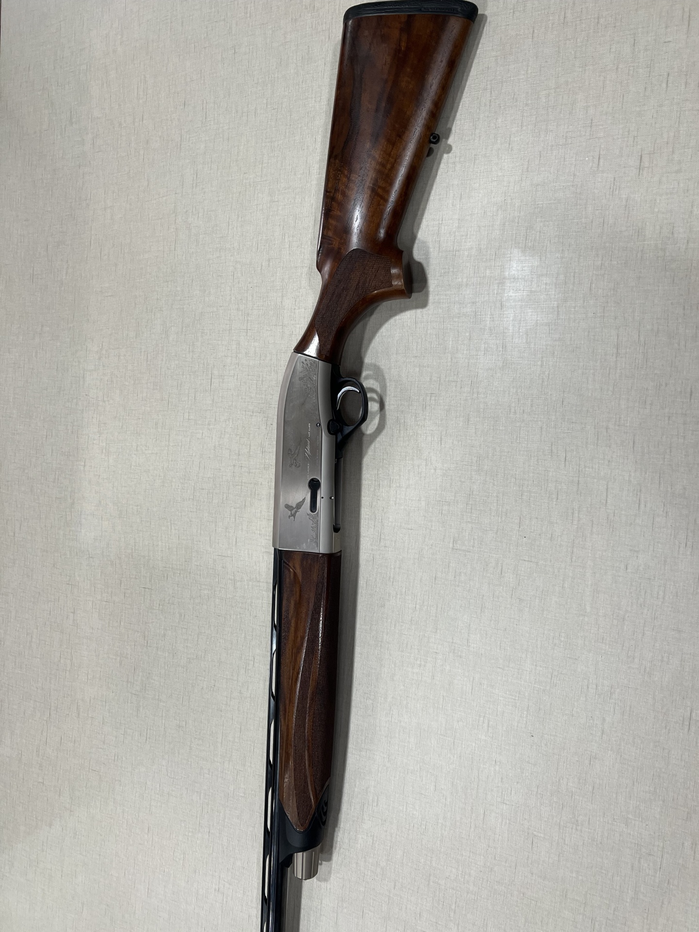 Espingarda de metal prateado e madeira castanha com gravações e texto BERETTA AL391 URIKA AUTO calibre 12