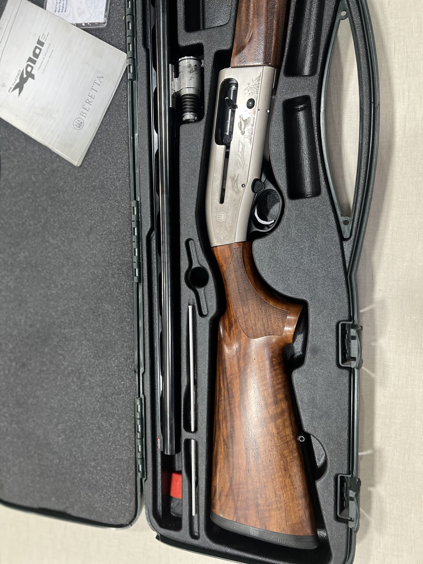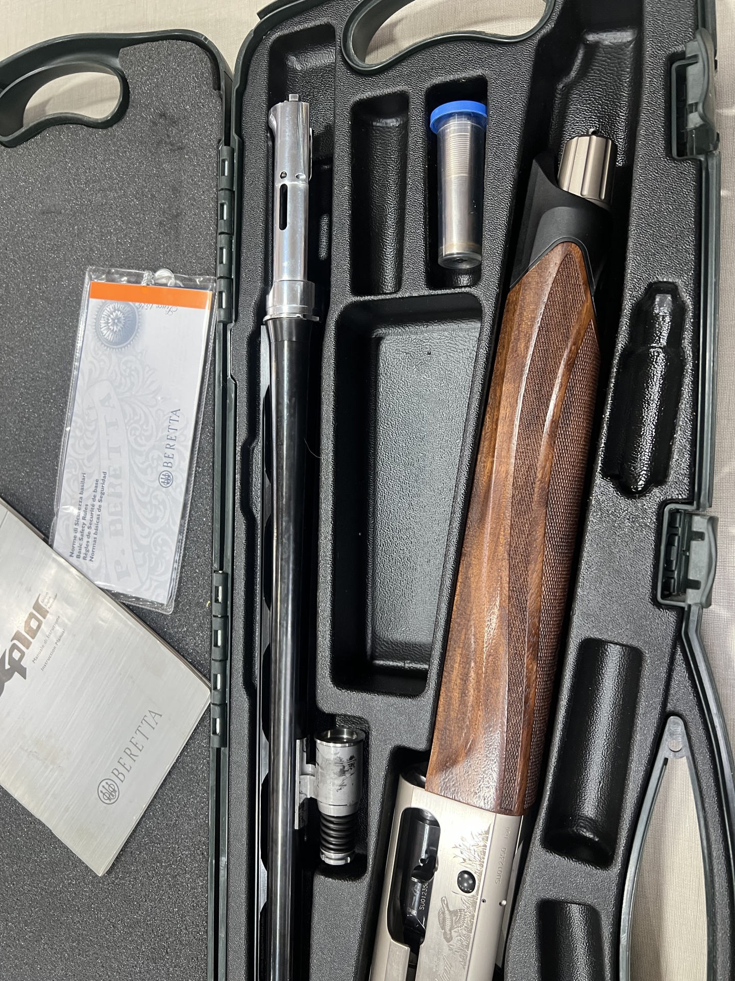 Espingarda Beretta de madeira e metal em estojo preto com manual