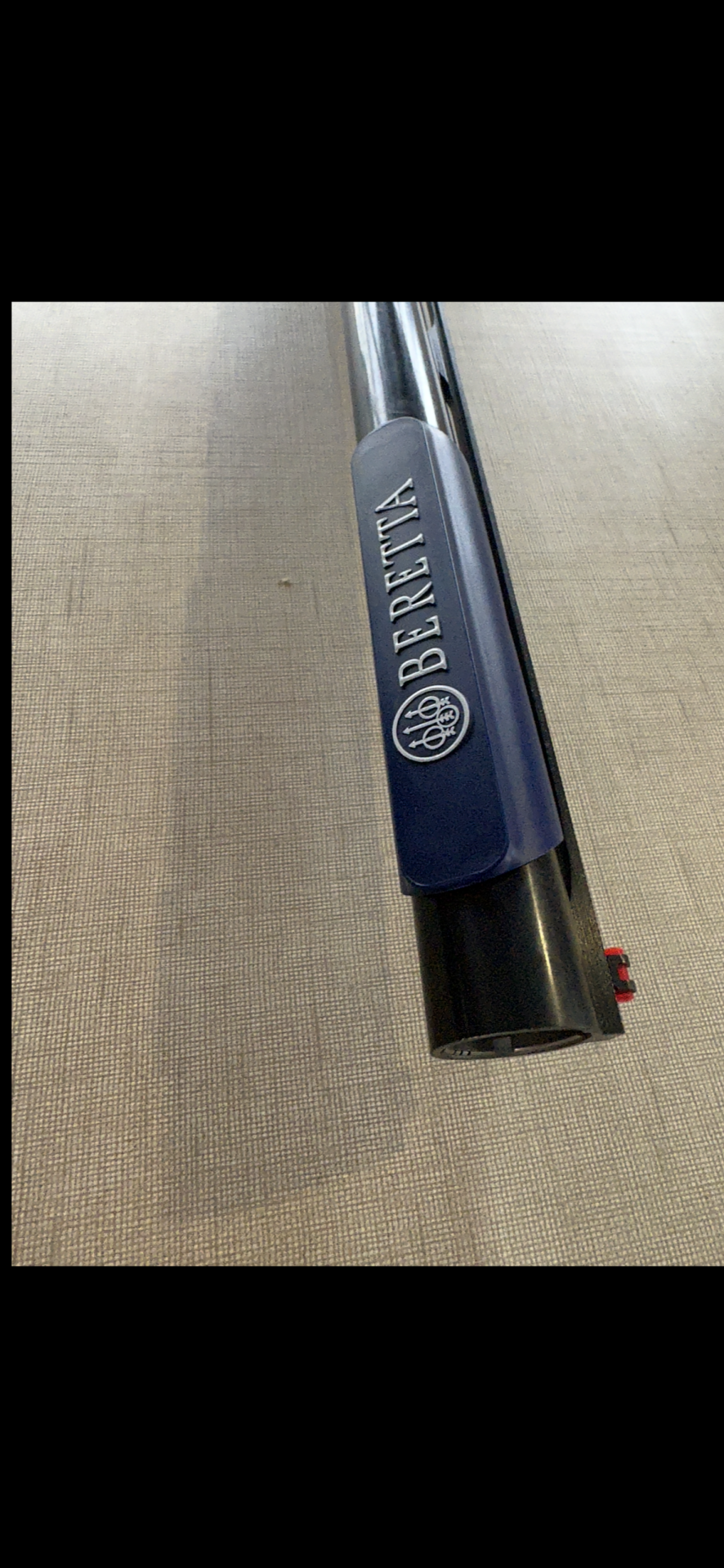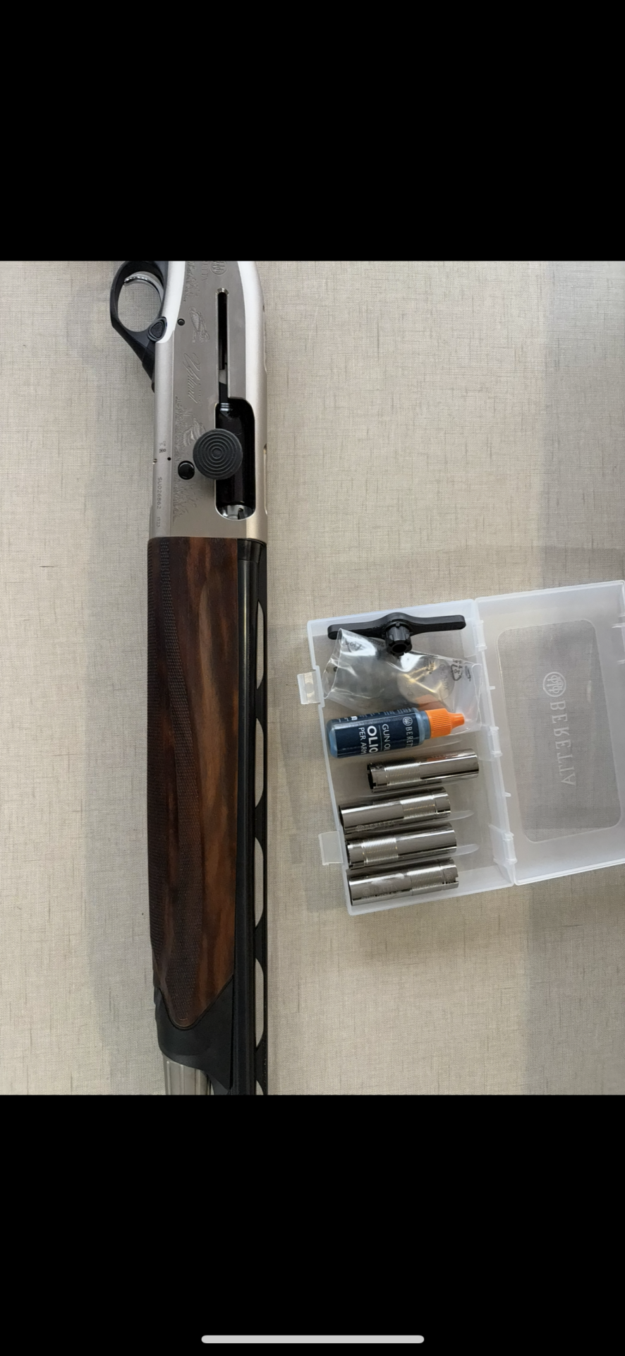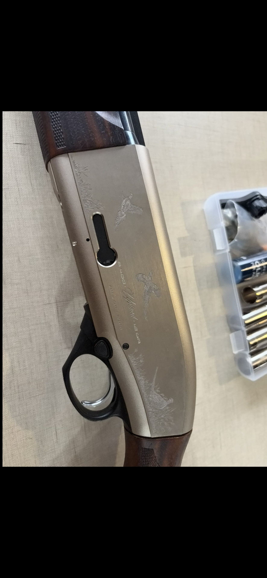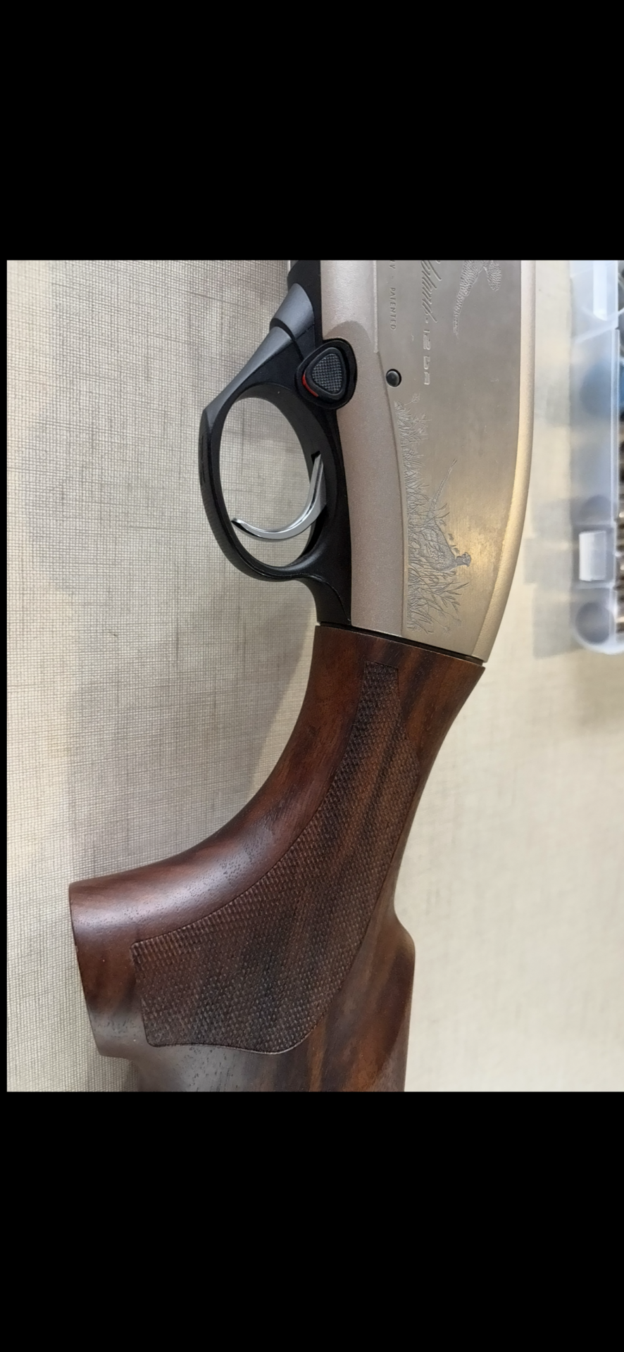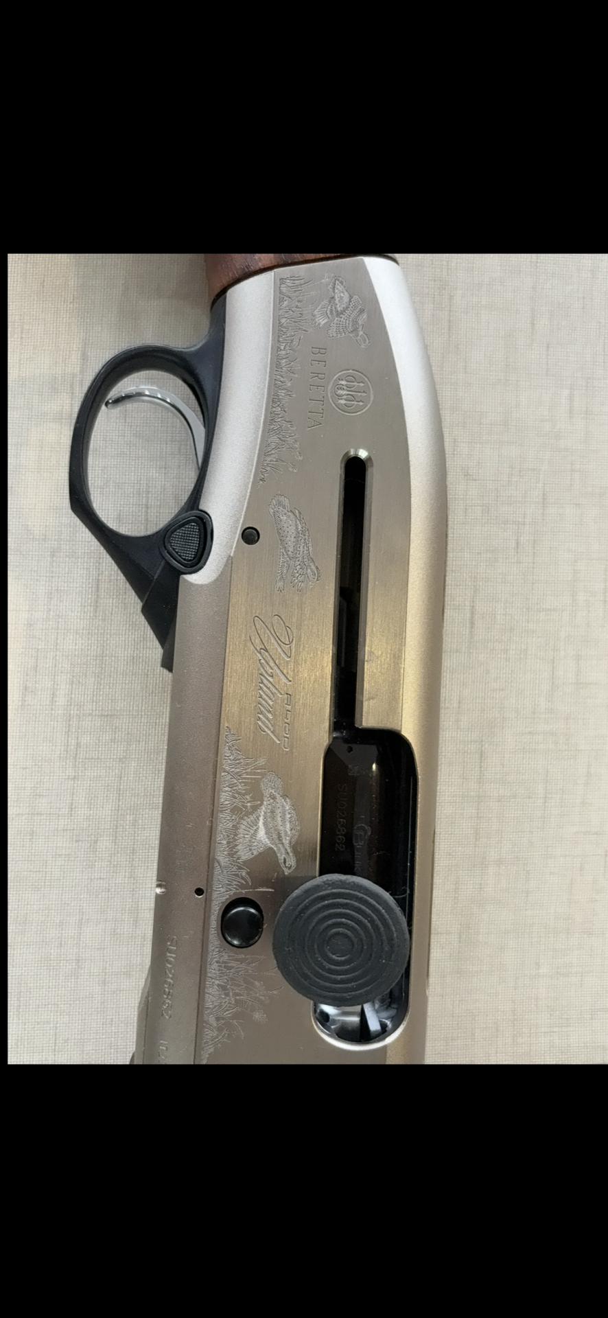 Espingarda Beretta com detalhes em metal prateado, punho preto e madeira, com gravações de aves e texto AlPINO BERETTA.