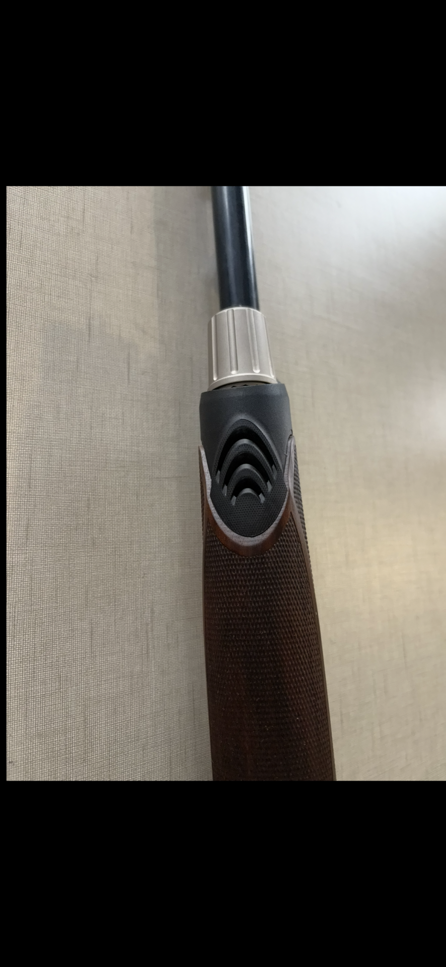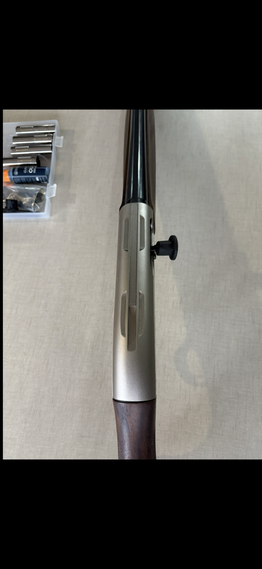 Parte superior de espingarda com cano preto e guarda-mão em madeira castanha