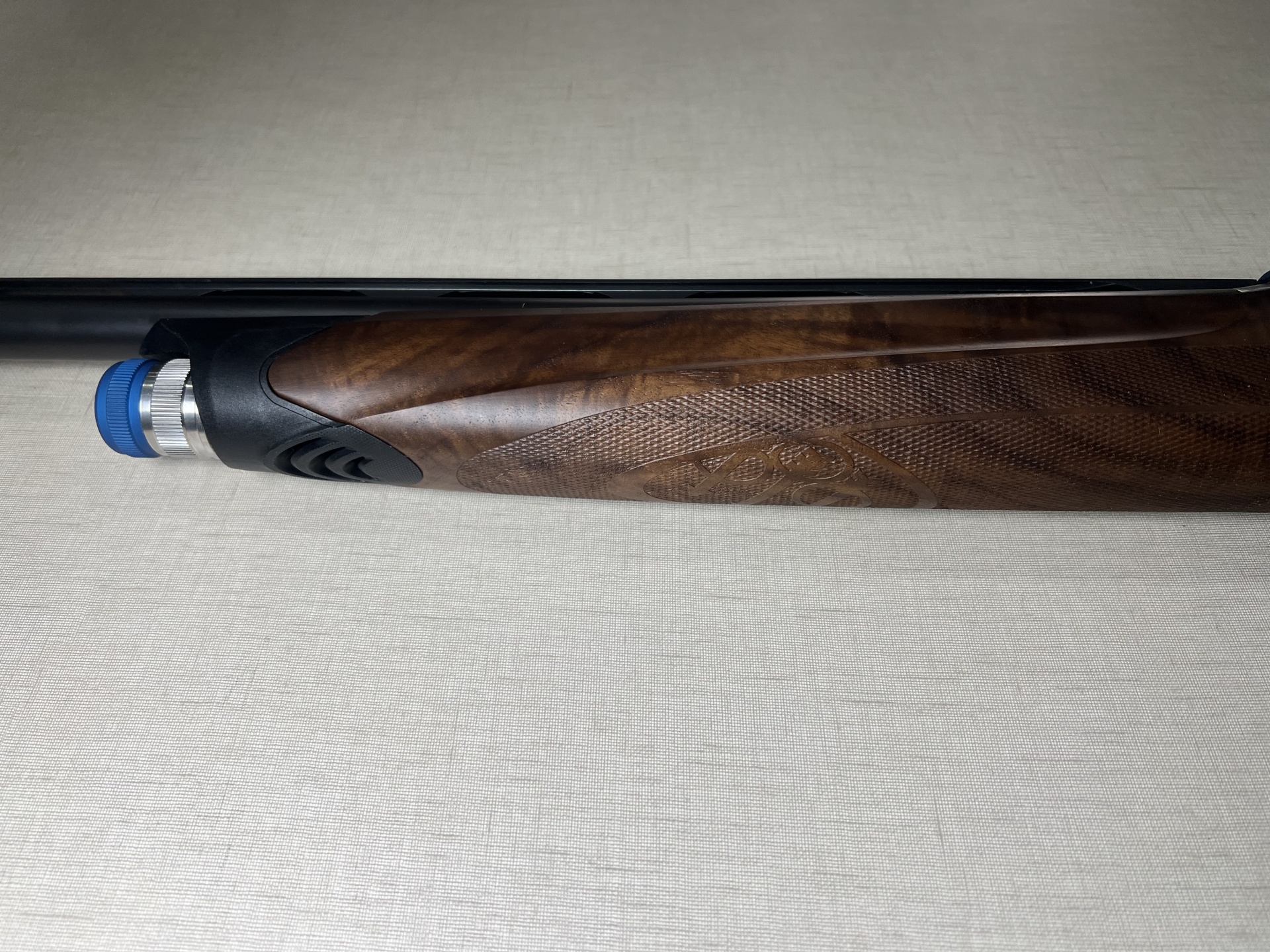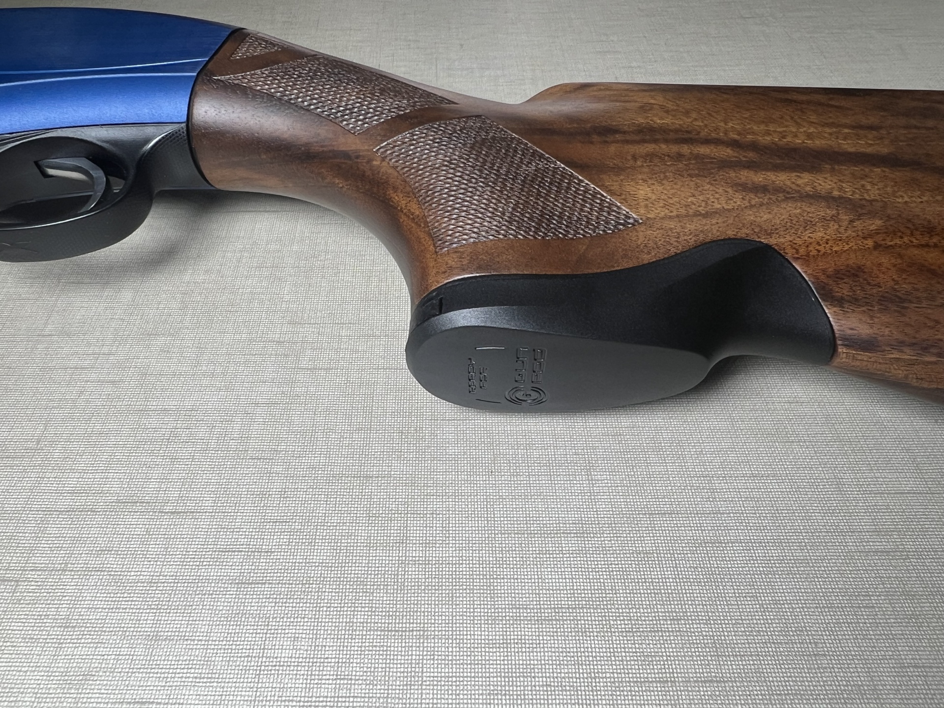 espingarda com madeira escura e metal azul