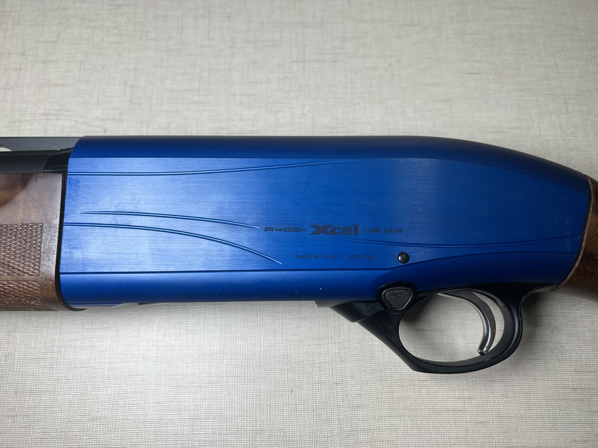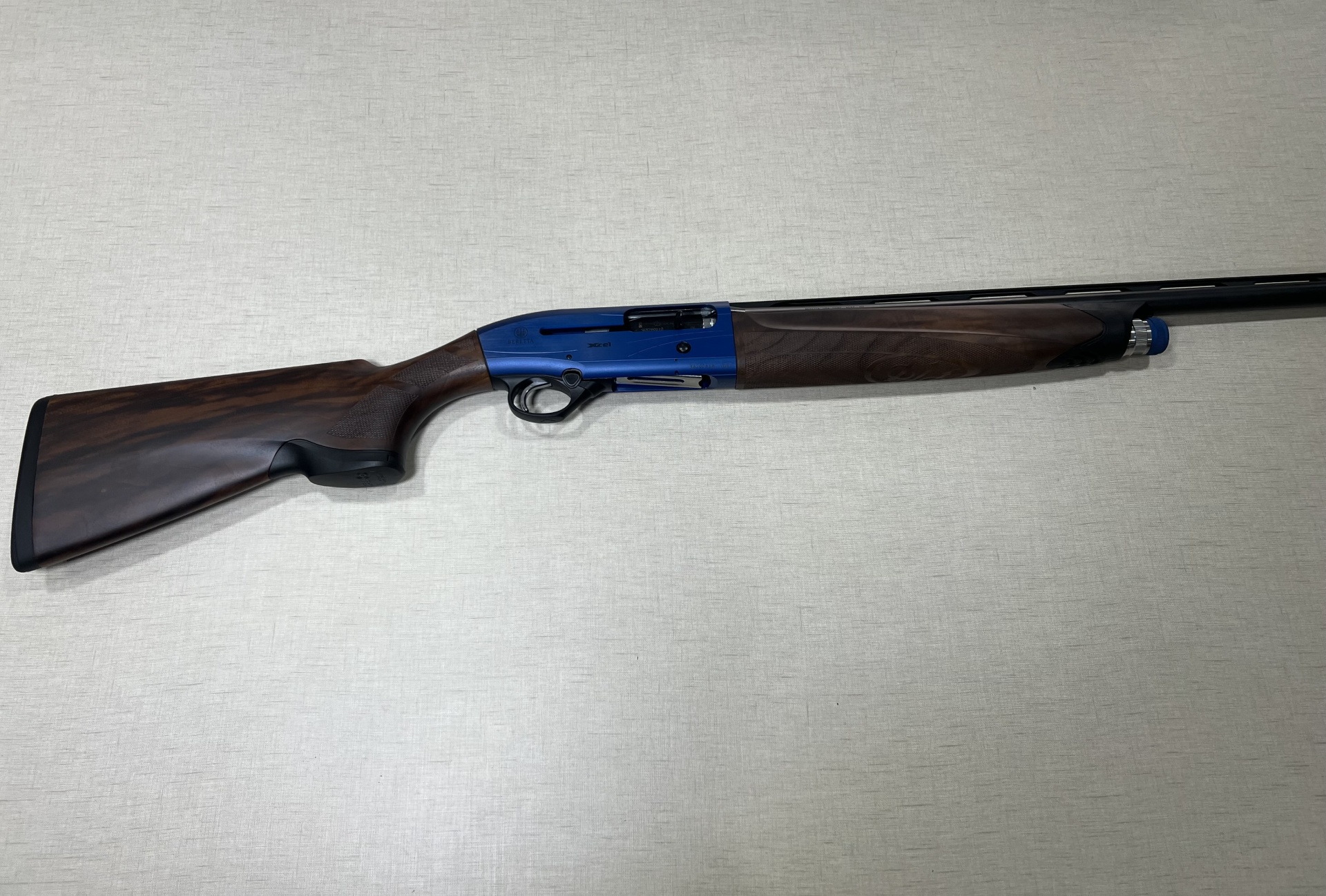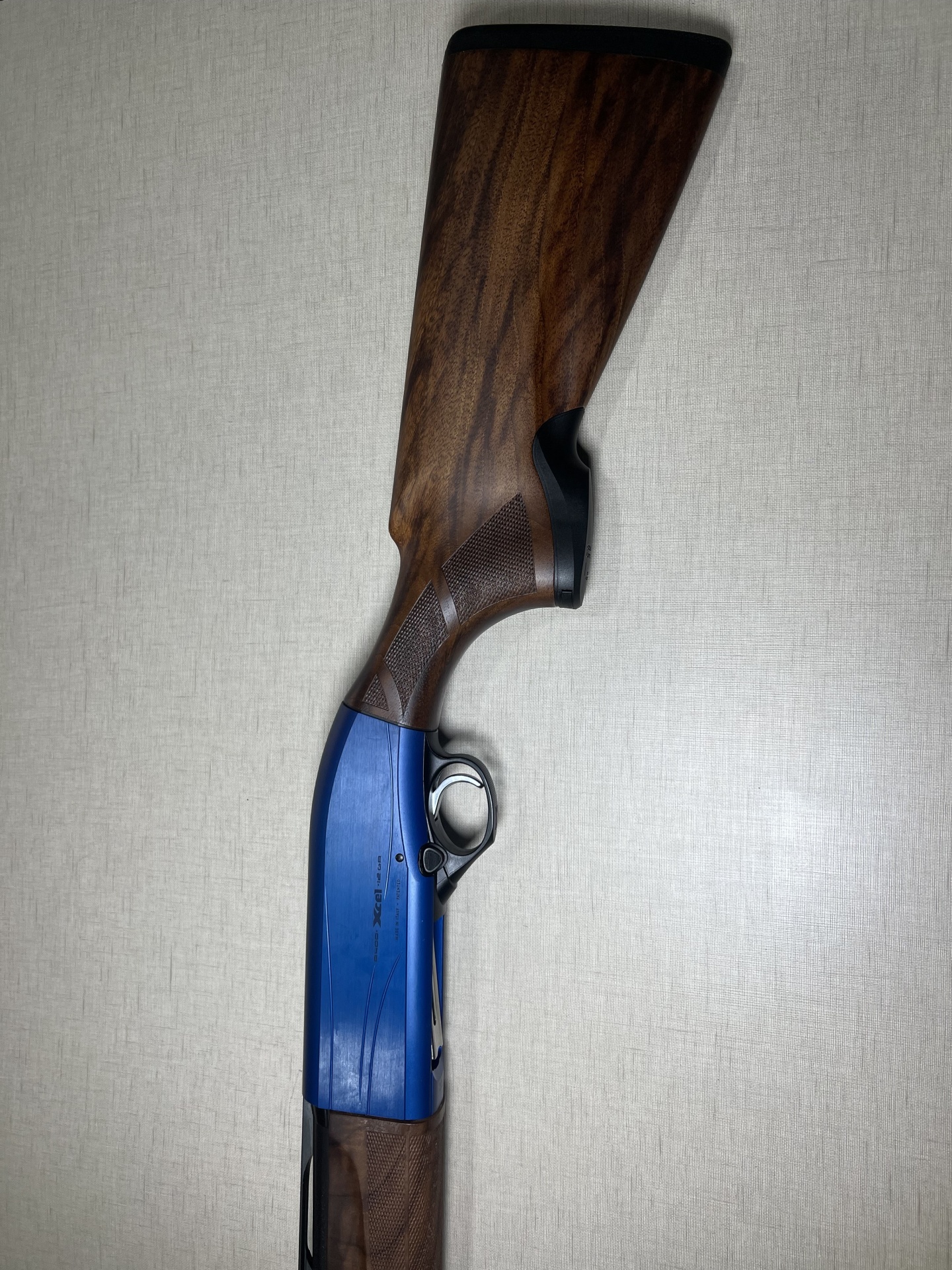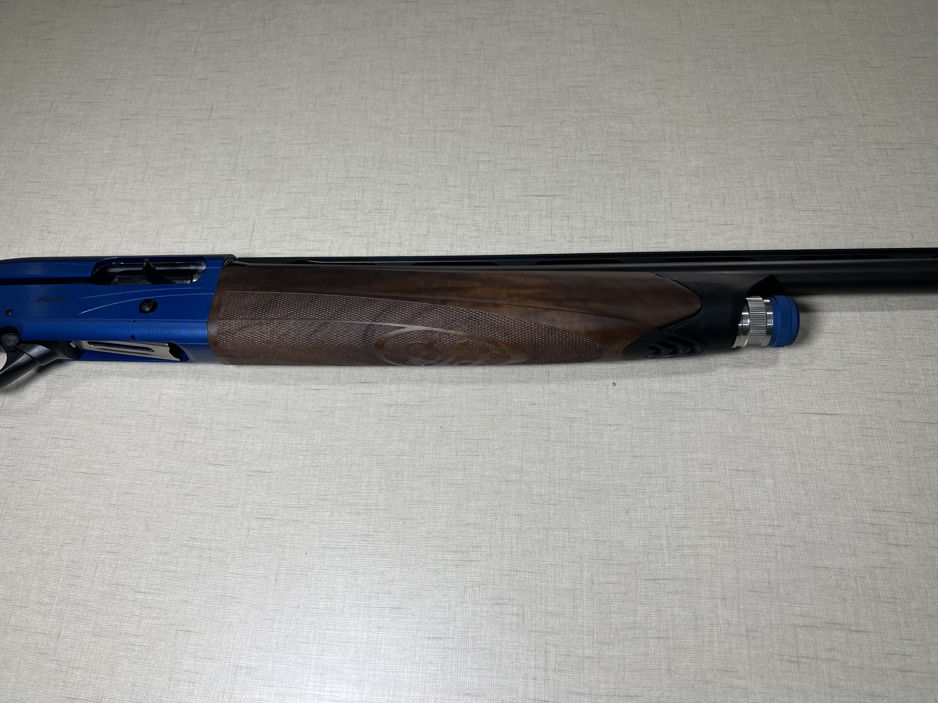 Espingarda semi-automática azul com empunhadura de madeira e texto STUDIO XC1