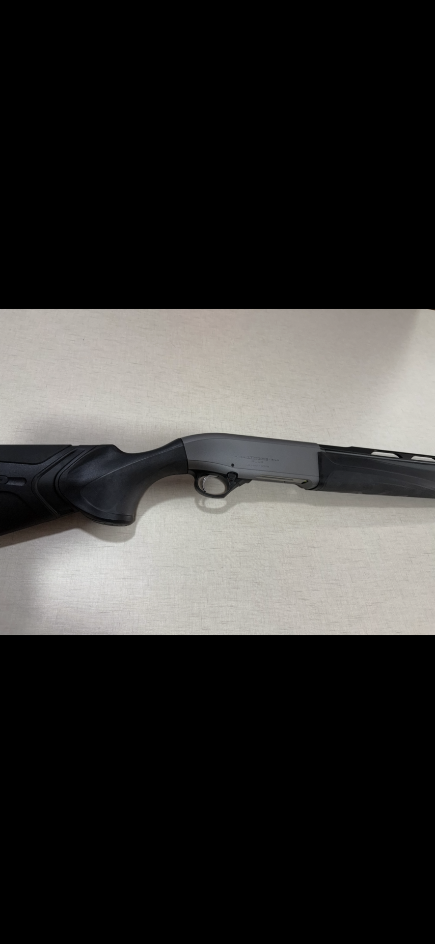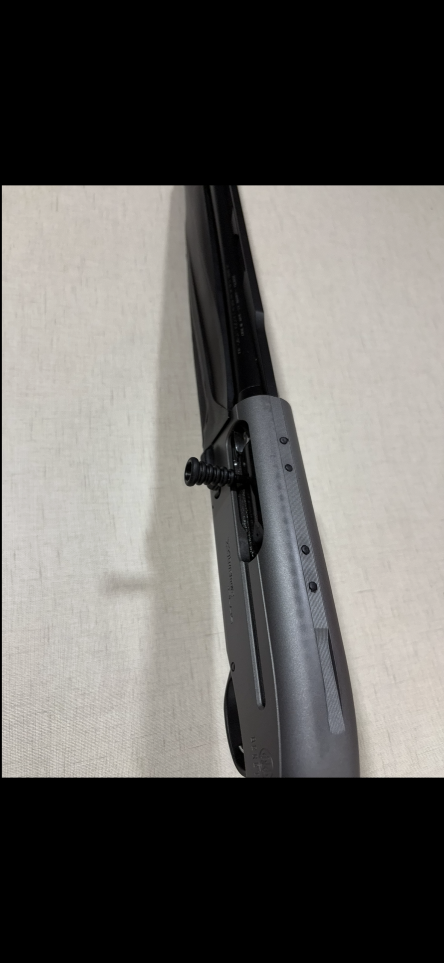 Espingarda Beretta AL391 Urika em metal cinzento com empunhadura preta sobre tecido claro.
