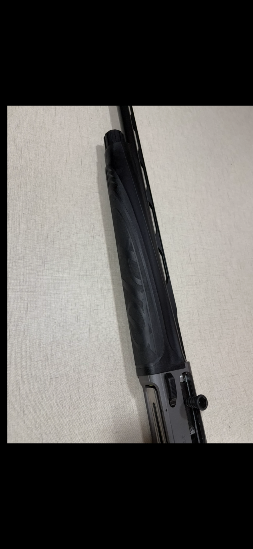 Espingarda preta com ação cinzenta e mola visível sobre fundo creme.
