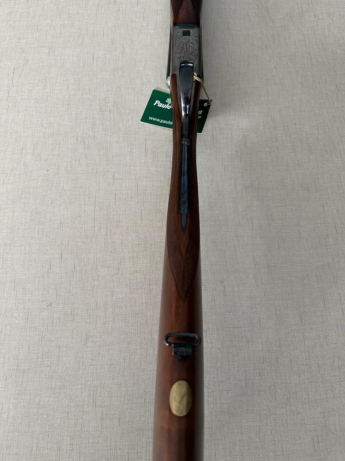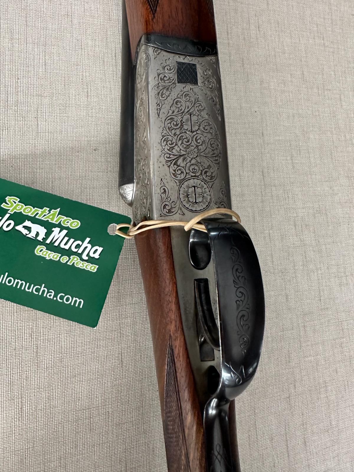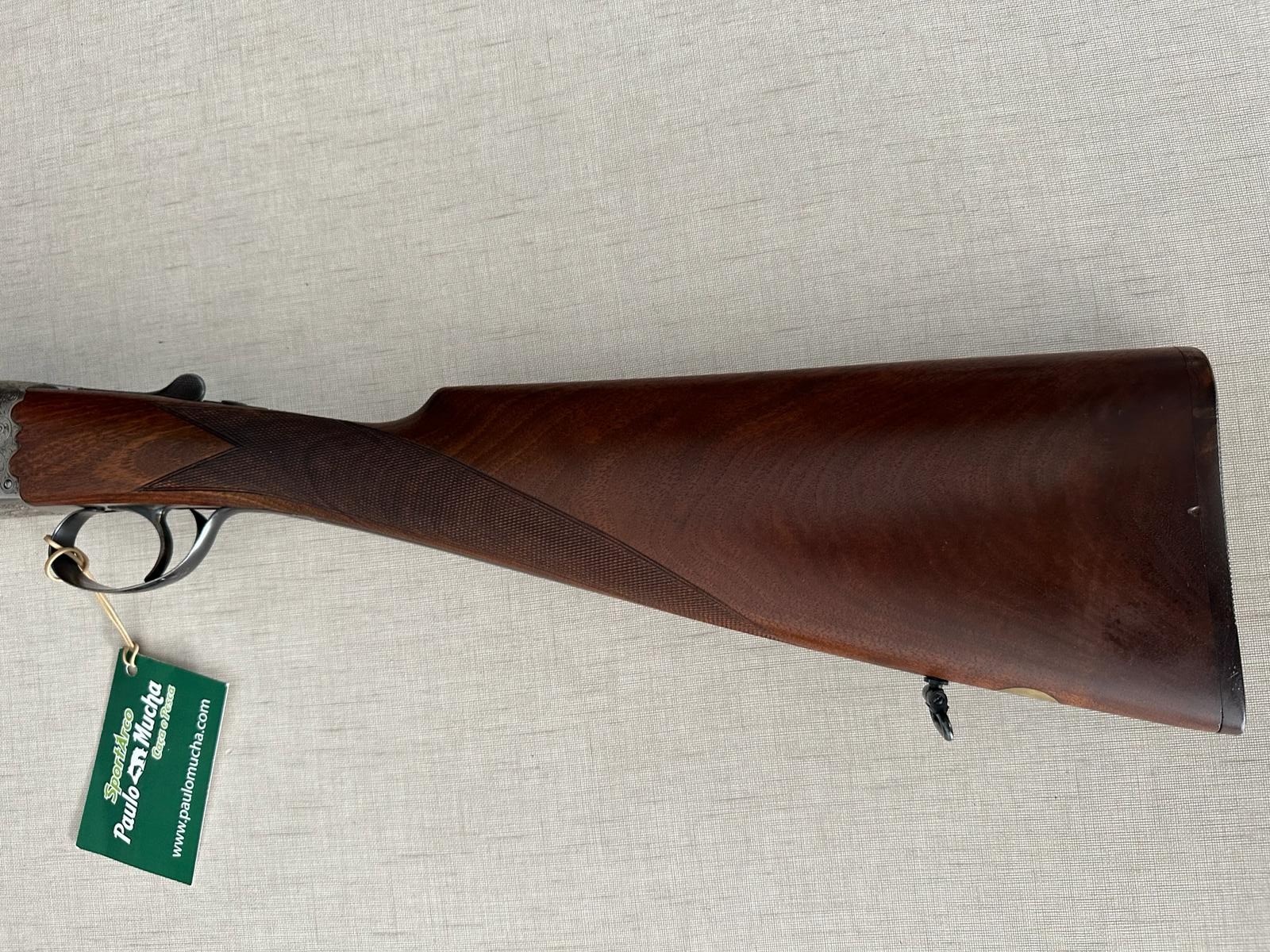 Espingarda com gravações em metal e madeira com etiqueta verde da marca SportArco Paulo Mucha
