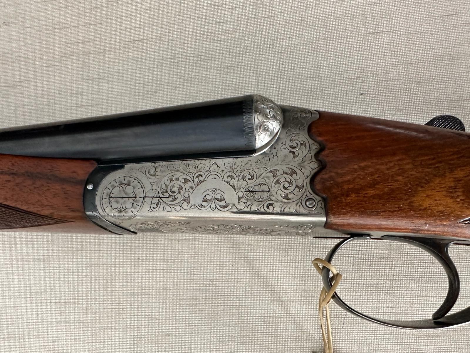 Espingarda de canos duplos com gravações e empunhadura em madeira
