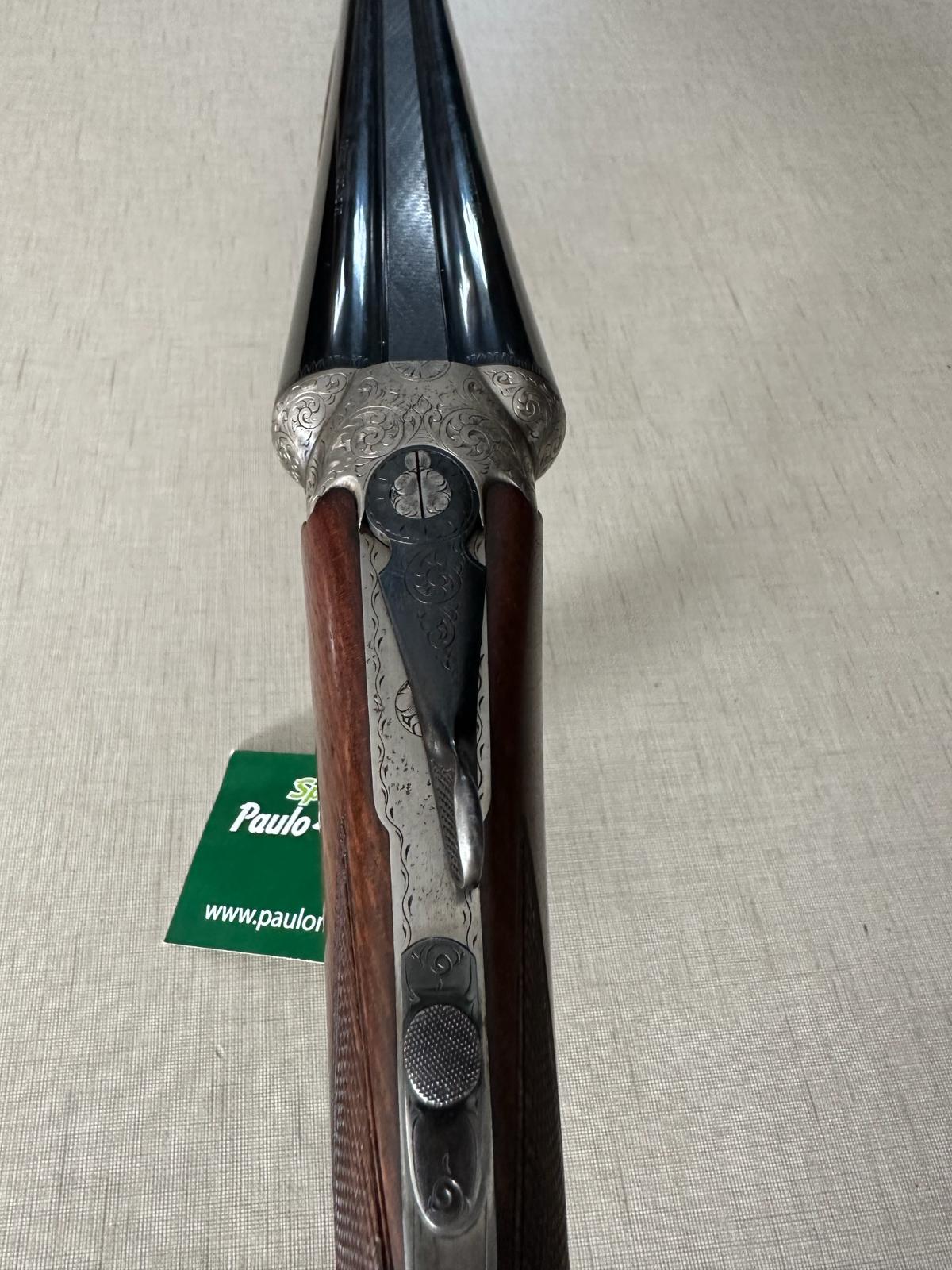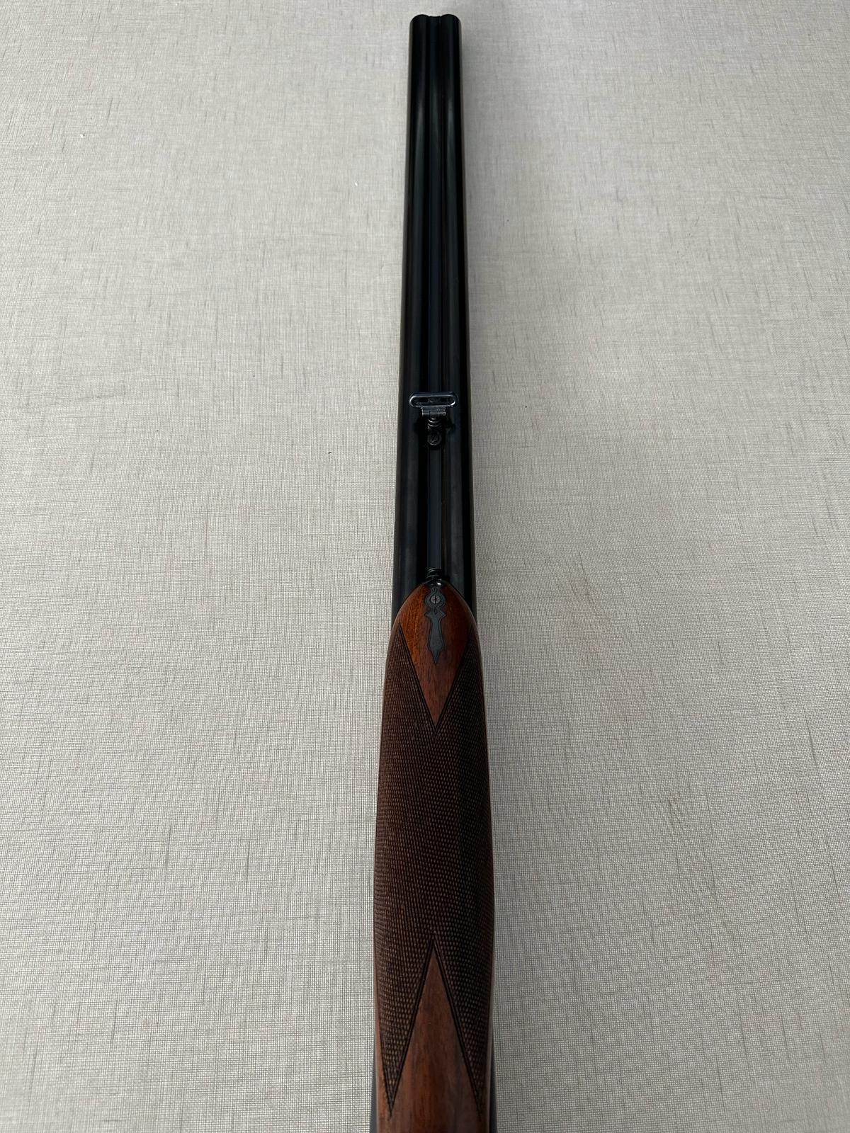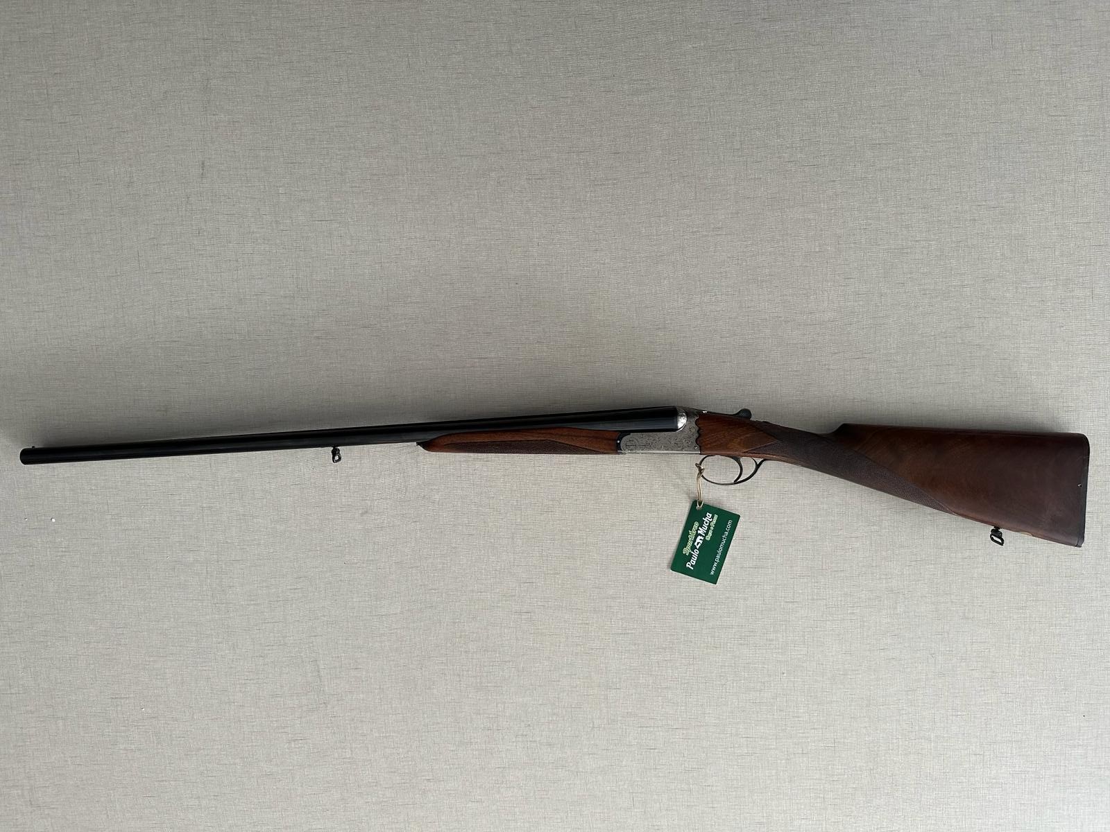 Espingarda de caça com canos duplos e punho em madeira sobre tecido bege