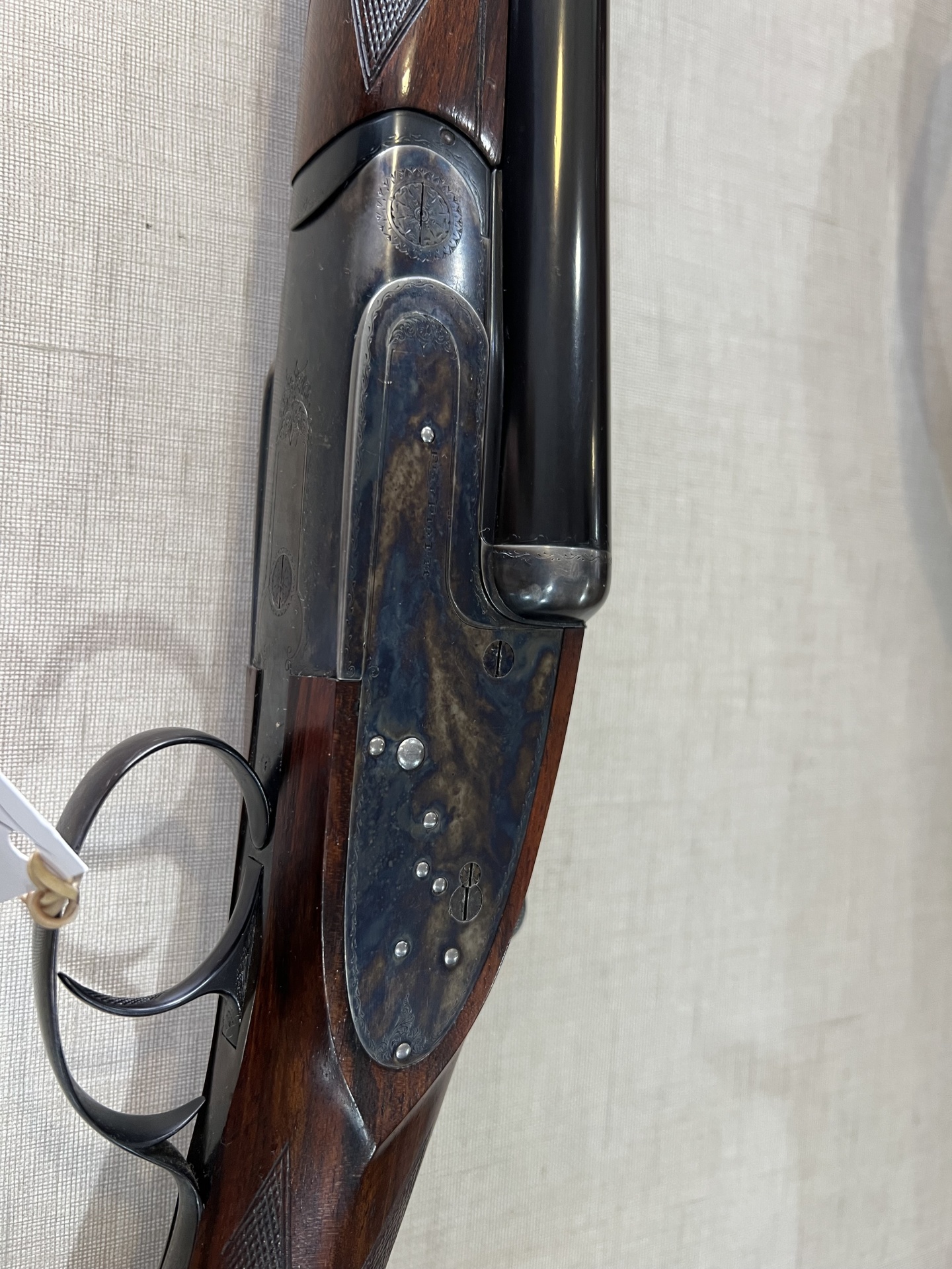 Espingarda com ação metal azulada e madeira escura, pendurada numa parede clara com etiqueta