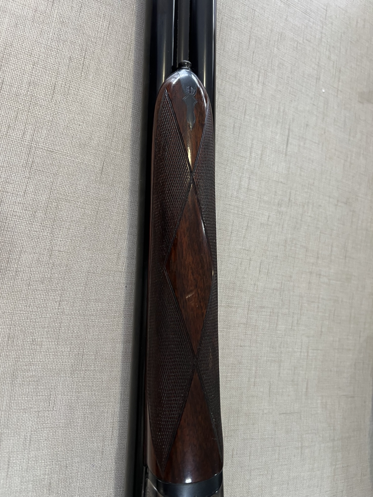 Escopeta com madeira escura e acabamento metálico azul em fundo bege