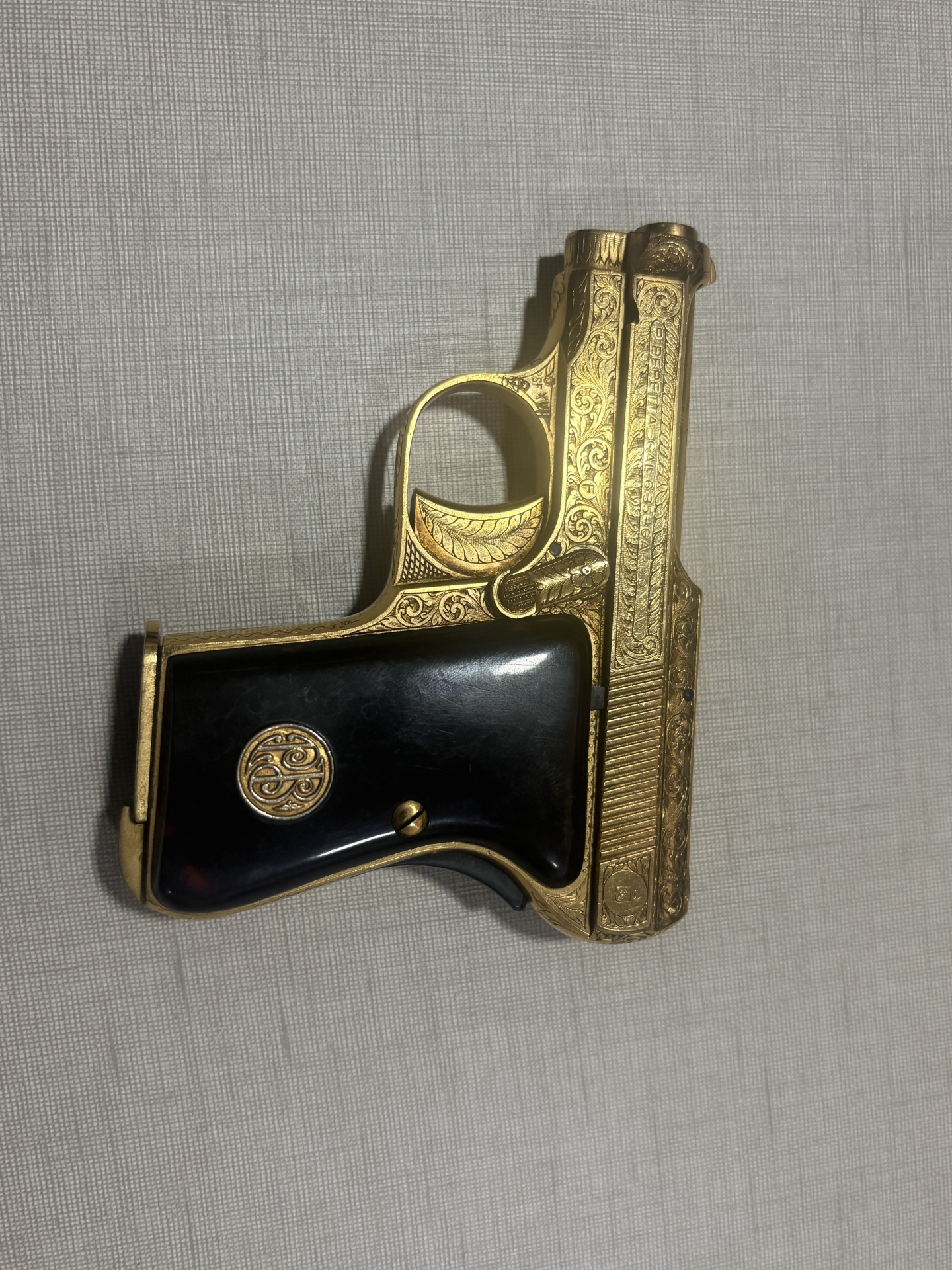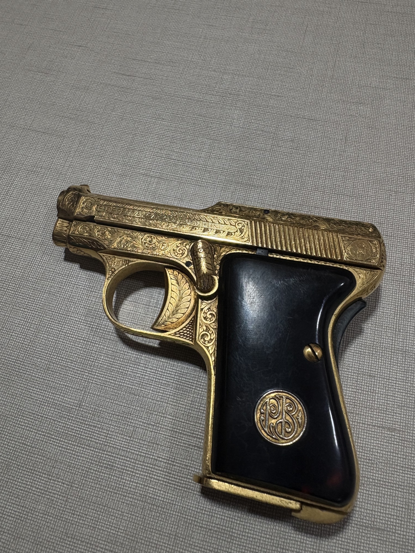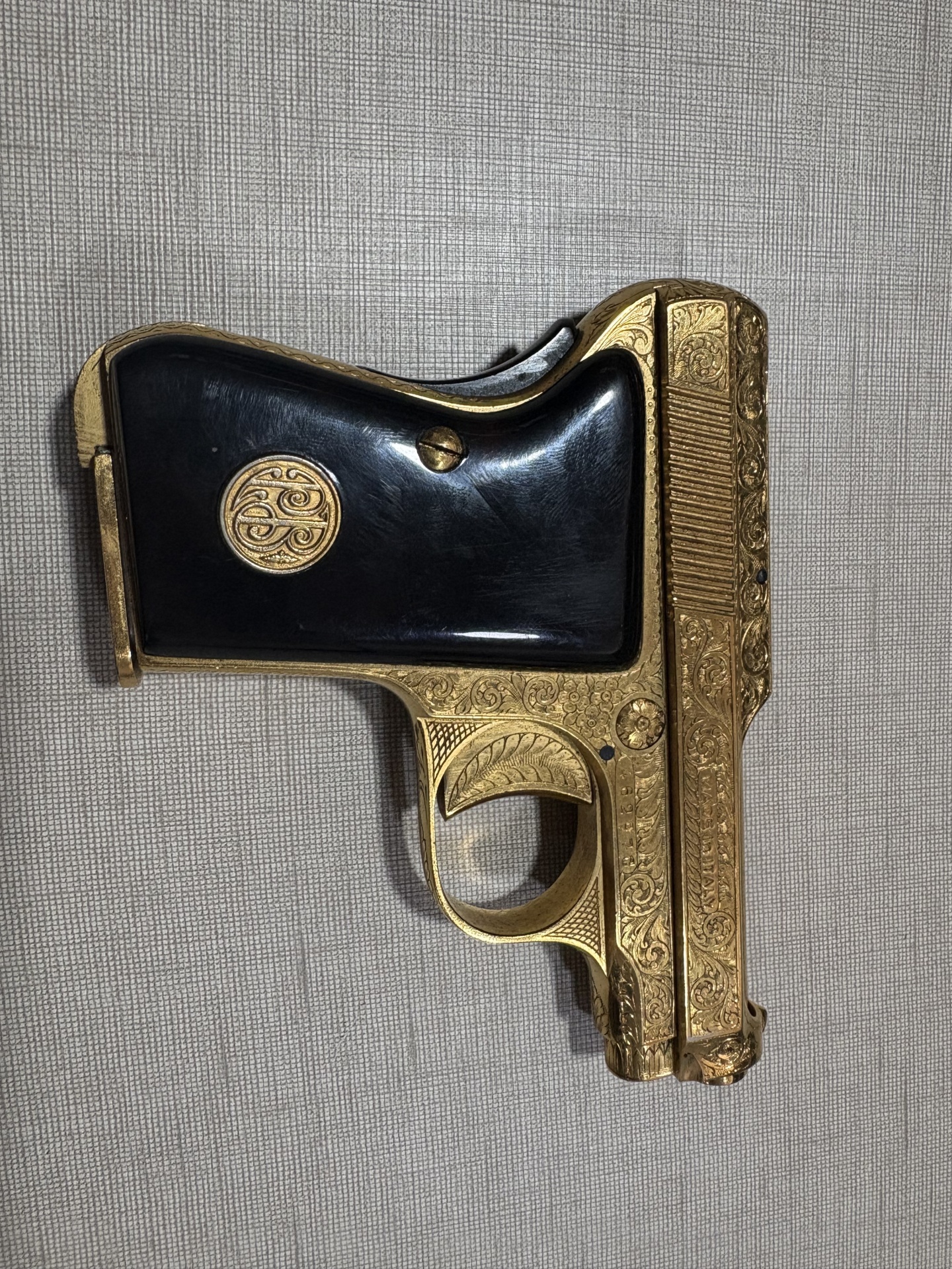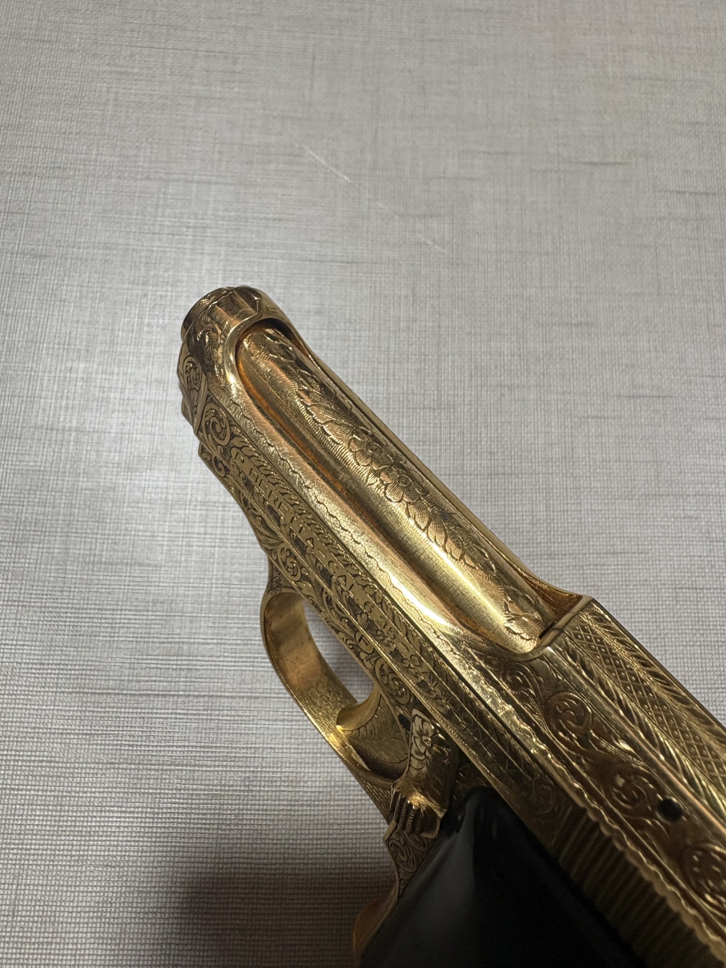 Pistola dourada com cabo preto e gravações decorativas sobre superfície cinzenta.