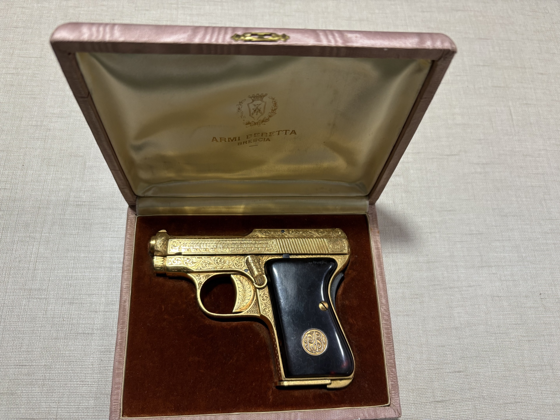 Pistola dourada gravada em estojo acolchoado creme e castanho