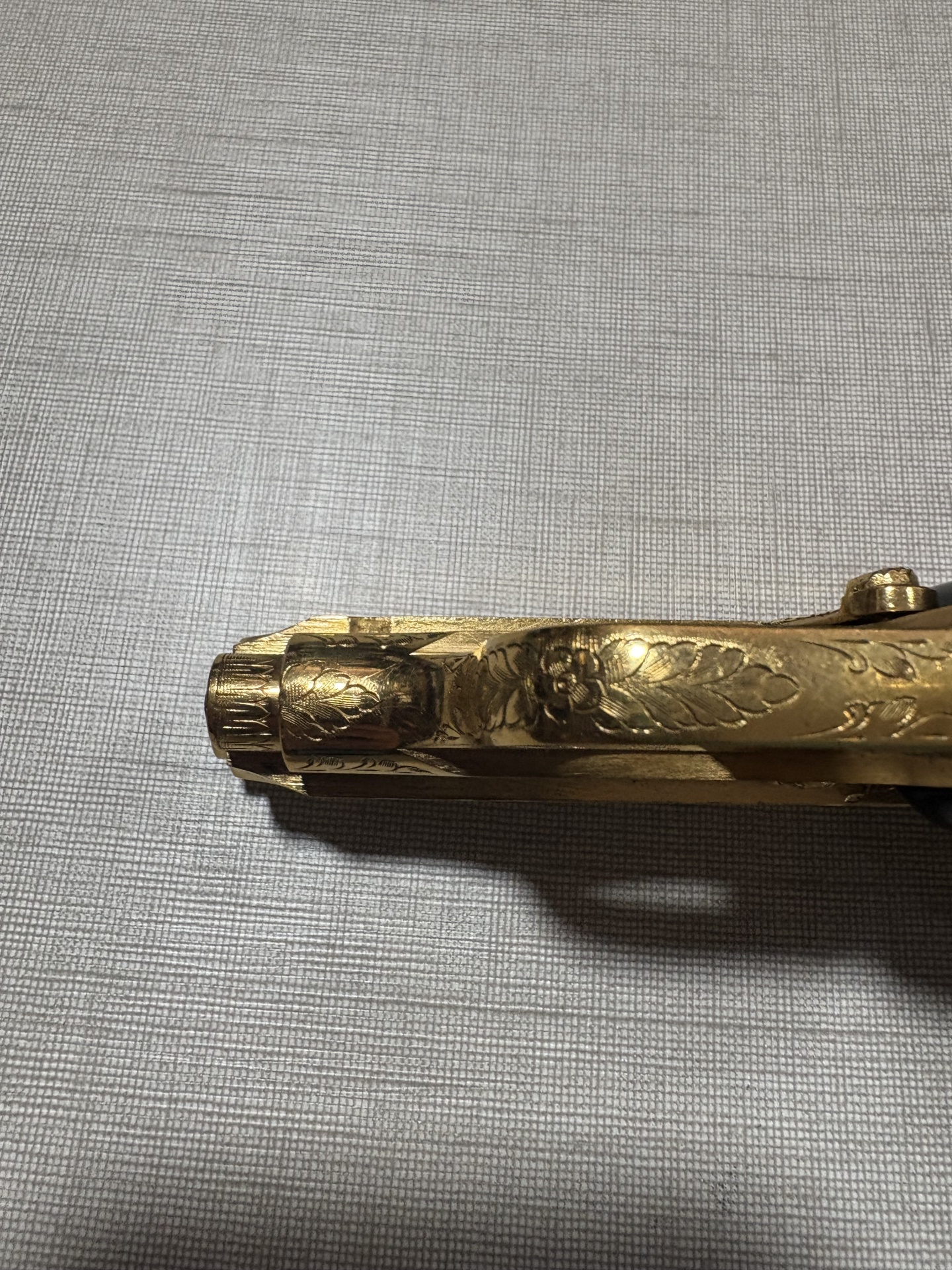 Detalhe da parte frontal de arma dourada decorativa com gravuras florais sobre superfície cinza