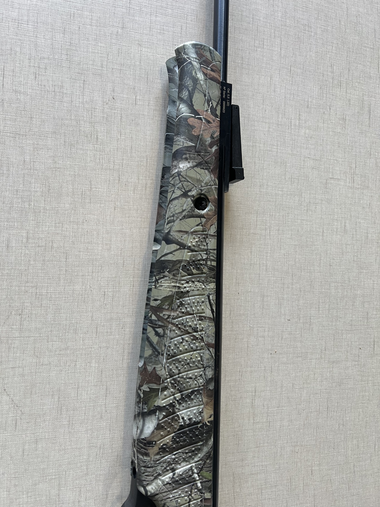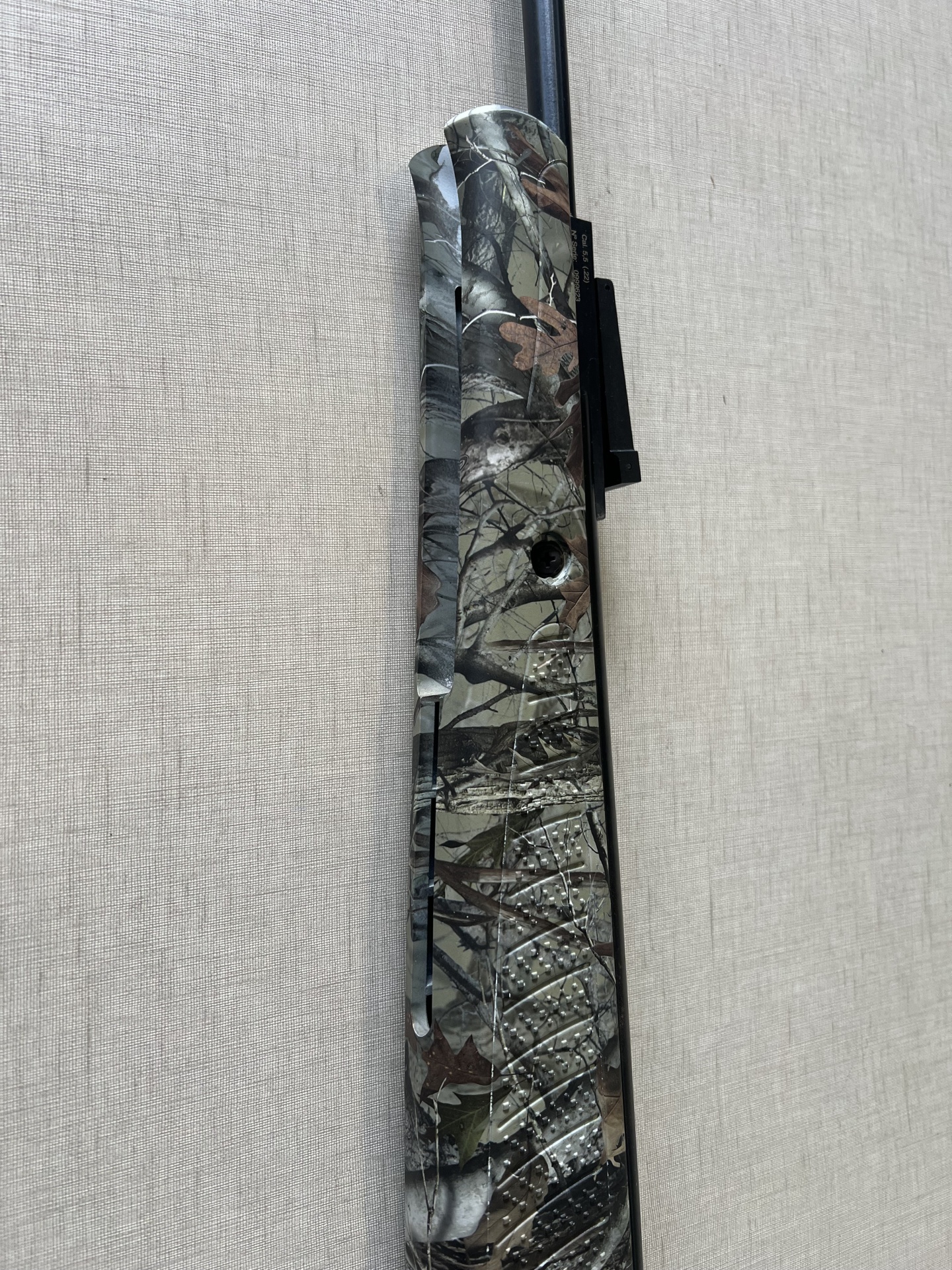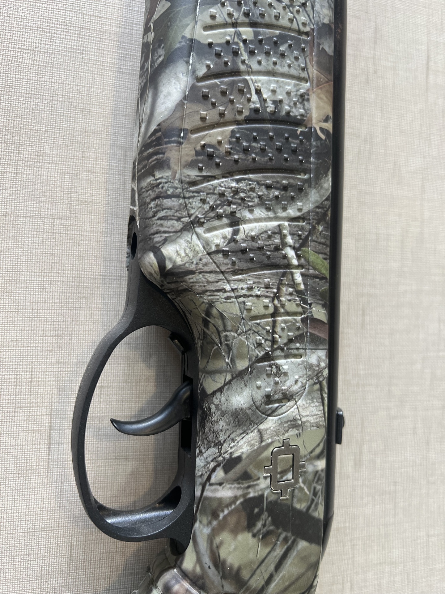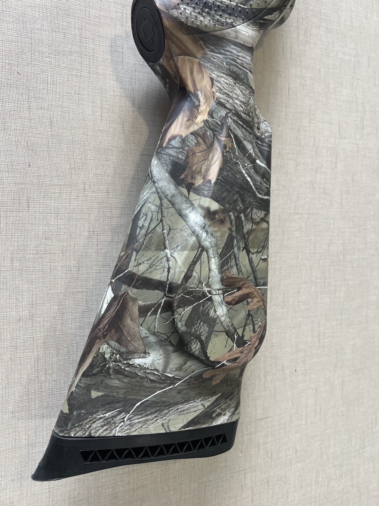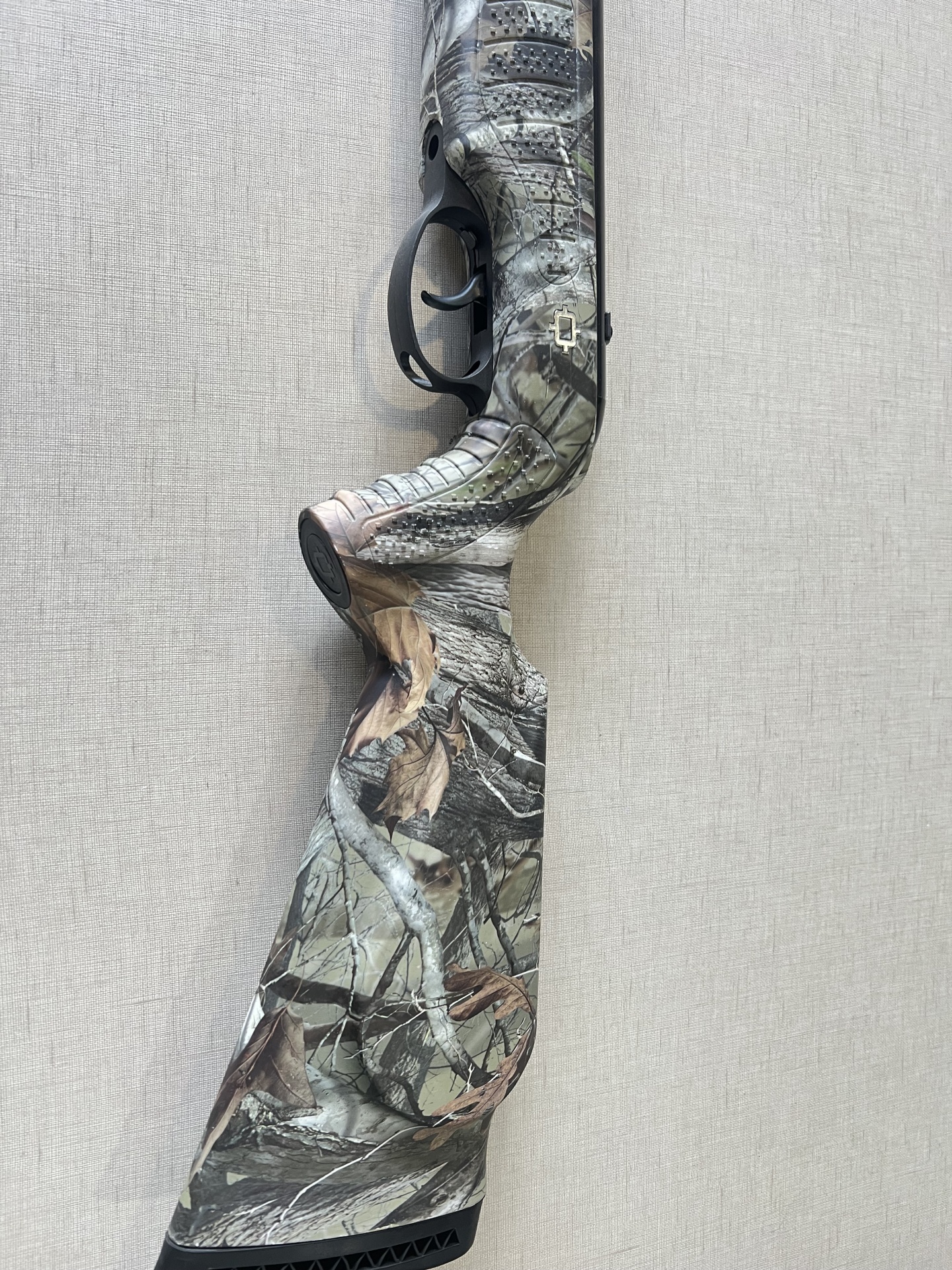 Espingarda camuflada com textura antiderrapante e gatilho preto