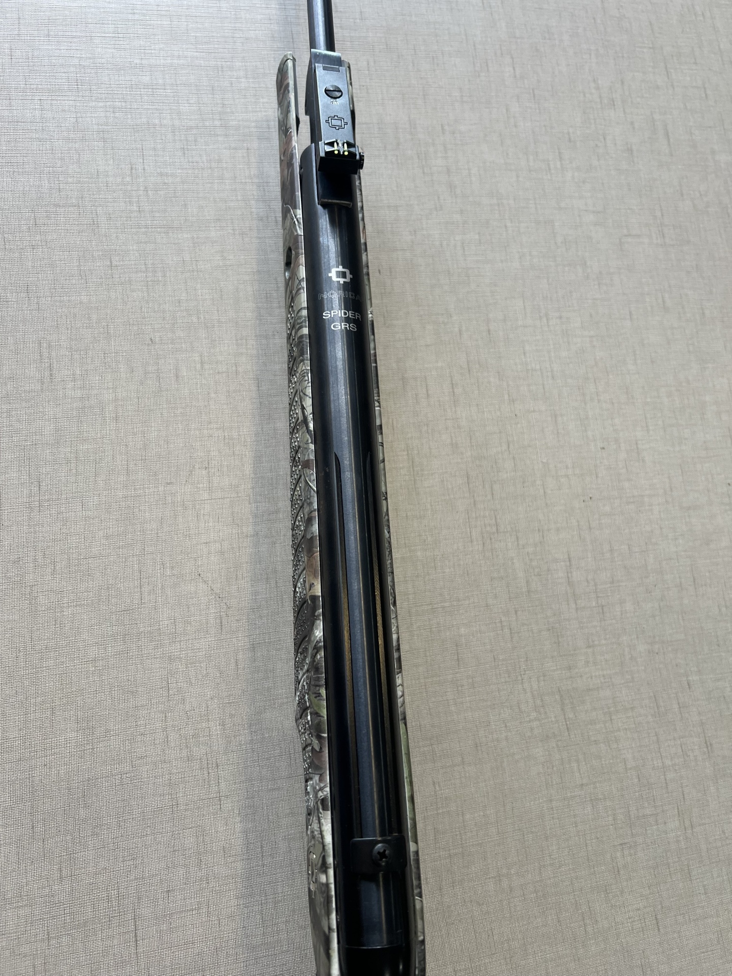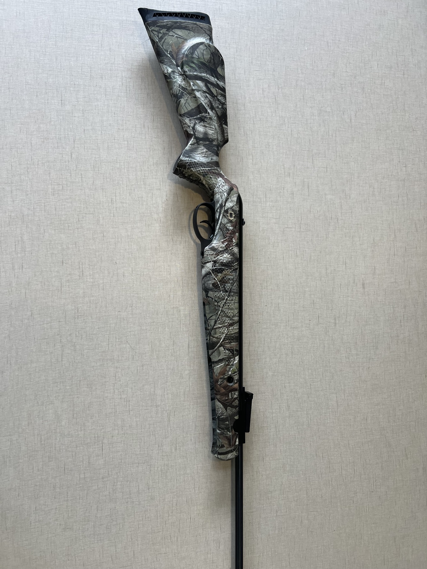 Espingarda de cano longo com acabamento preto e padrão de camuflagem no cabo sobre superfície bege
