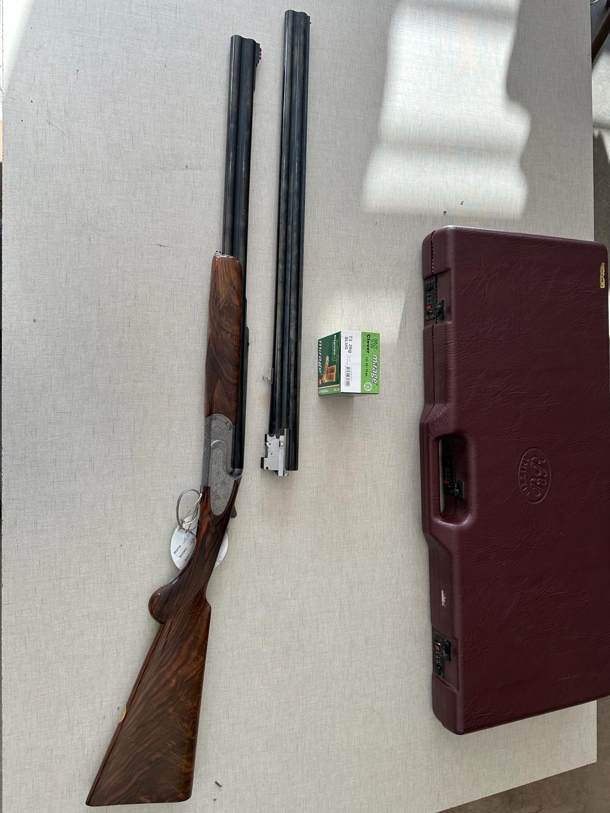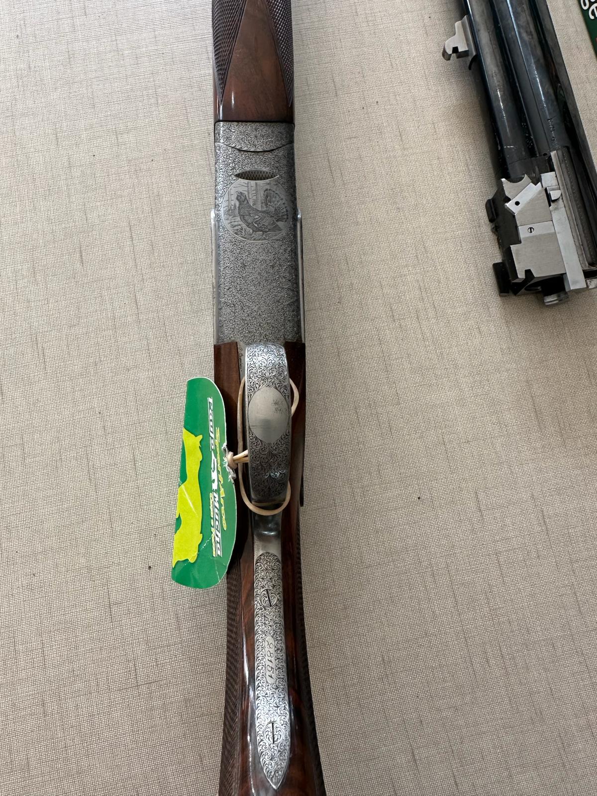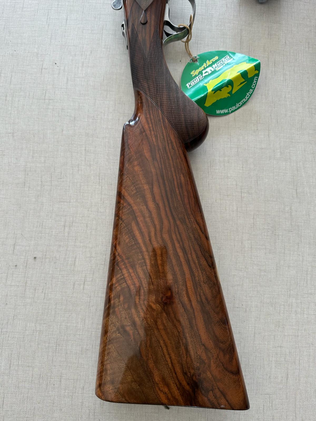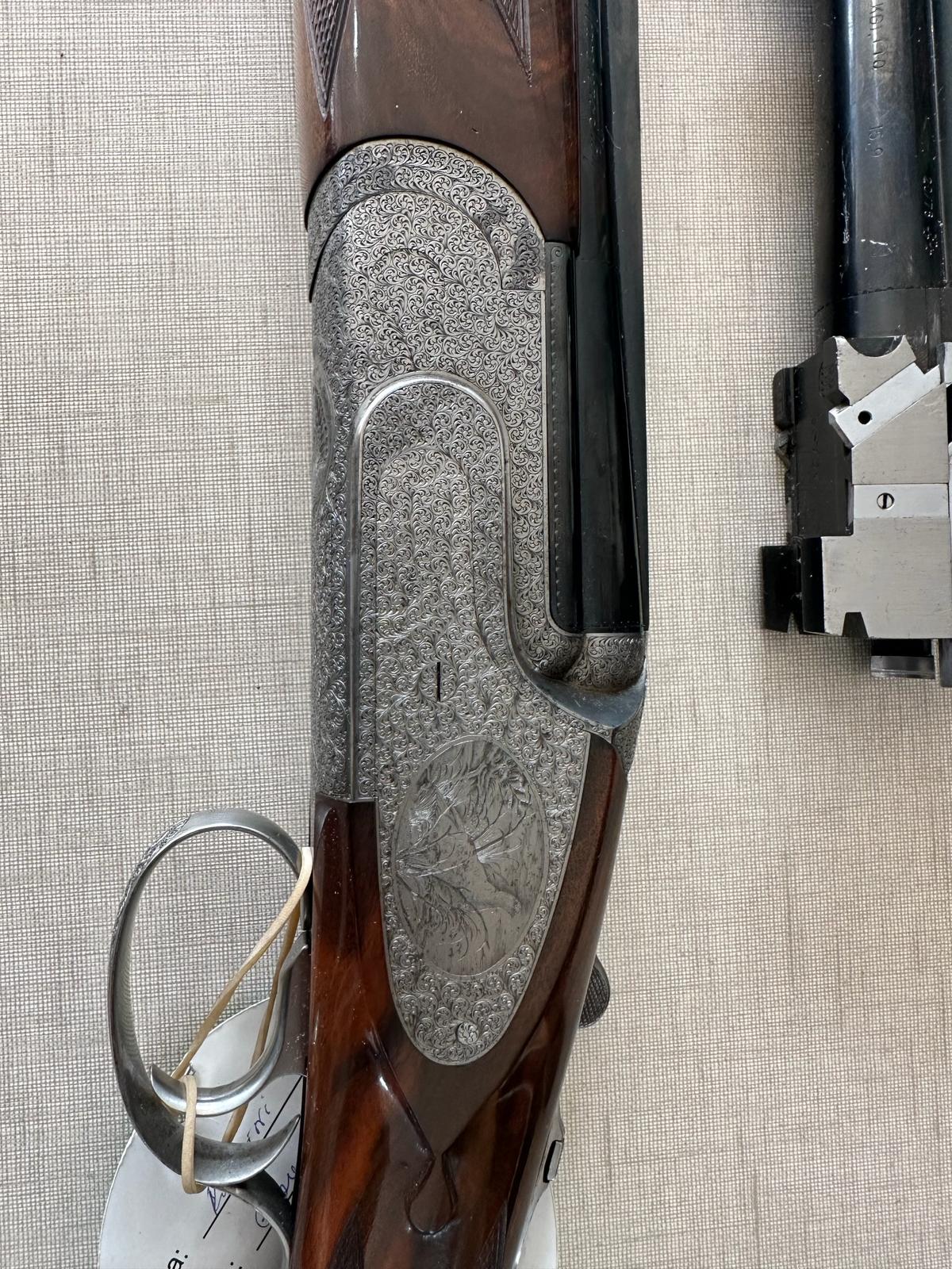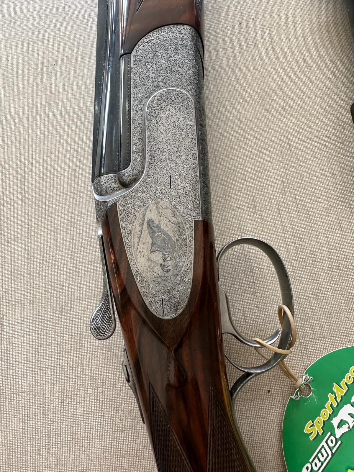 Espingarda de caça com madeira e metal gravado exibida sobre fundo claro com etiqueta