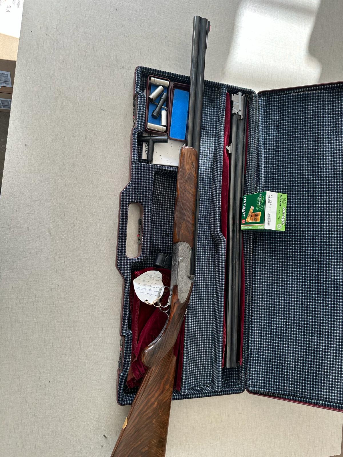 Rifle de caça com cano duplo em estojo com acessórios sobre mesa clara.