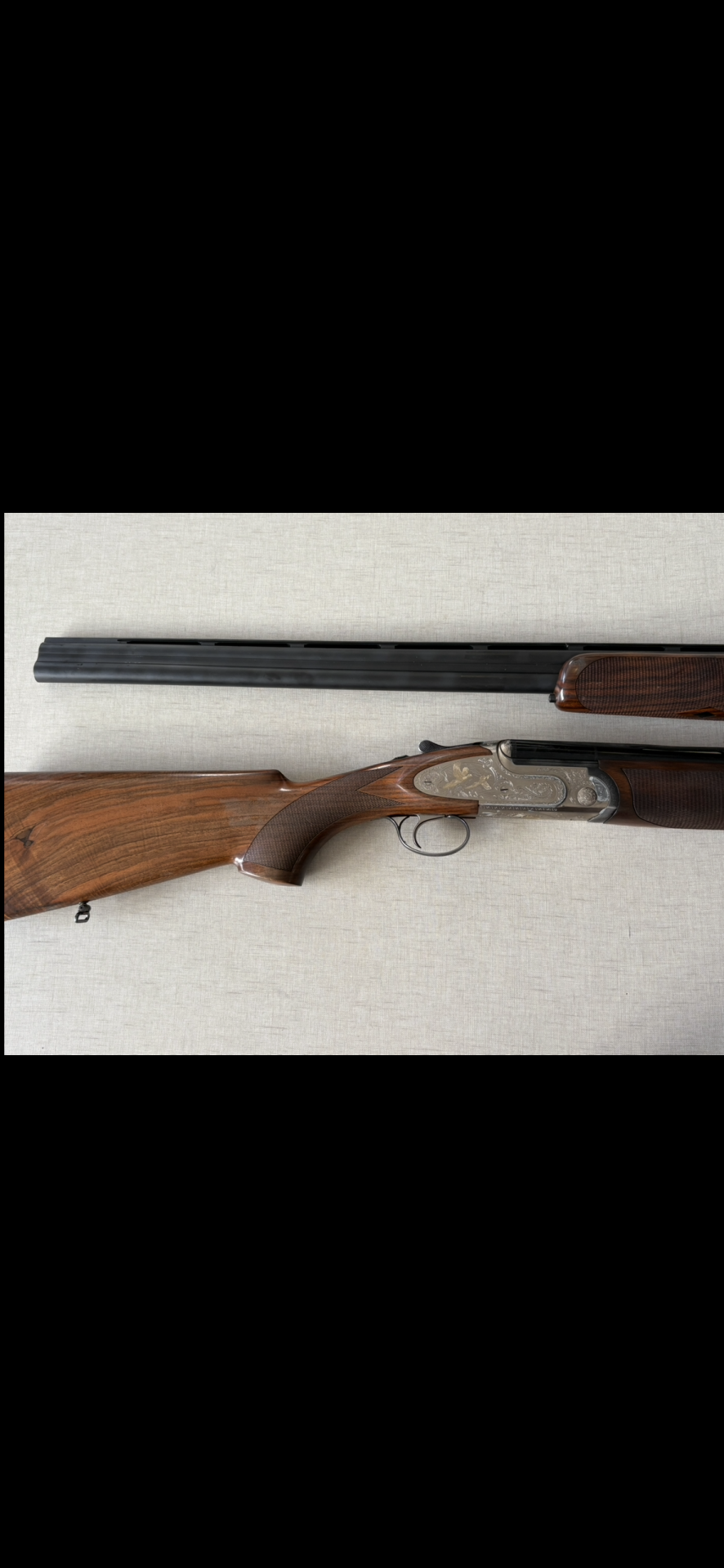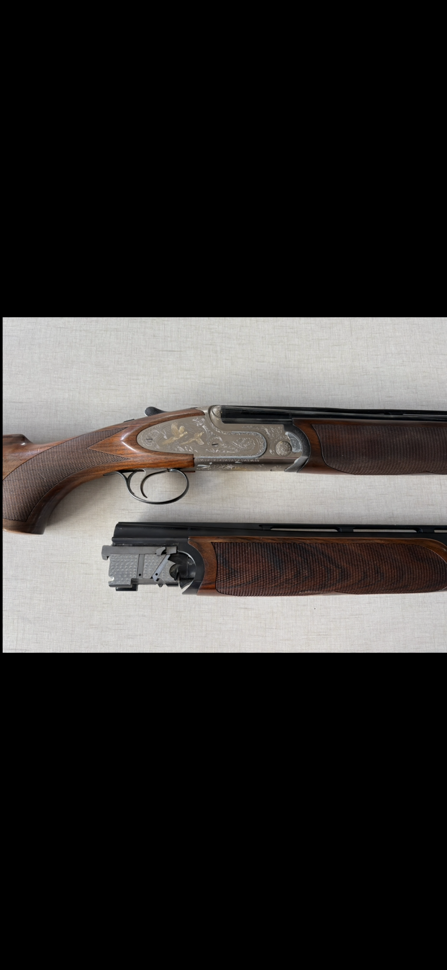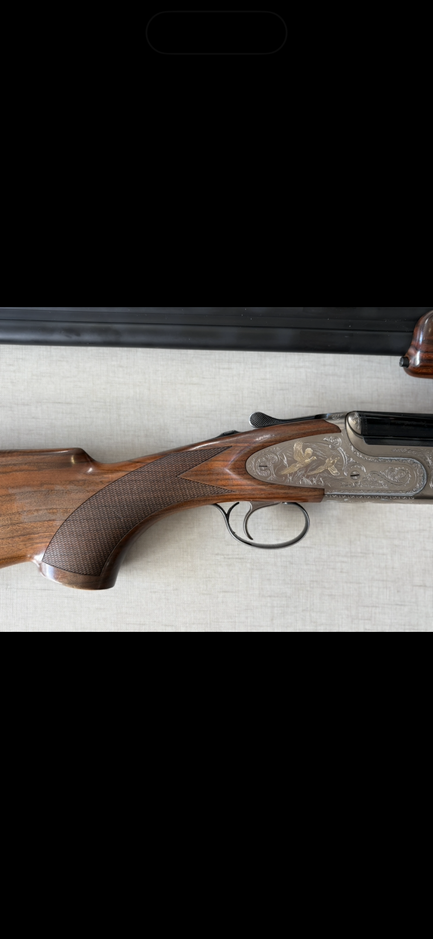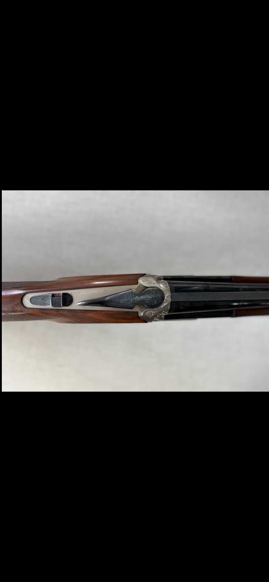 Espingarda com armação prateada gravada e madeira castanha vista de cima.