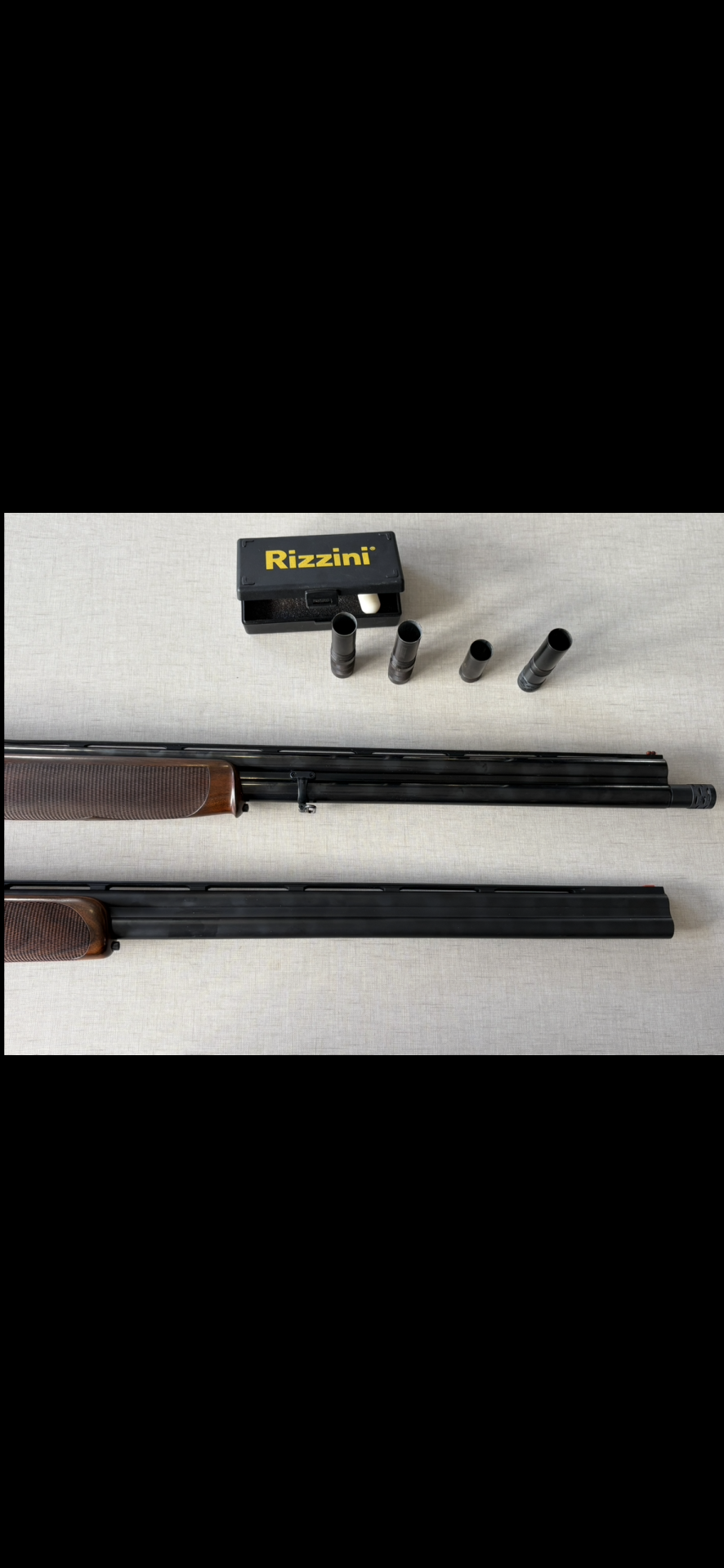 Espingarda com coronha em madeira polida, caixa preta com o texto Rizzini e quatro tubetes metálicos.
