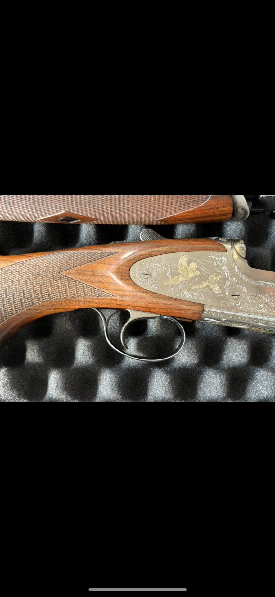 Espingarda de caçadeira com detalhes em madeira e metal gravado em estojo acolchoado