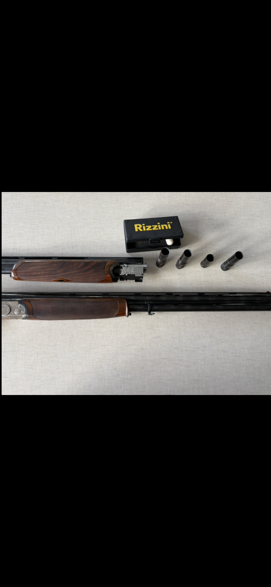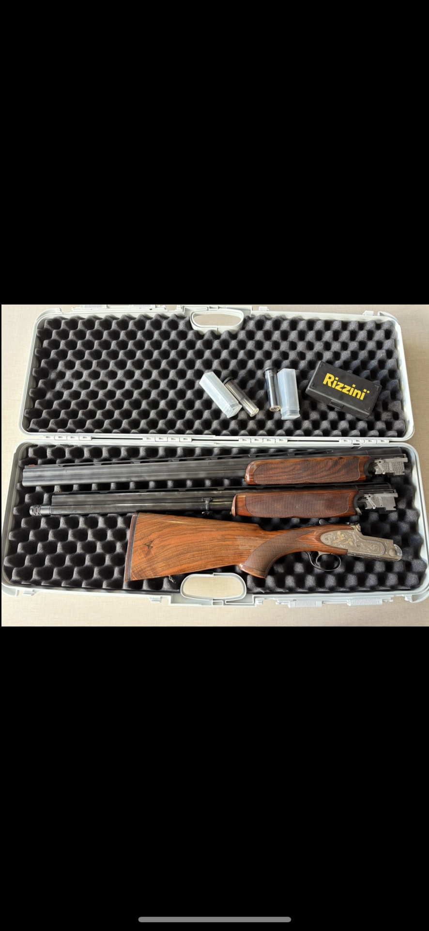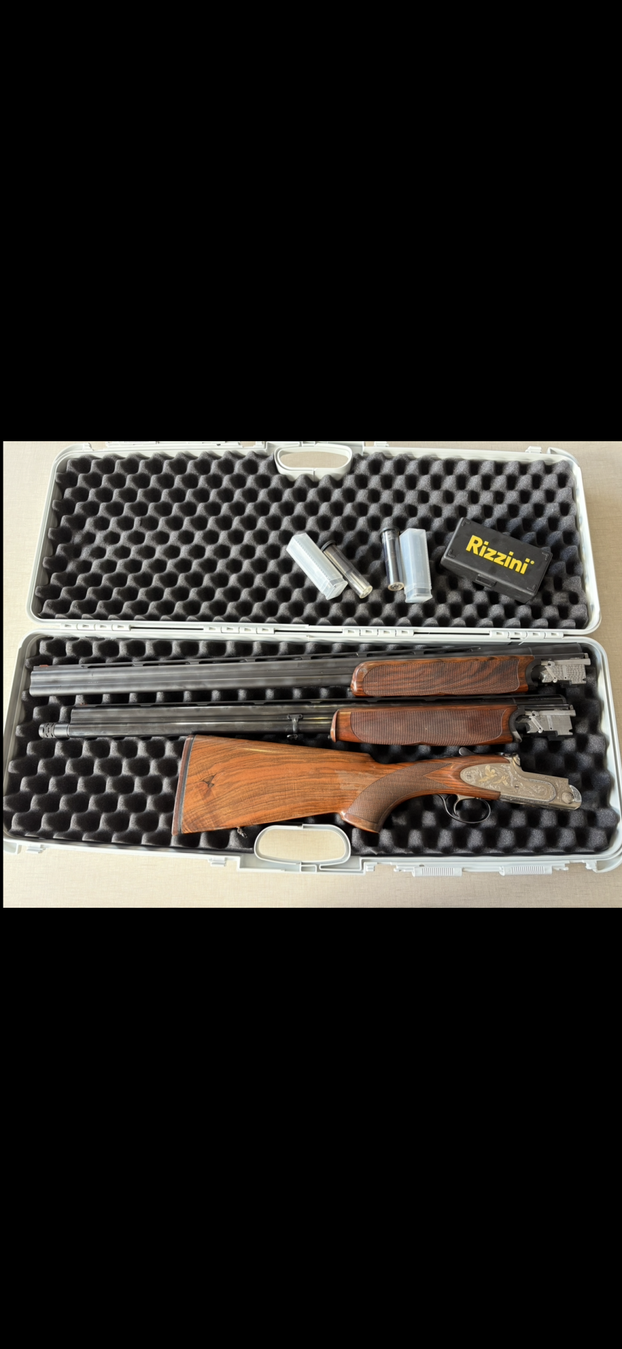 Estojo com duas espingardas, cartuchos e caixa 'Rizzini', interior acolchoado preto