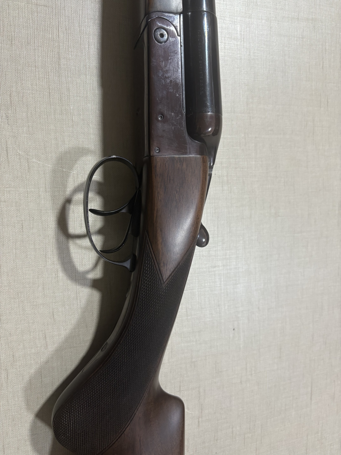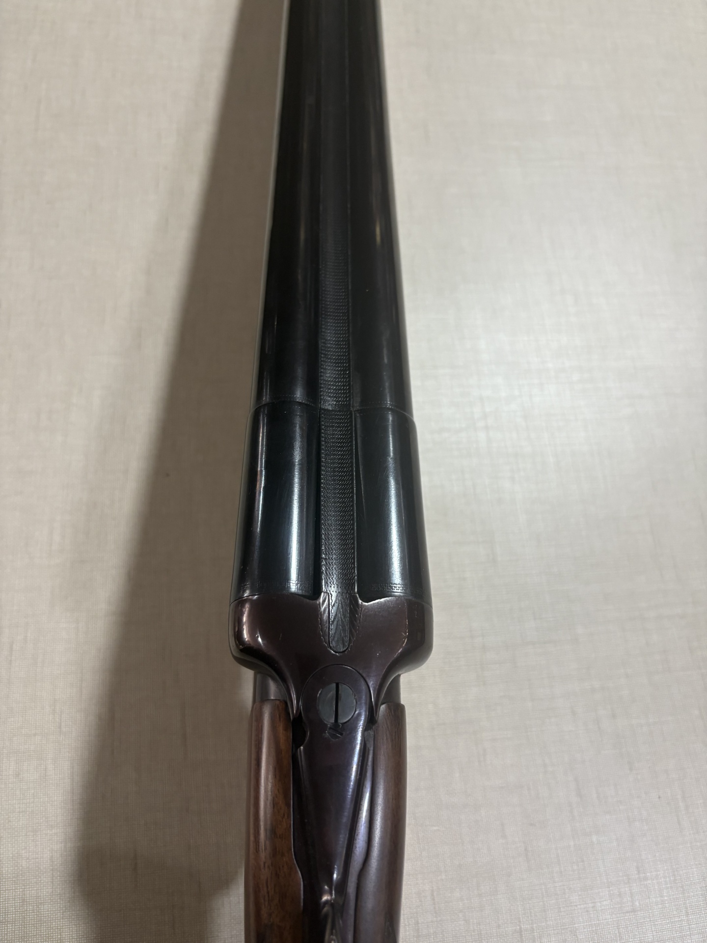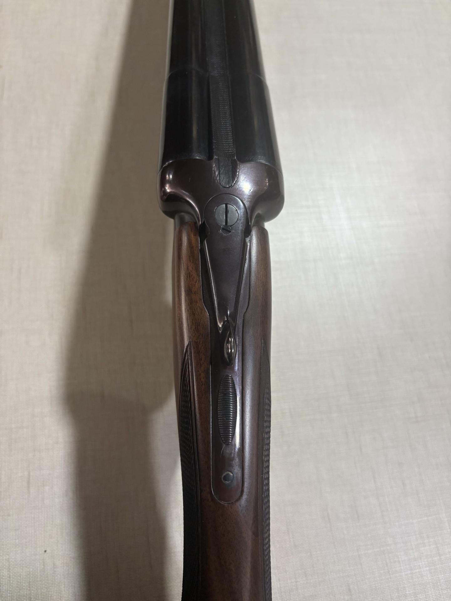 Espingarda de canos paralelos com coronha em madeira castanha e metal escuro vista de cima
