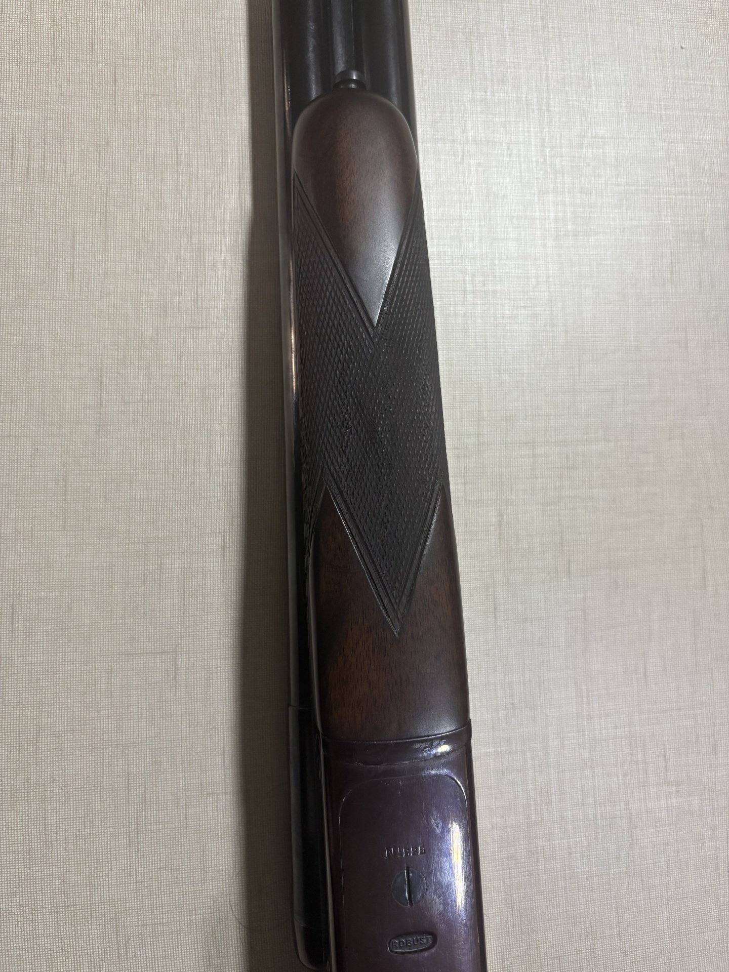 Espingarda de madeira escura com detalhes em metal e textura quadriculada