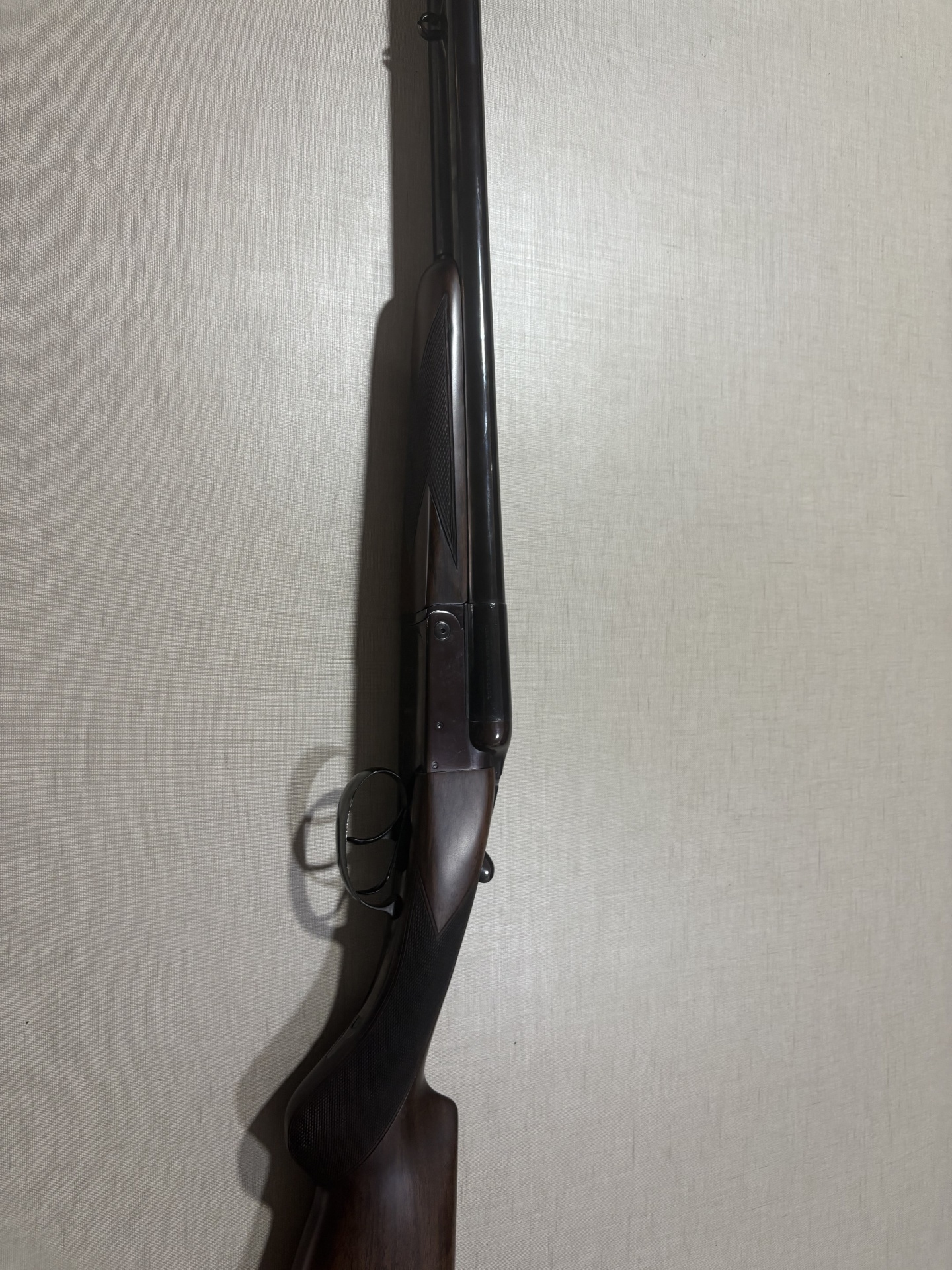 Espingarda de canos duplos paralelos com empunhadura de madeira e canos de metal negro