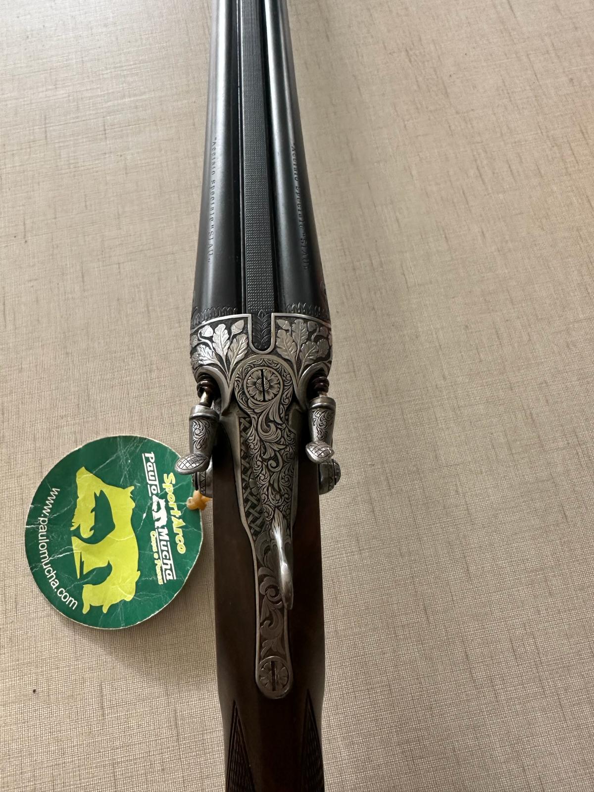 Espingarda dupla com gravações em metal e madeira, etiqueta verde com texto e logo amarelo