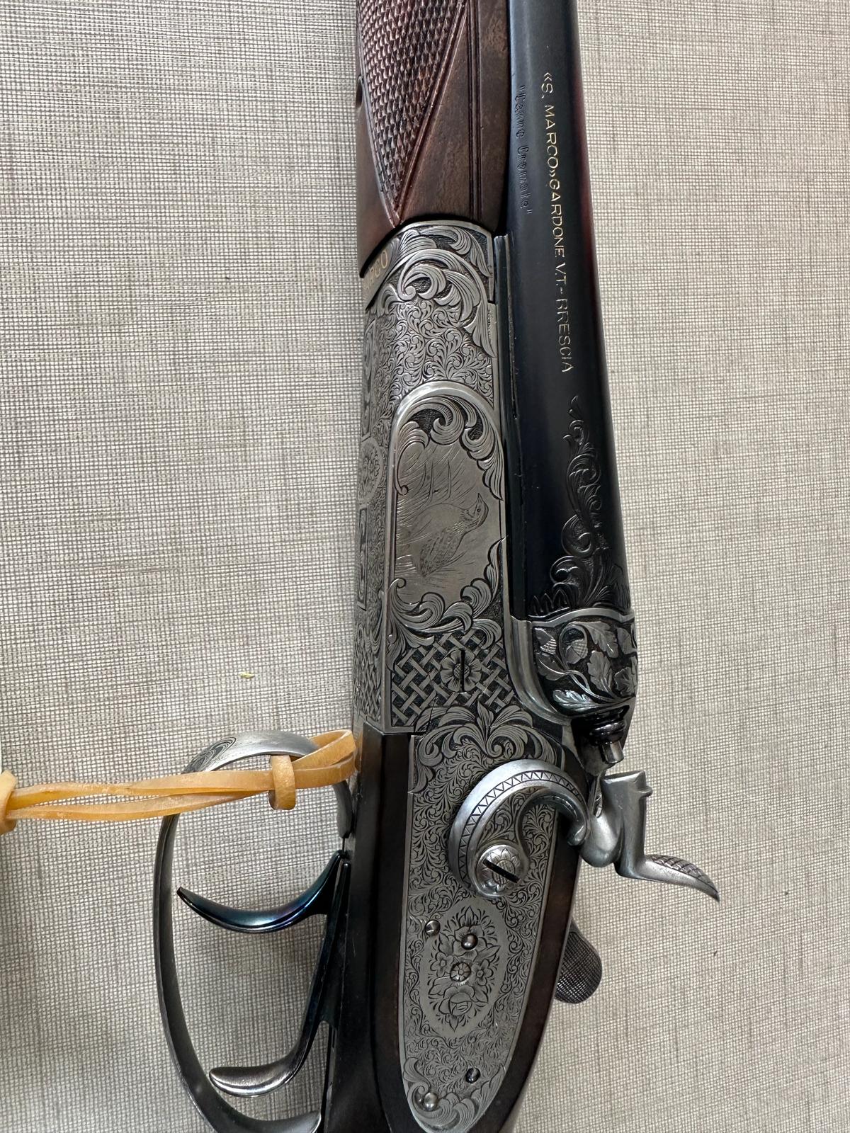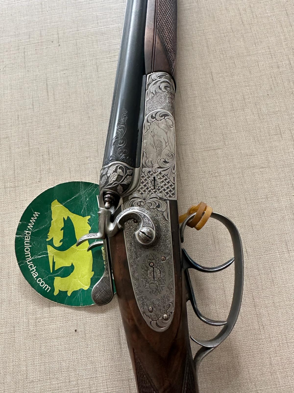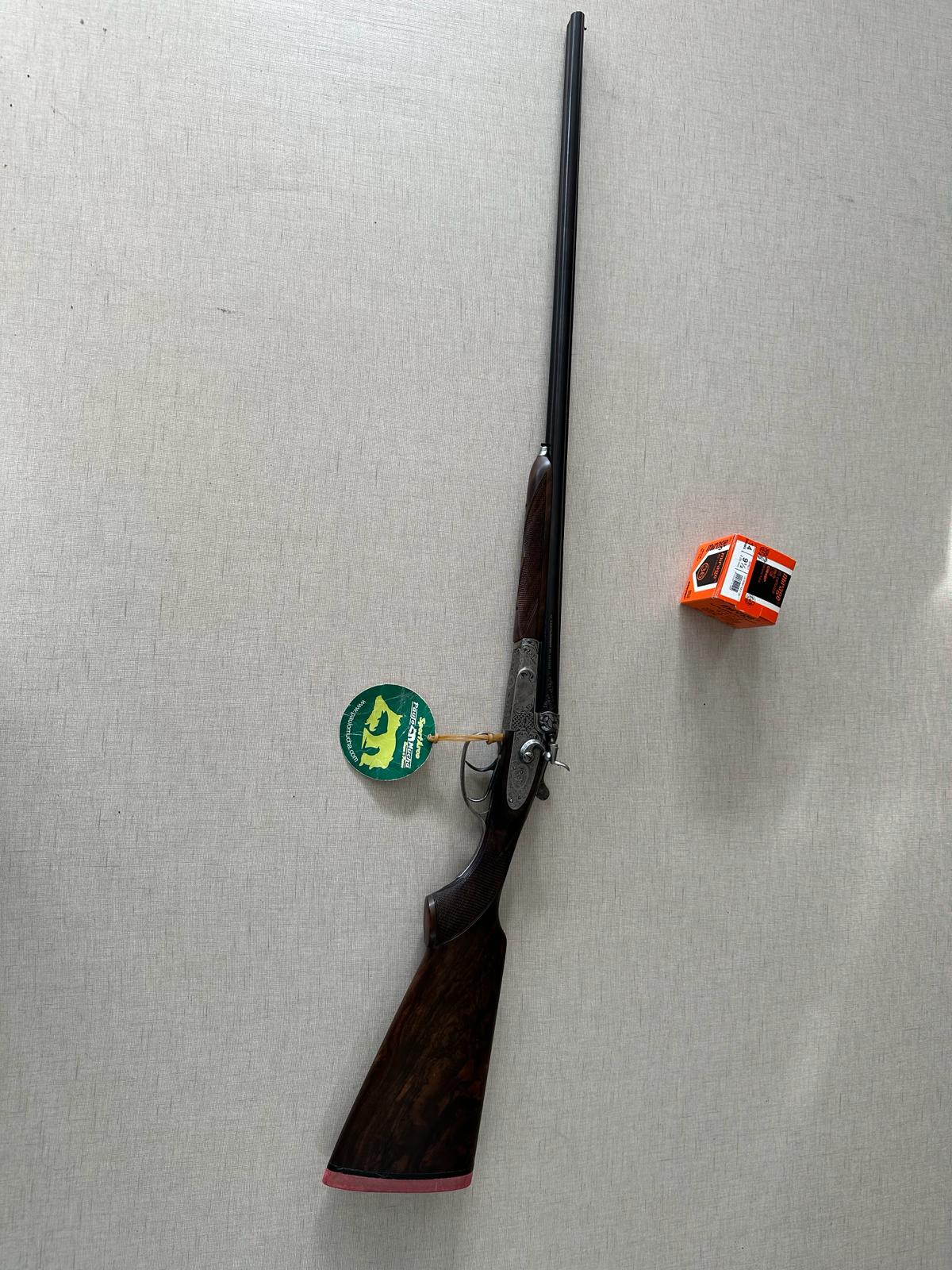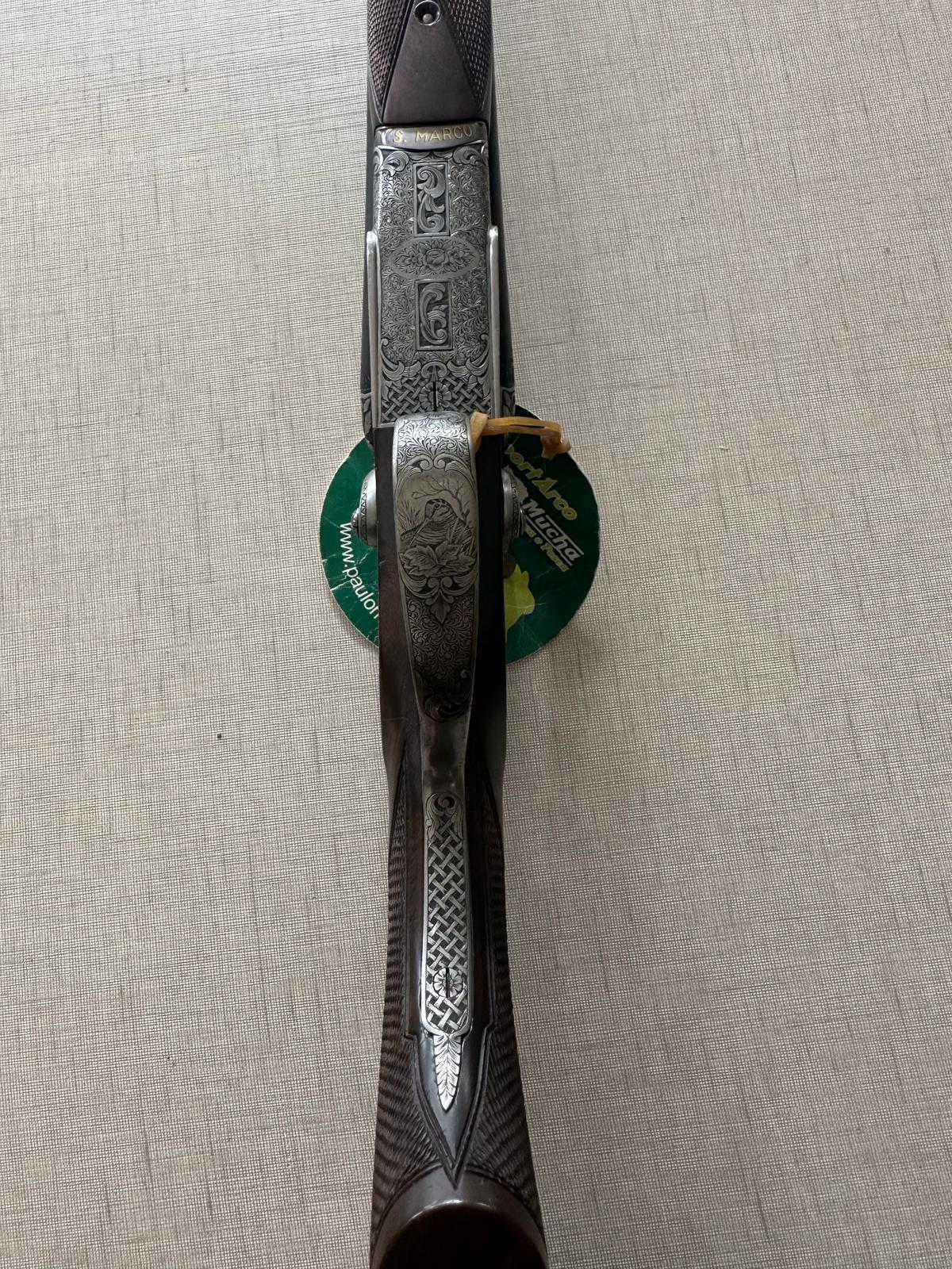 Espingarda de canos duplos com detalhes gravados e etiqueta verde